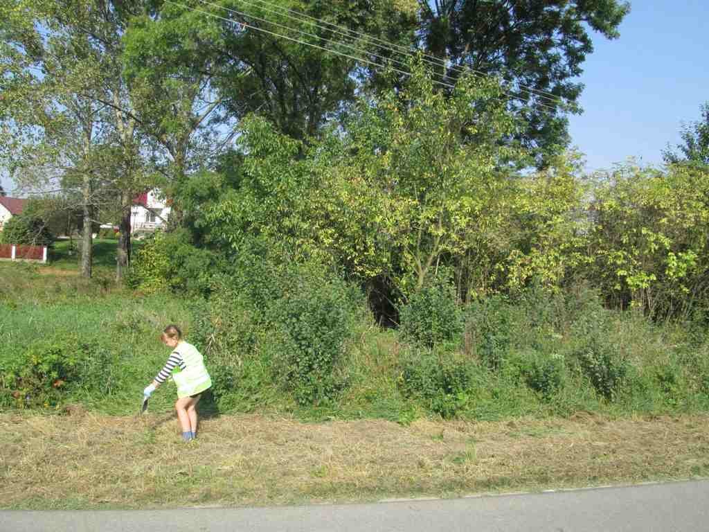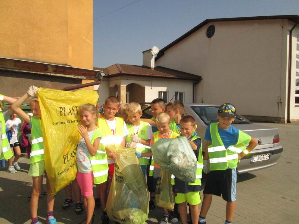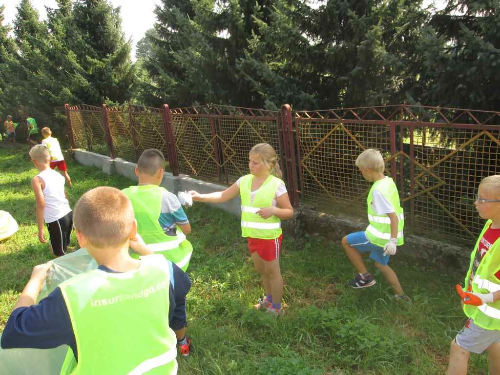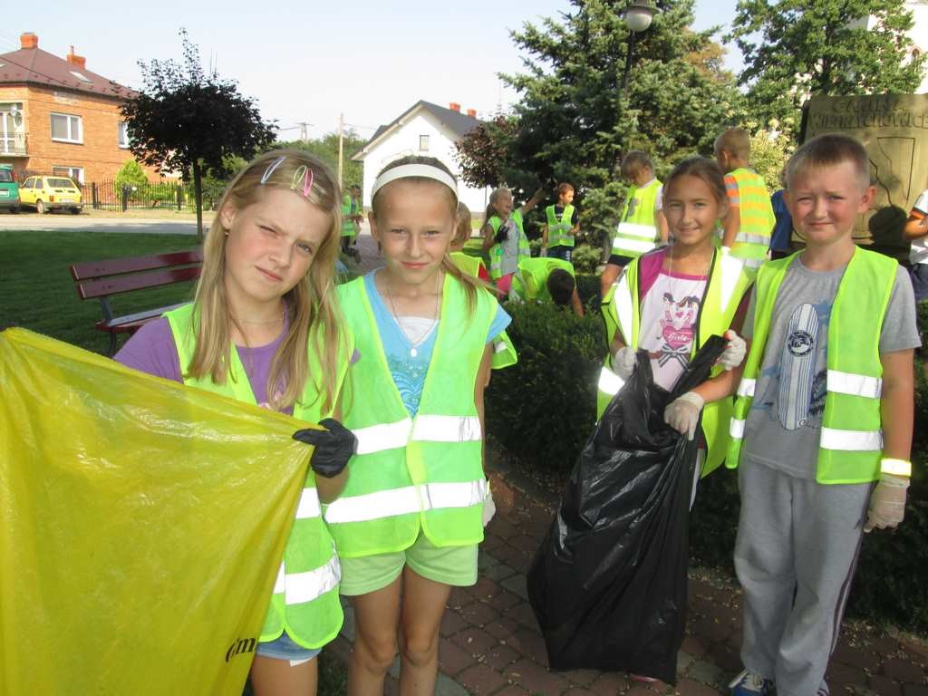 Dzieci sprzątając teren dbały o środowisko, ale i o własne zdrowie – przez unikanie zagrożeń – czego wyznacznikiem były kamizelki odblaskowe.
