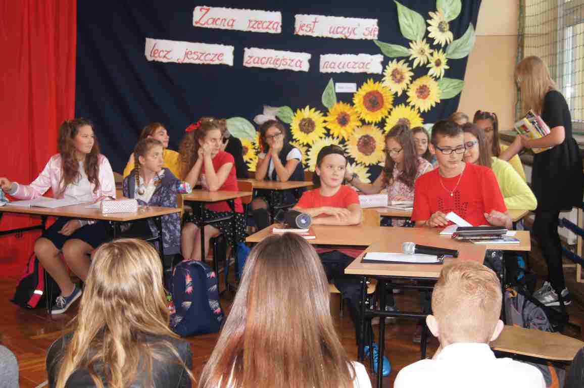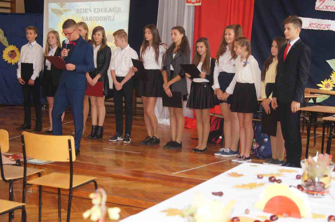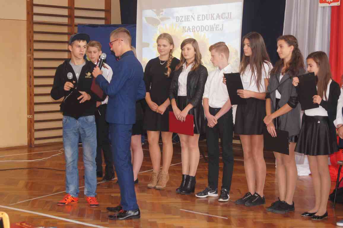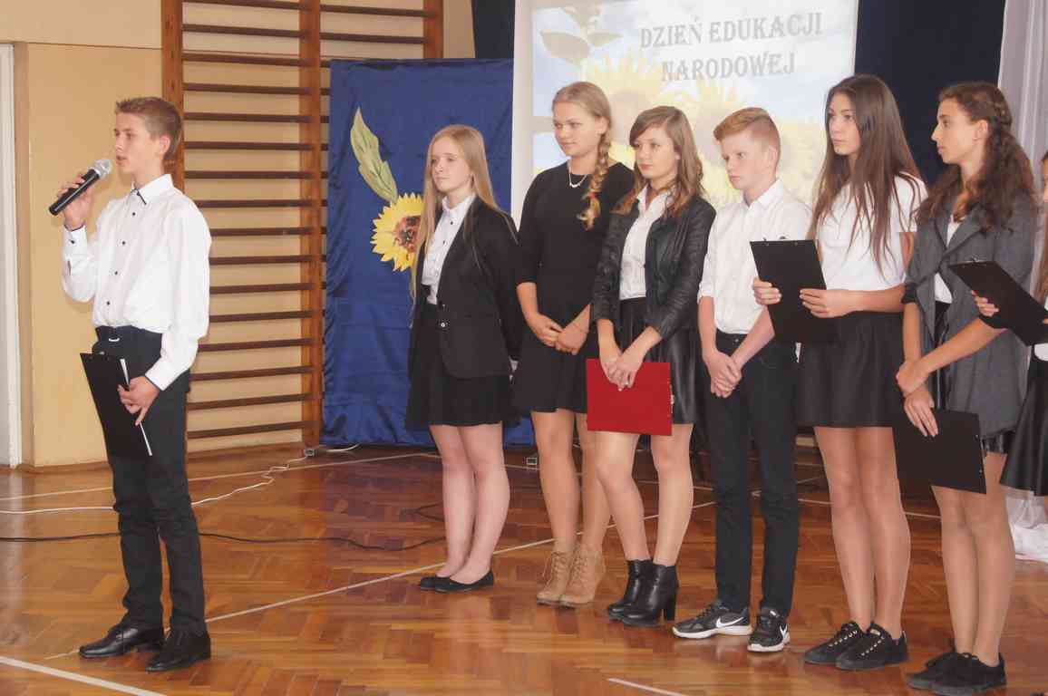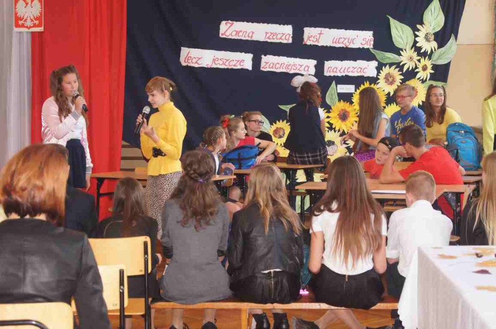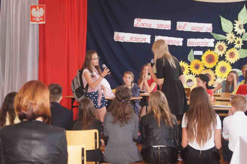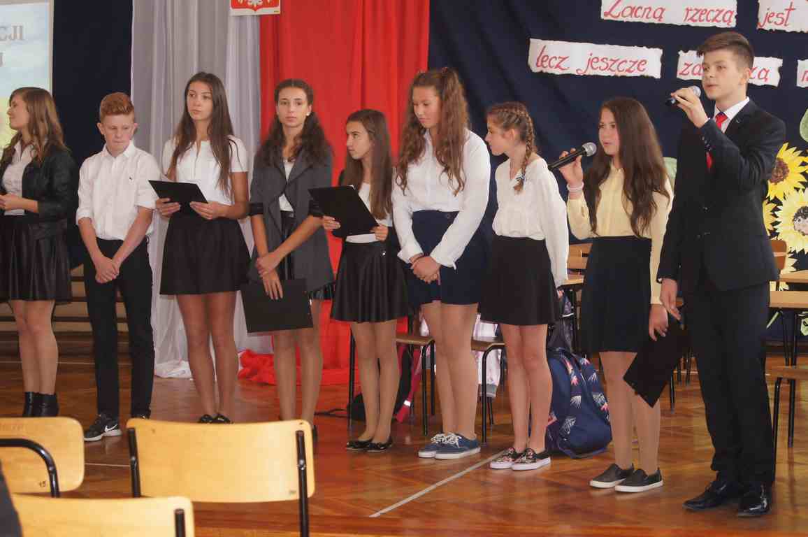 W kolejnej części uroczystości zebrani obejrzeli montaż słowno muzyczny przeplatany scenkami humorystycznymi z życia szkoły przygotowany na tę okazję przez gimnazjalną młodzież pod kierunkiem p. Moniki Bochenek – Król, p. Marzeny Lis i p. Anny Sochy.