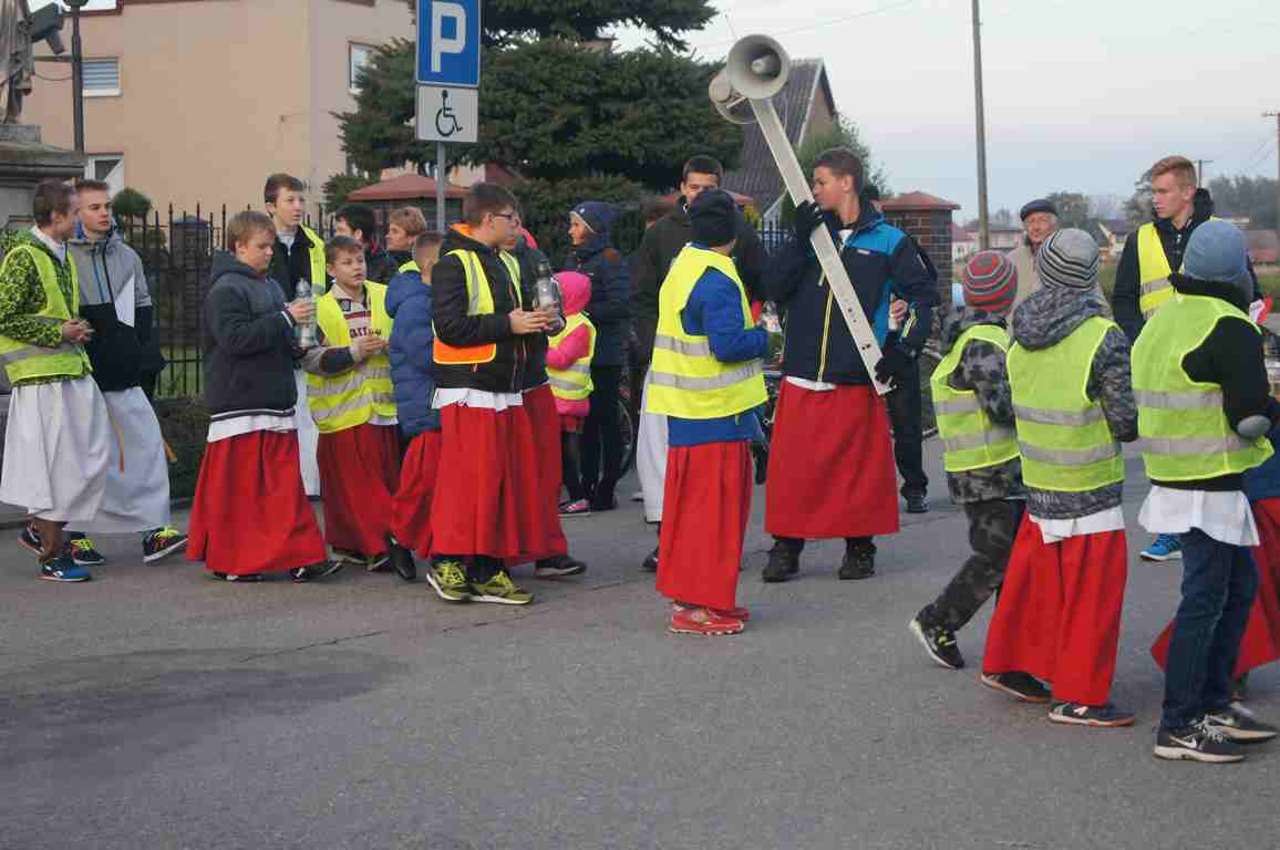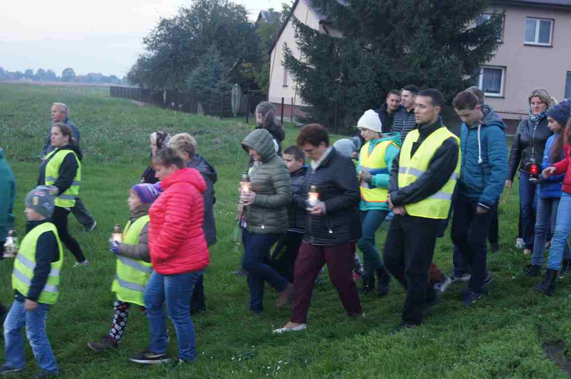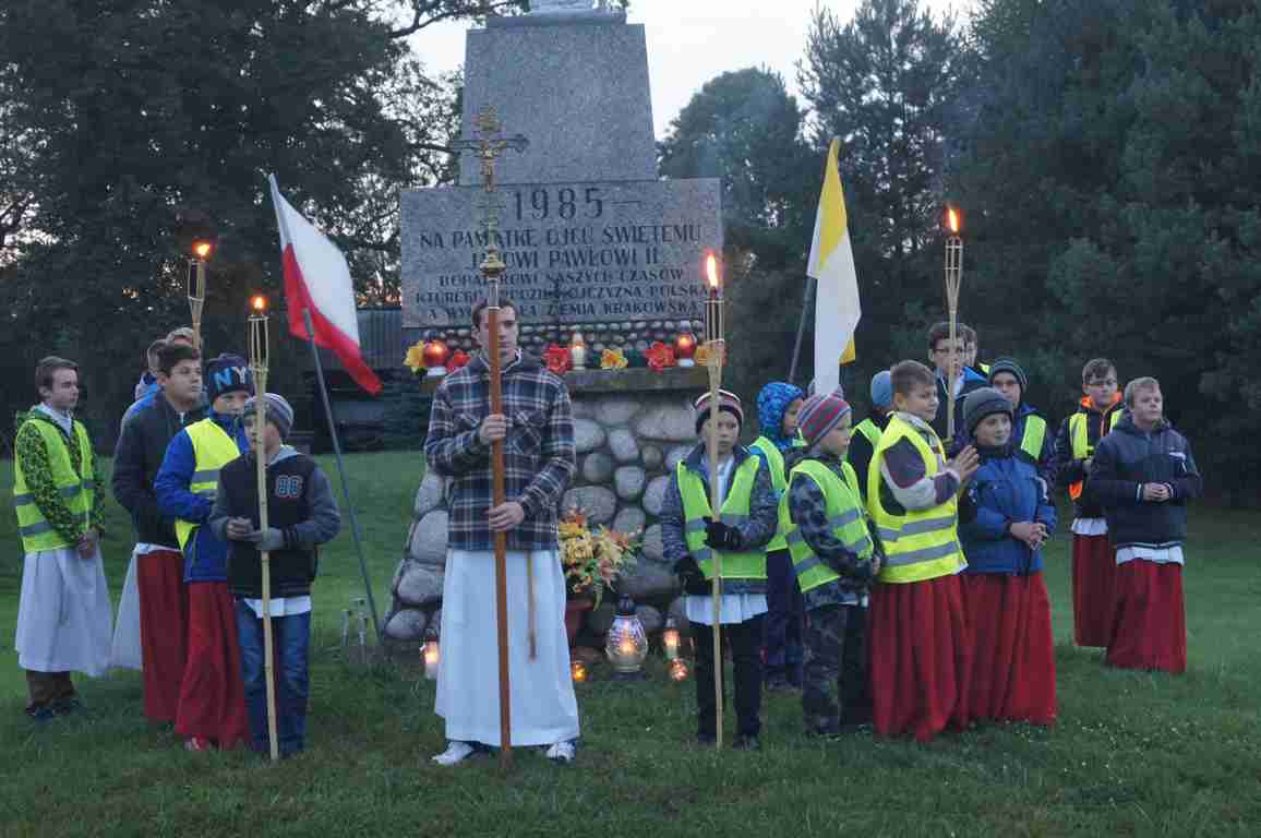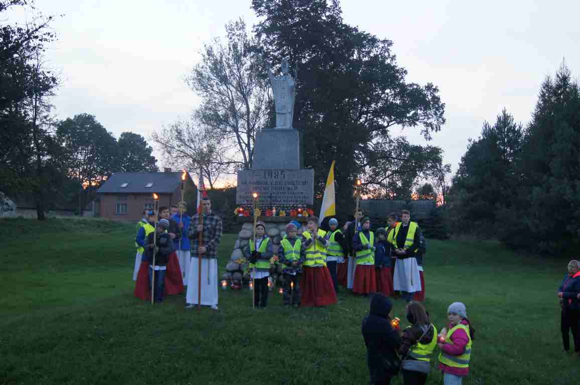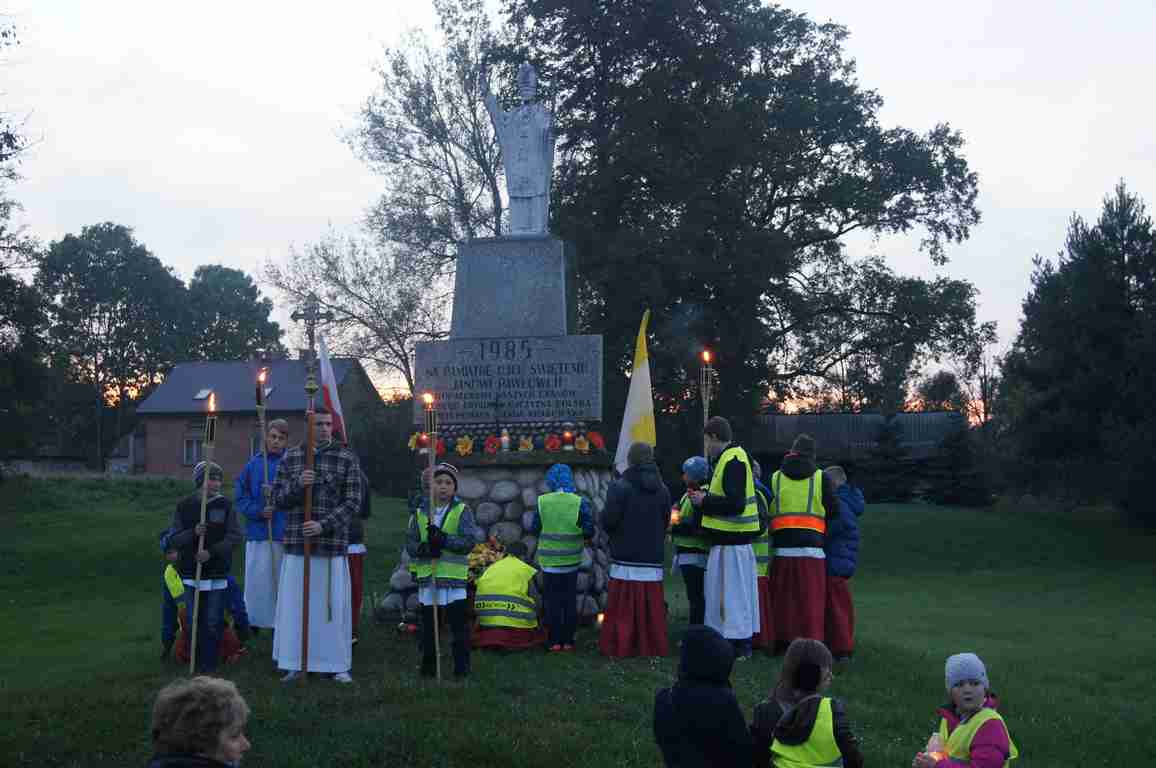 14 października, zaraz po popołudniowej mszy świętej nauczyciele, uczniowie oraz liczna rzesza mieszkańców gminy wybrała się pod pomnik świętego Jana Pawła II, by uczcić rocznicę wyboru Karola Wojtyły na Papieża, a w modlitwie różańcowej prosić o łaski potrzebne tym, którzy na co dzień związani są ze szkołą. Procesji przewodniczył katecheta Zespołu Szkolno – Przedszkolnego, ks. Piotr Barczyk.Jako, że przemarsz odbywał się w godzinach wieczornych, szczególną uwagę organizatorzy zwrócili na odpowiedni ubiór uczestników procesji – zdecydowana większość z nich założyła kamizelki odblaskowe, bądź odblaskowe opaski, dzięki czemu wszyscy byli bardzo dobrze widoczni na drodze.