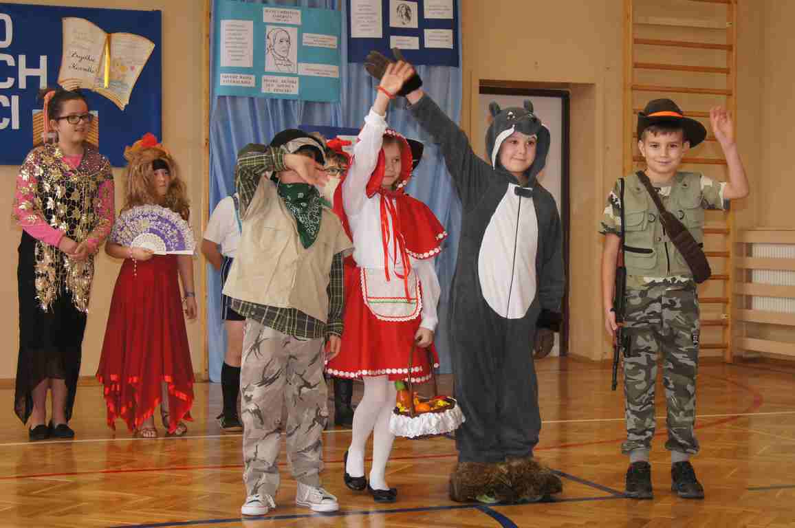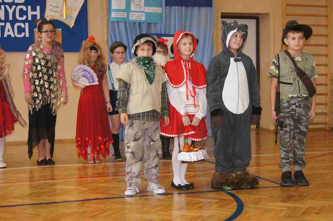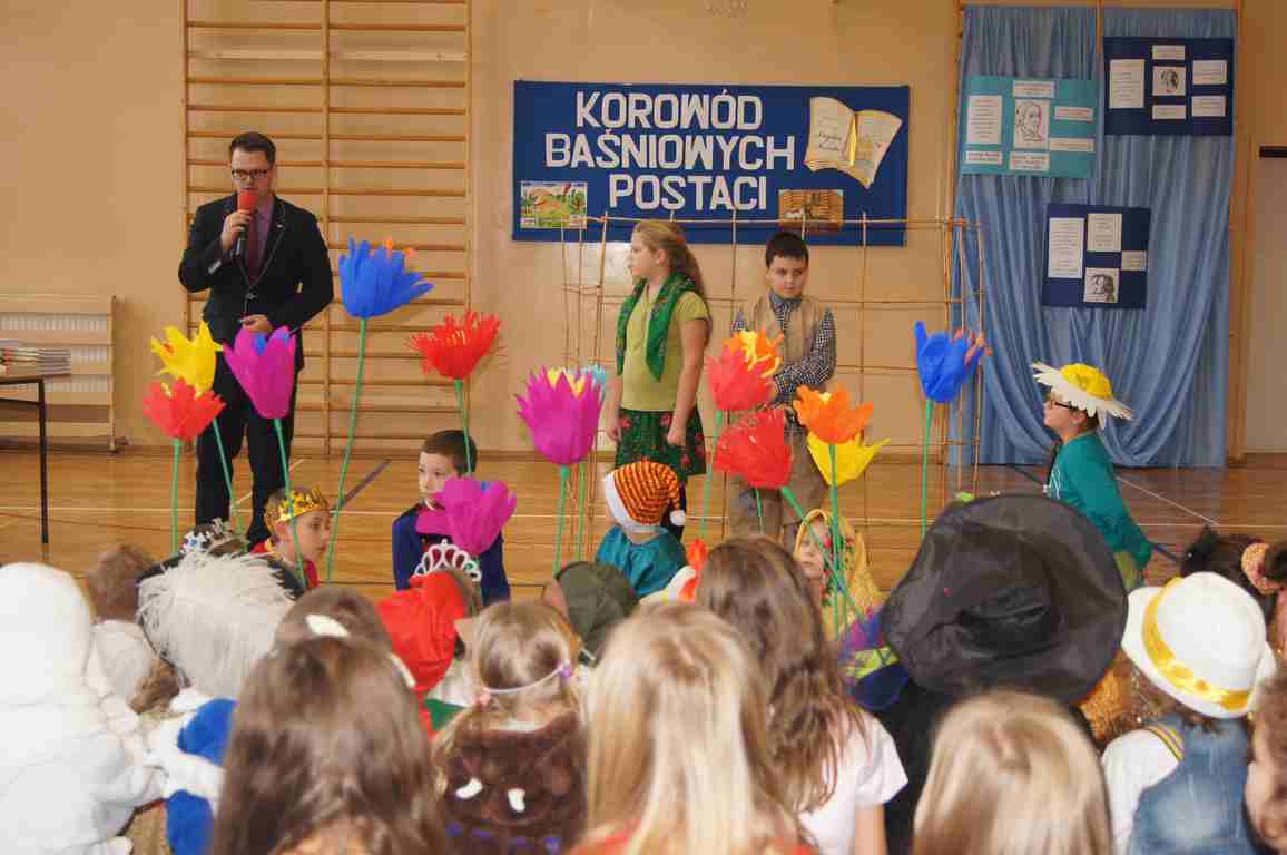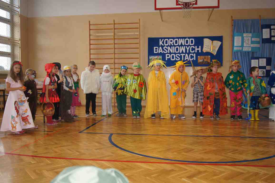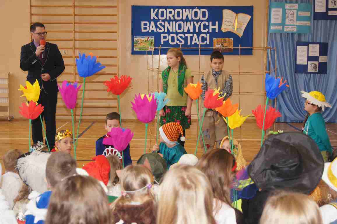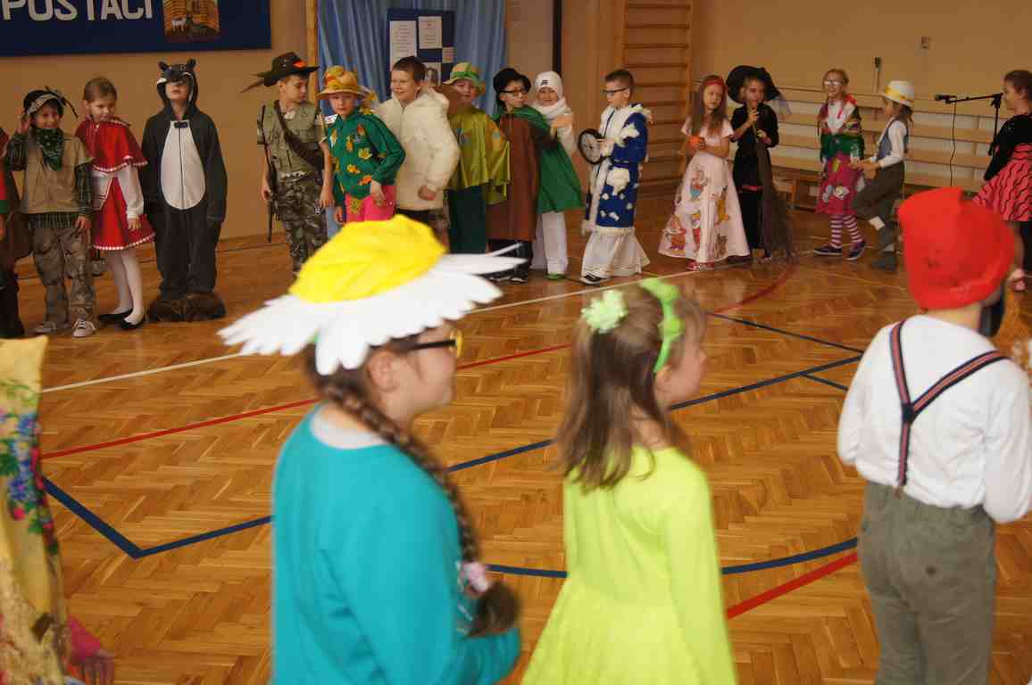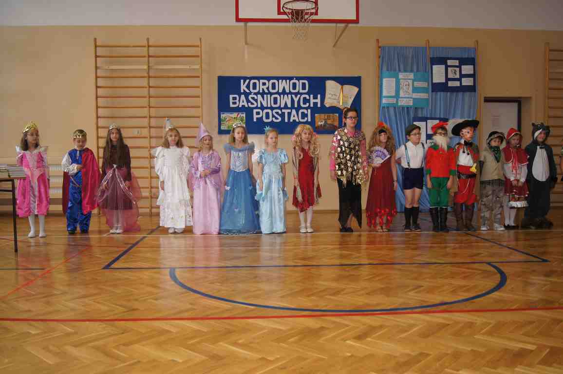 O tym, jak dobrze poznali poszczególne utwory świadczyło poniedziałkowe podsumowanie. Korytarze szkolne od rana zaroiły się od kolorowych postaci, w których nietrudno było rozpoznać bohaterów poszczególnych baśni (przede wszystkim za sprawą świetnych strojów przygotowanych na tę okoliczność przez rodziców drugo – i trzecioklasistów). Na trzeciej lekcji cała społeczność szkolna spotkała się na sali gimnastycznej, gdzie wójt gminy, p. Tomasz Banek przekazał szkolnej bibliotece świeżo zakupione, pachnące jeszcze farbą drukarską nowości wydawnicze, a następnie razem z nami obejrzał przedstawienie pt. „Stokrotka” (na podstawie baśni H. Ch. Andersena) w wykonaniu uczniów kl. III b oraz przeplatany tematycznymi wierszykami i piosenkami pokaz baśniowych postaci, w role których wcielili się uczniowie klasy II. W kolejnym etapie zadaniem zgromadzonej publiczności było odgadnięcie tytułów baśni reprezentowanych przez poszczególnych bohaterów. Finałowym momentem stało się przejście wszystkich zgromadzonych postaci w baśniowym korowodzie.