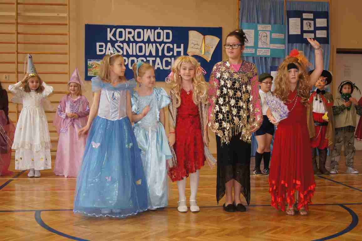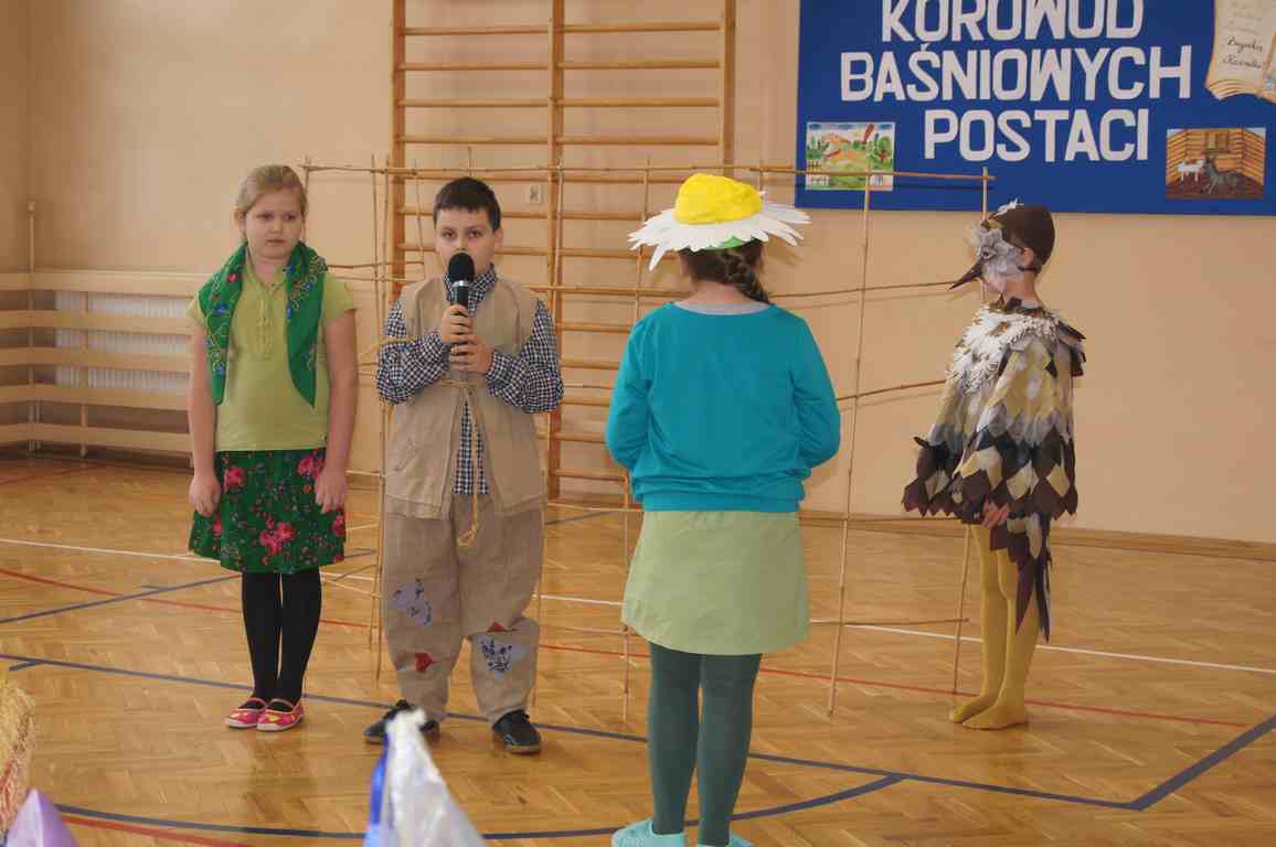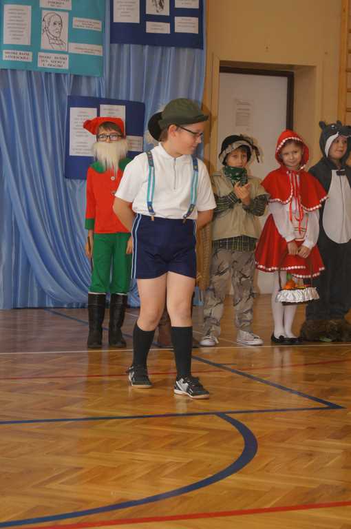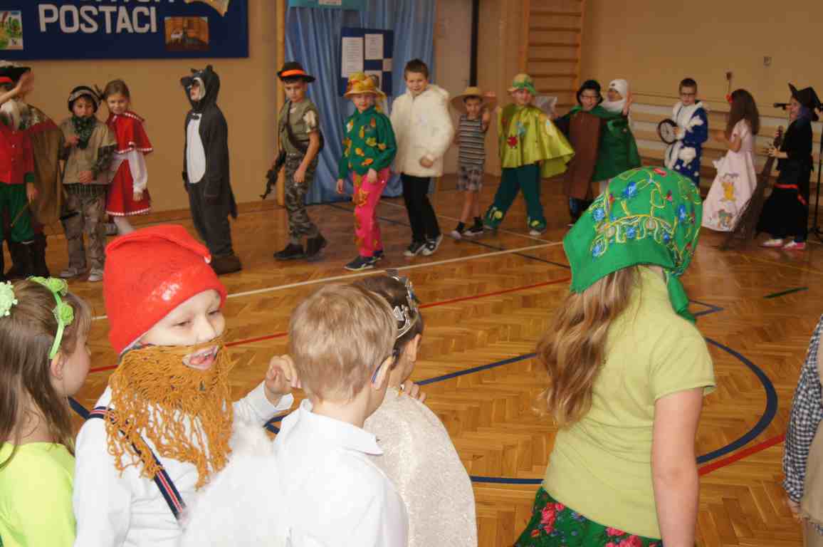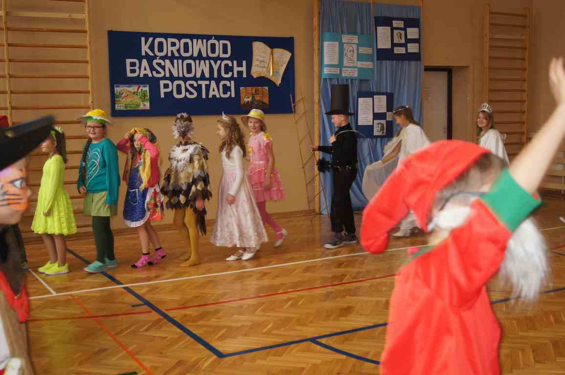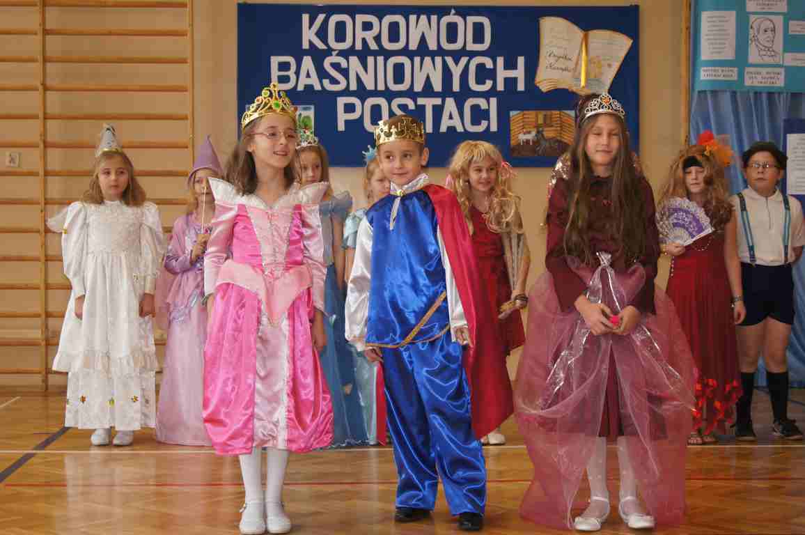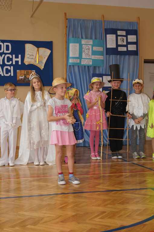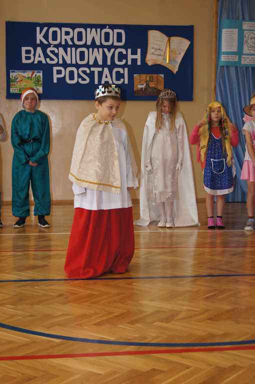 O tym, jak dobrze poznali poszczególne utwory świadczyło poniedziałkowe podsumowanie. Korytarze szkolne od rana zaroiły się od kolorowych postaci, w których nietrudno było rozpoznać bohaterów poszczególnych baśni (przede wszystkim za sprawą świetnych strojów przygotowanych na tę okoliczność przez rodziców drugo – i trzecioklasistów). Na trzeciej lekcji cała społeczność szkolna spotkała się na sali gimnastycznej, gdzie wójt gminy, p. Tomasz Banek przekazał szkolnej bibliotece świeżo zakupione, pachnące jeszcze farbą drukarską nowości wydawnicze, a następnie razem z nami obejrzał przedstawienie pt. „Stokrotka” (na podstawie baśni H. Ch. Andersena) w wykonaniu uczniów kl. III b oraz przeplatany tematycznymi wierszykami i piosenkami pokaz baśniowych postaci, w role których wcielili się uczniowie klasy II. W kolejnym etapie zadaniem zgromadzonej publiczności było odgadnięcie tytułów baśni reprezentowanych przez poszczególnych bohaterów. Finałowym momentem stało się przejście wszystkich zgromadzonych postaci w baśniowym korowodzie.