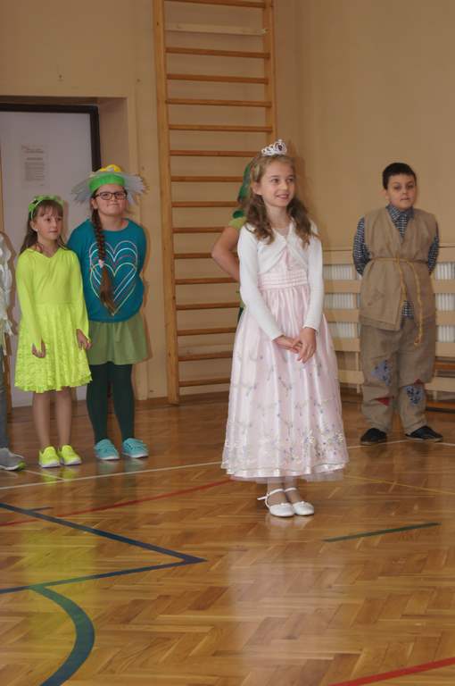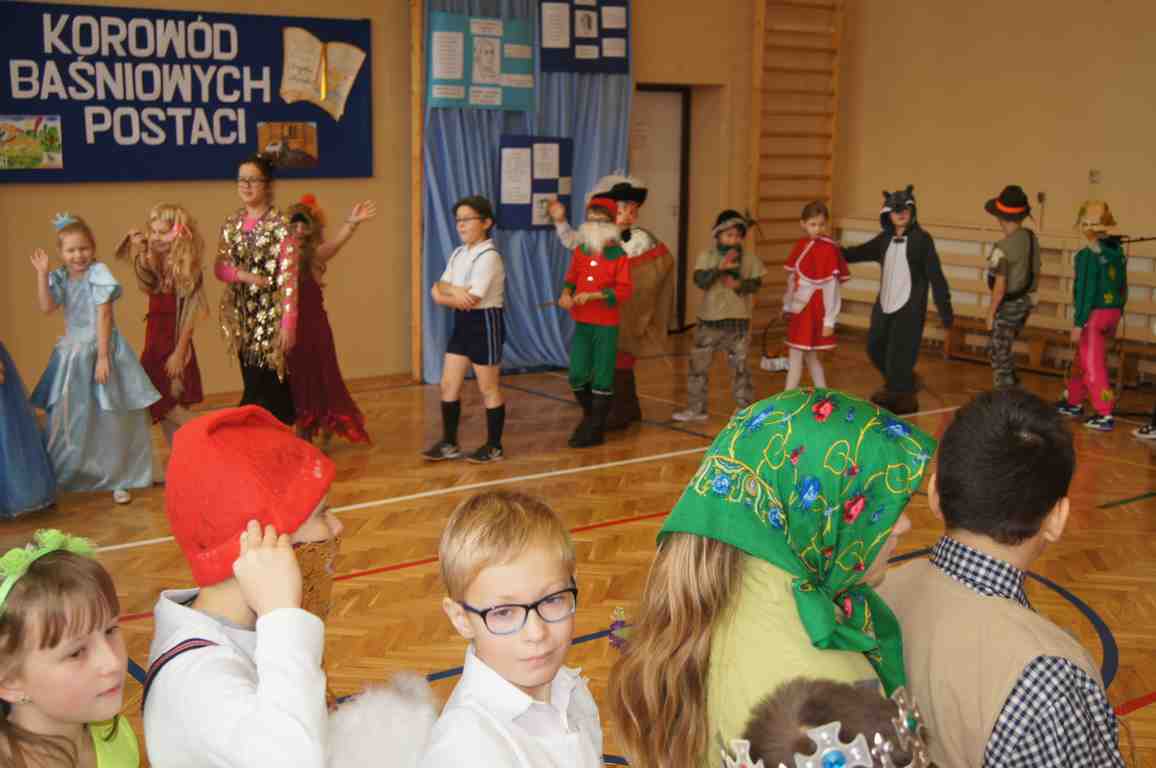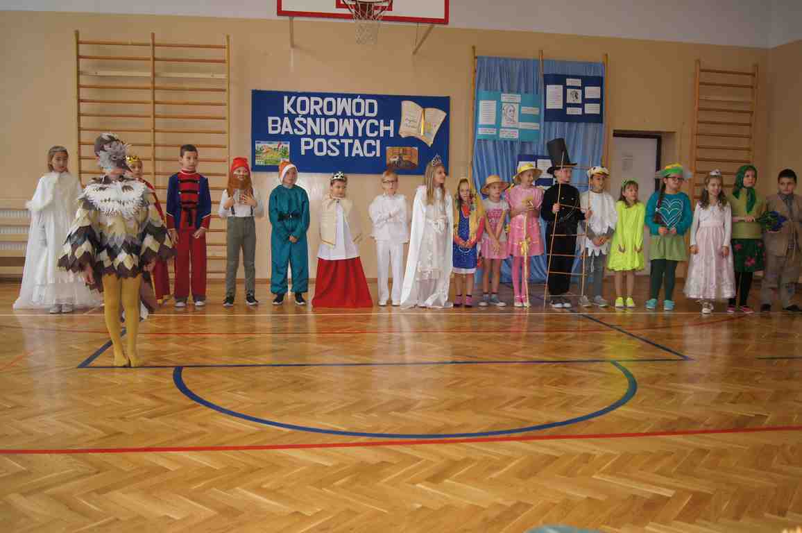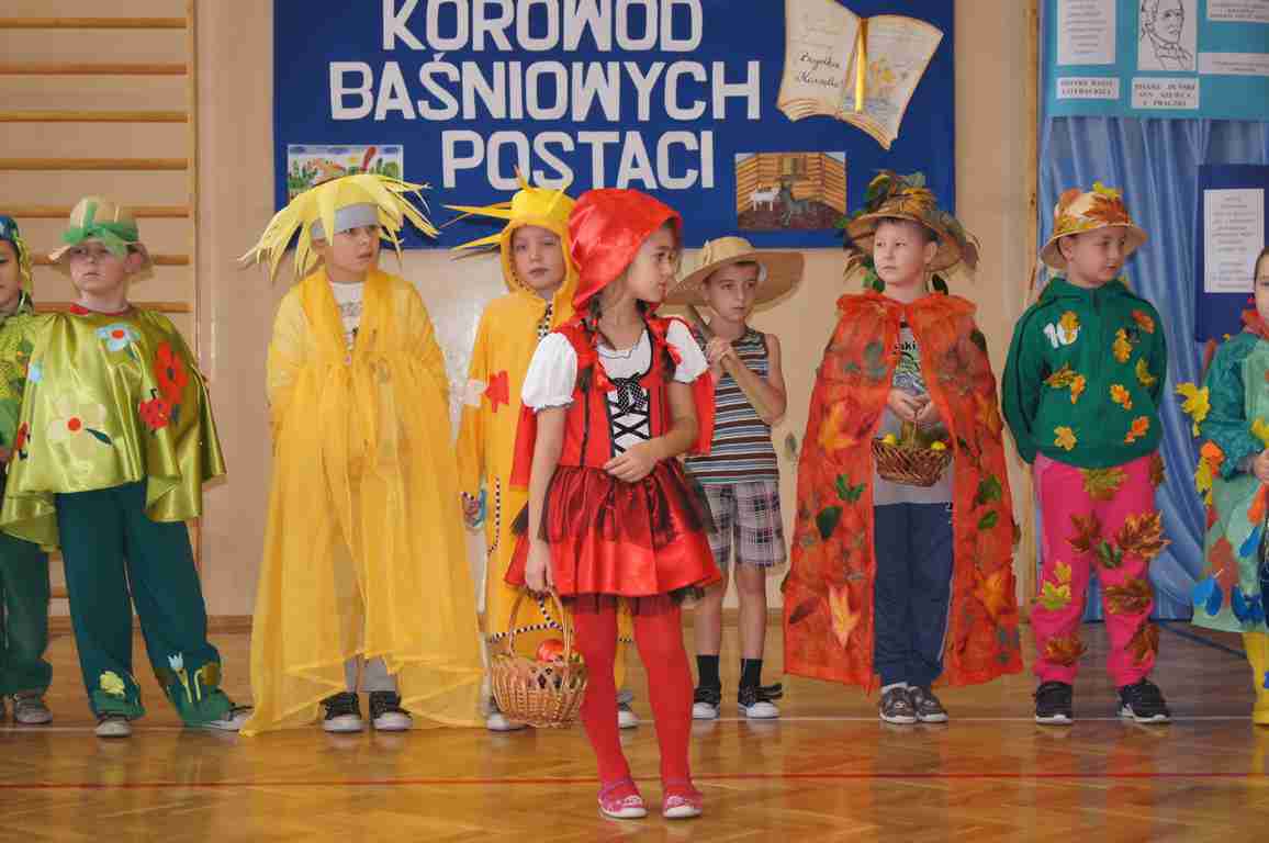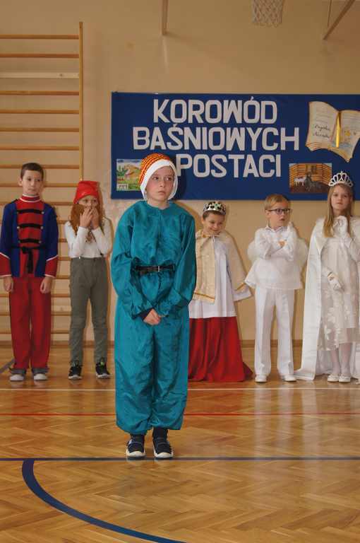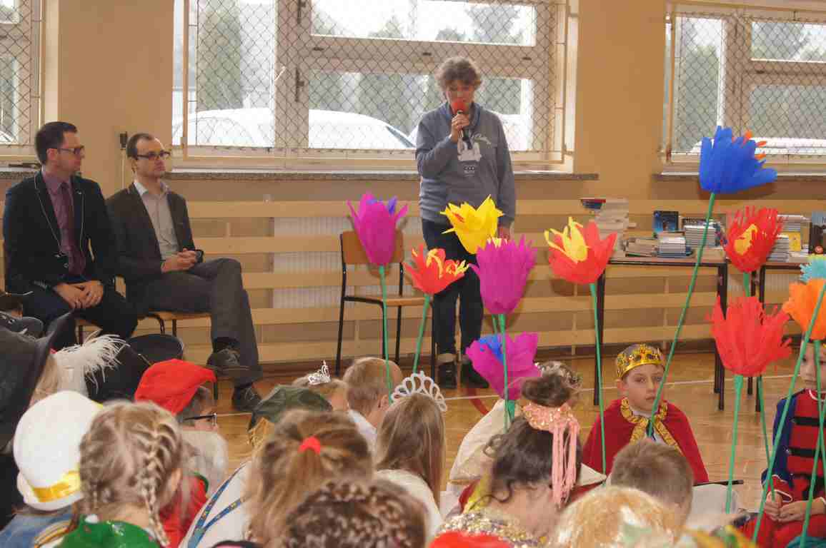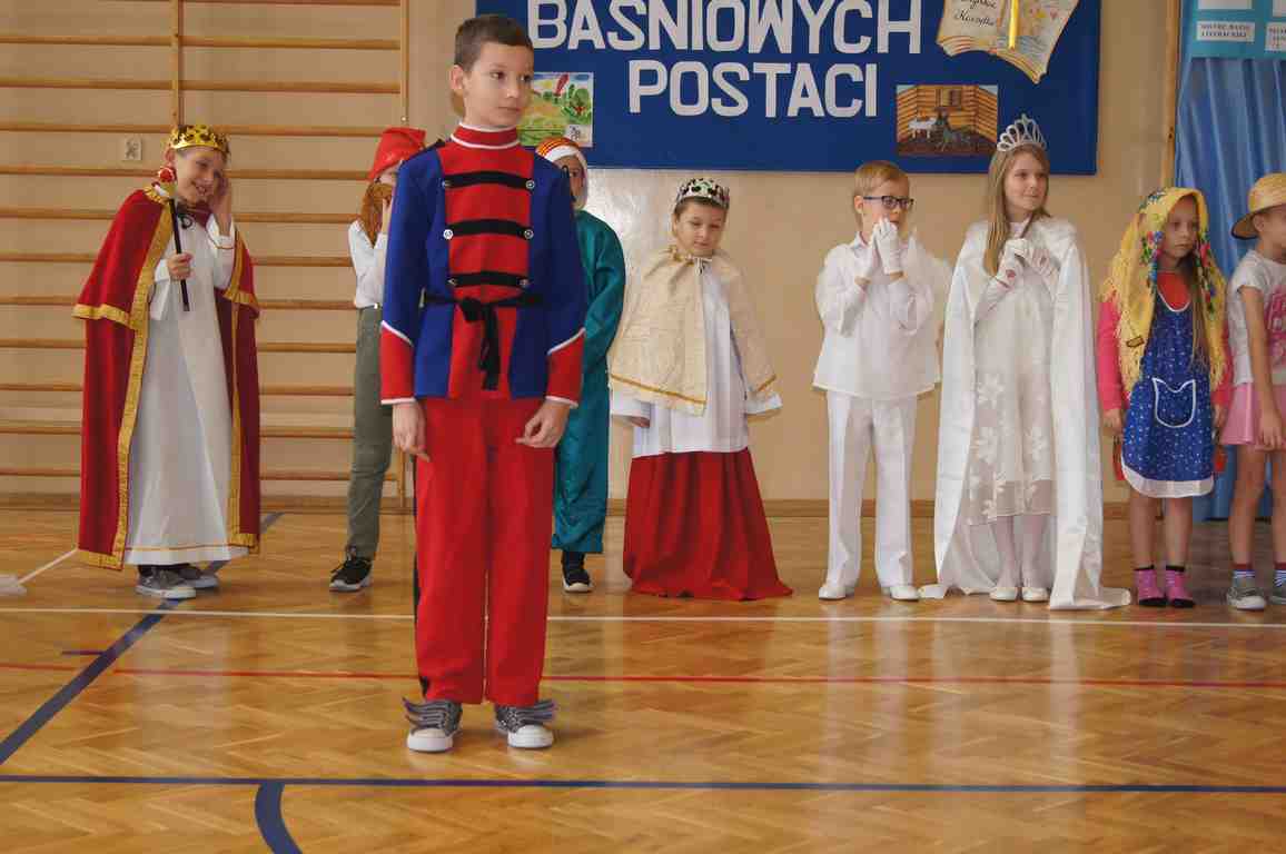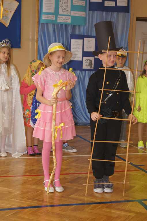 O tym, jak dobrze poznali poszczególne utwory świadczyło poniedziałkowe podsumowanie. Korytarze szkolne od rana zaroiły się od kolorowych postaci, w których nietrudno było rozpoznać bohaterów poszczególnych baśni (przede wszystkim za sprawą świetnych strojów przygotowanych na tę okoliczność przez rodziców drugo – i trzecioklasistów). Na trzeciej lekcji cała społeczność szkolna spotkała się na sali gimnastycznej, gdzie wójt gminy, p. Tomasz Banek przekazał szkolnej bibliotece świeżo zakupione, pachnące jeszcze farbą drukarską nowości wydawnicze, a następnie razem z nami obejrzał przedstawienie pt. „Stokrotka” (na podstawie baśni H. Ch. Andersena) w wykonaniu uczniów kl. III b oraz przeplatany tematycznymi wierszykami i piosenkami pokaz baśniowych postaci, w role których wcielili się uczniowie klasy II. W kolejnym etapie zadaniem zgromadzonej publiczności było odgadnięcie tytułów baśni reprezentowanych przez poszczególnych bohaterów. Finałowym momentem stało się przejście wszystkich zgromadzonych postaci w baśniowym korowodzie.
