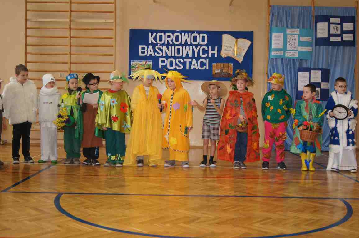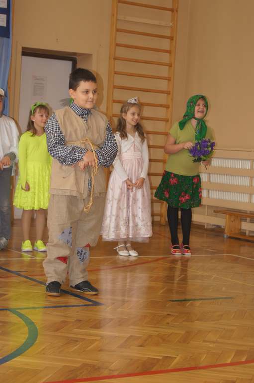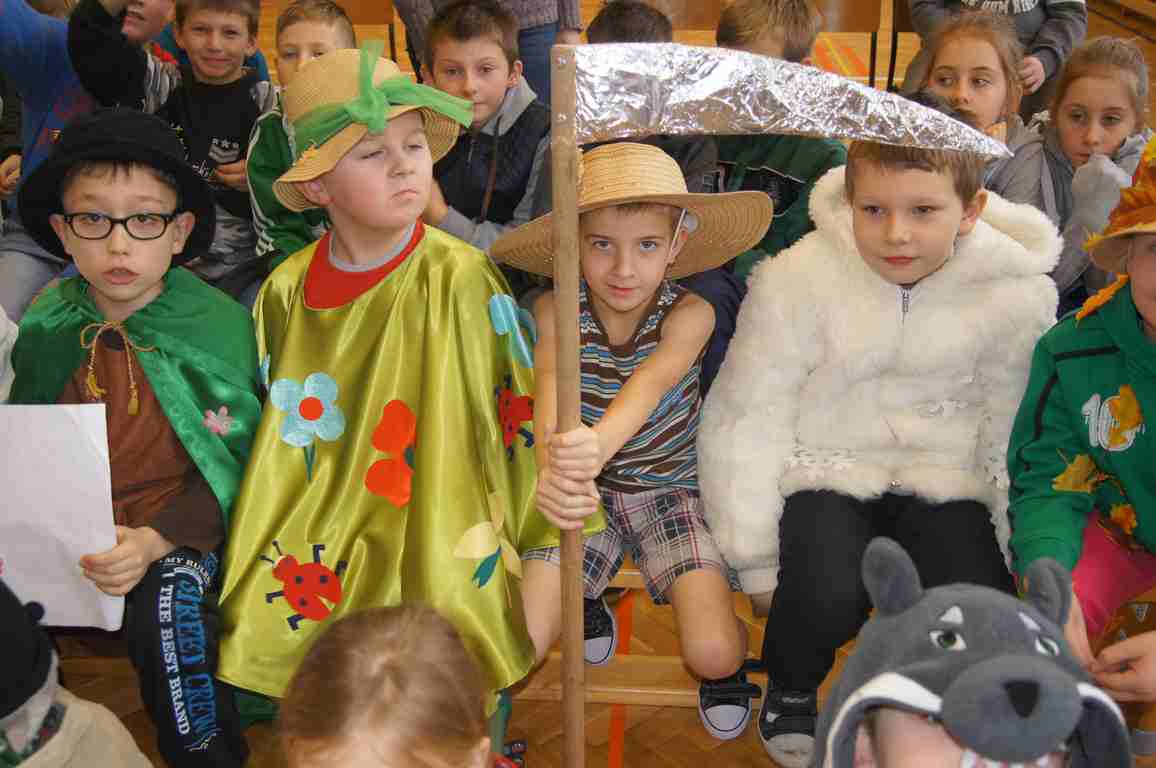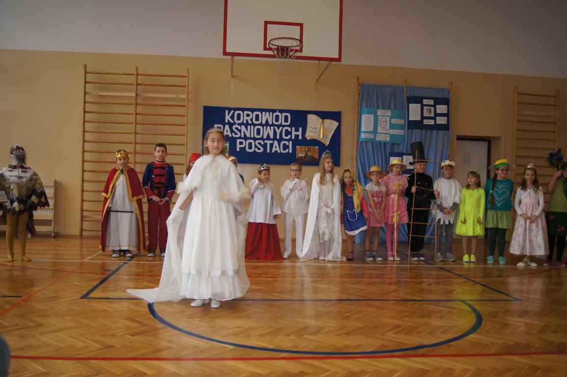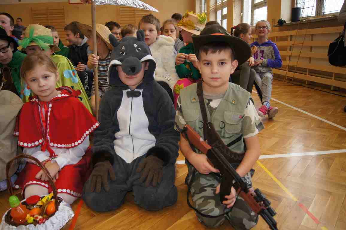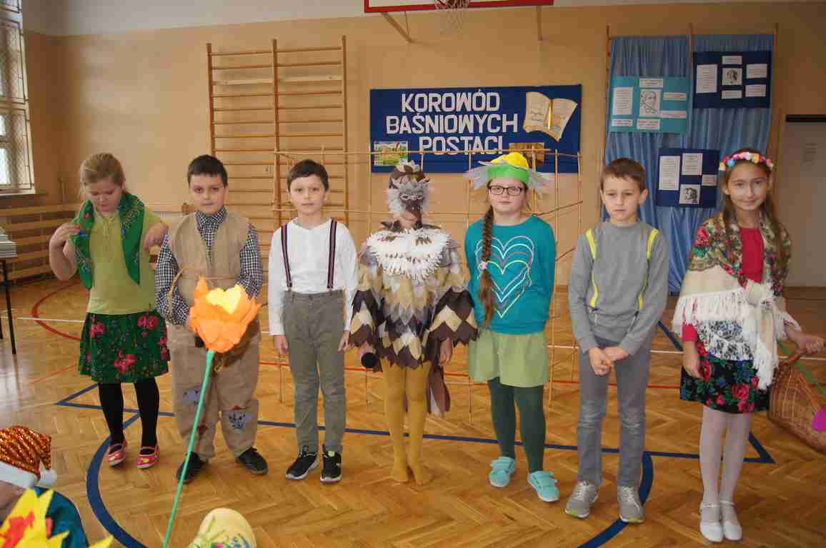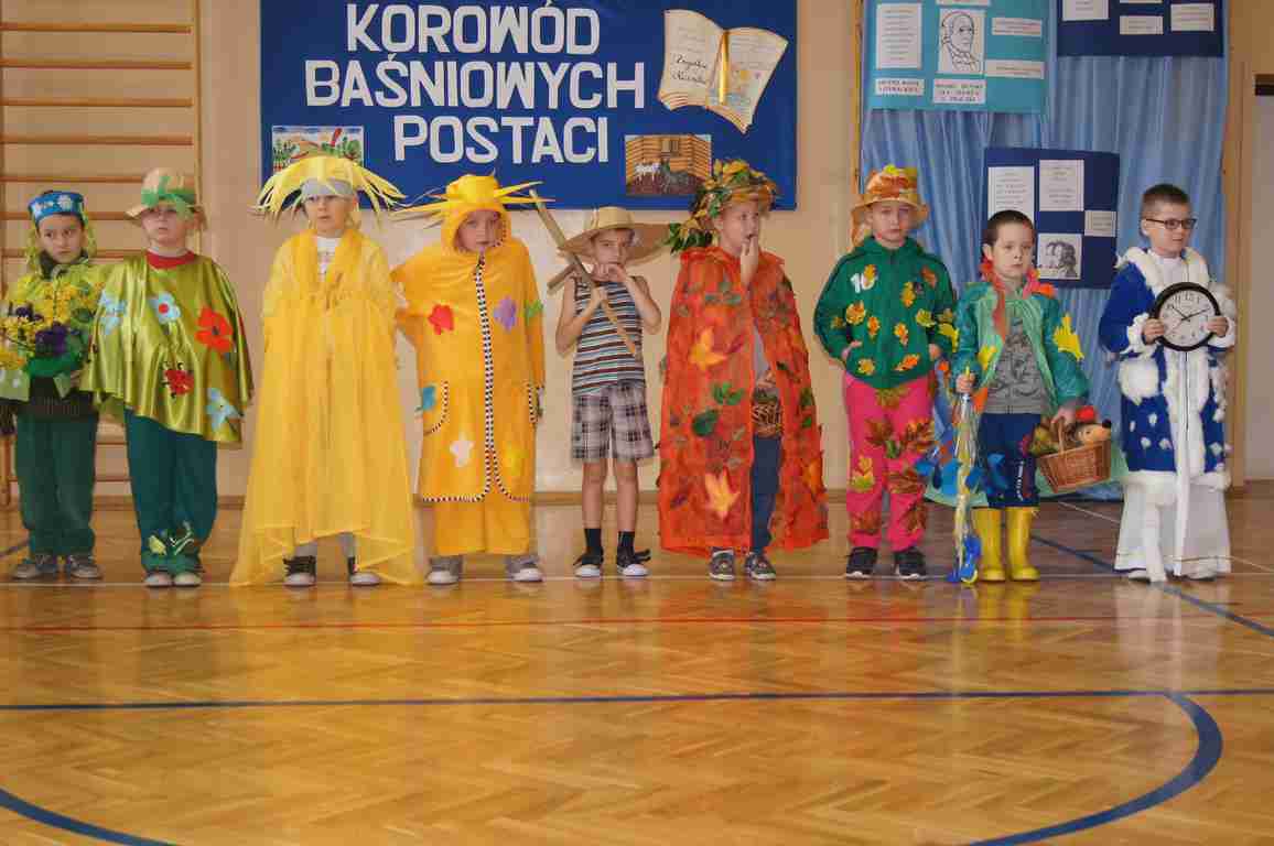 O tym, jak dobrze poznali poszczególne utwory świadczyło poniedziałkowe podsumowanie. Korytarze szkolne od rana zaroiły się od kolorowych postaci, w których nietrudno było rozpoznać bohaterów poszczególnych baśni (przede wszystkim za sprawą świetnych strojów przygotowanych na tę okoliczność przez rodziców drugo – i trzecioklasistów). Na trzeciej lekcji cała społeczność szkolna spotkała się na sali gimnastycznej, gdzie wójt gminy, p. Tomasz Banek przekazał szkolnej bibliotece świeżo zakupione, pachnące jeszcze farbą drukarską nowości wydawnicze, a następnie razem z nami obejrzał przedstawienie pt. „Stokrotka” (na podstawie baśni H. Ch. Andersena) w wykonaniu uczniów kl. III b oraz przeplatany tematycznymi wierszykami i piosenkami pokaz baśniowych postaci, w role których wcielili się uczniowie klasy II. W kolejnym etapie zadaniem zgromadzonej publiczności było odgadnięcie tytułów baśni reprezentowanych przez poszczególnych bohaterów. Finałowym momentem stało się przejście wszystkich zgromadzonych postaci w baśniowym korowodzie.