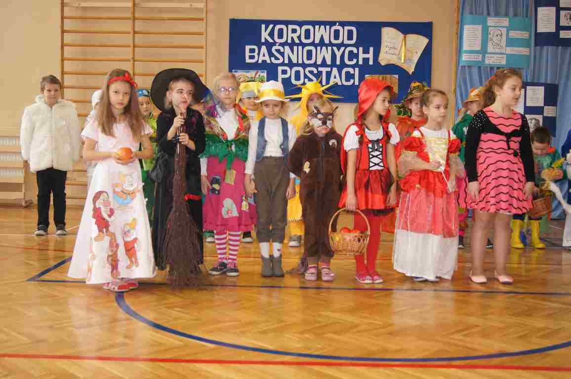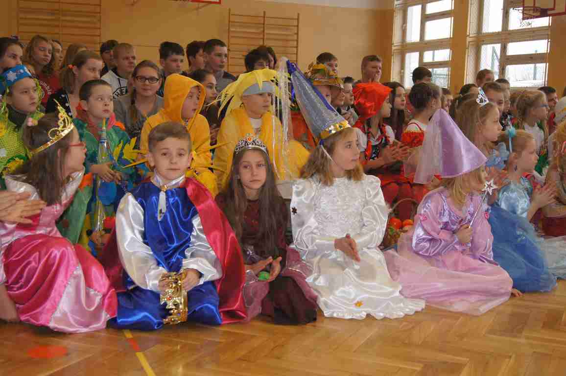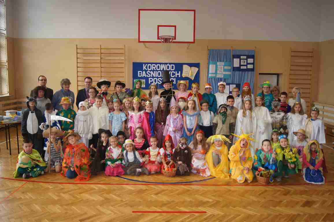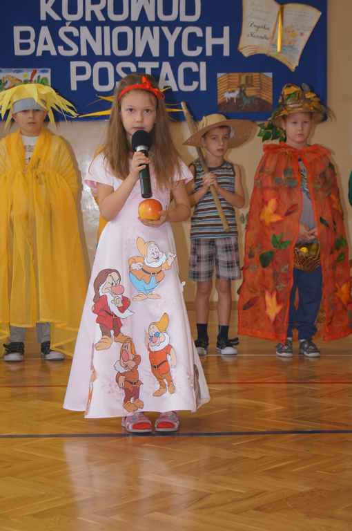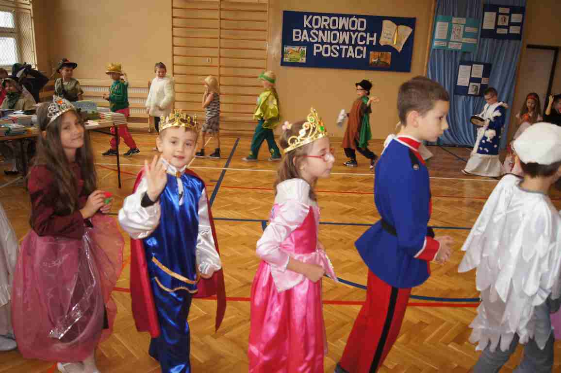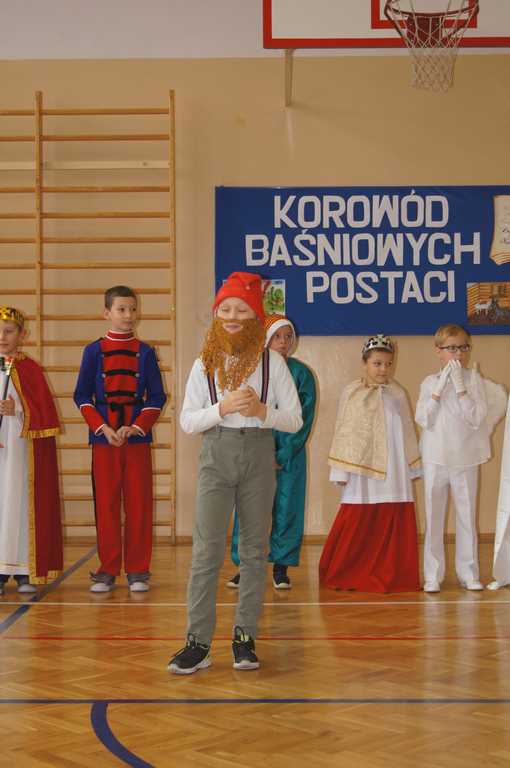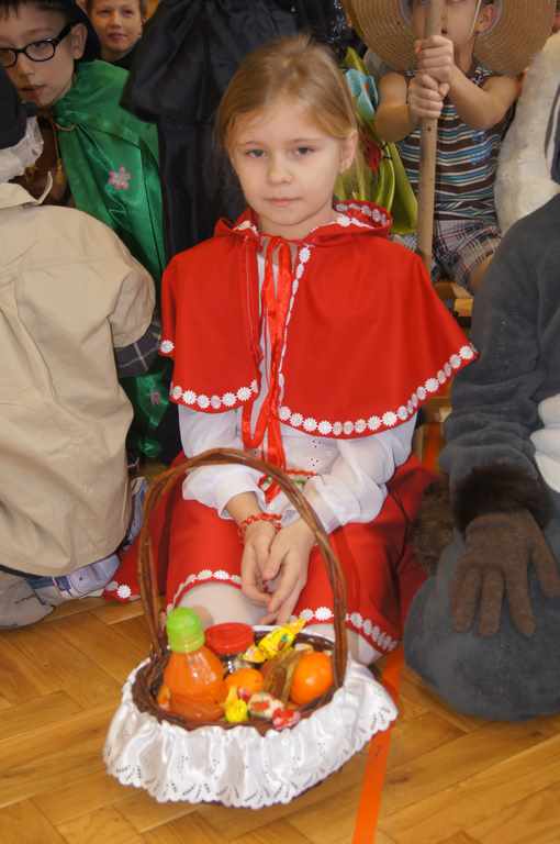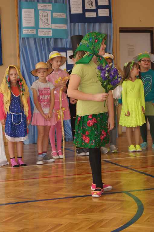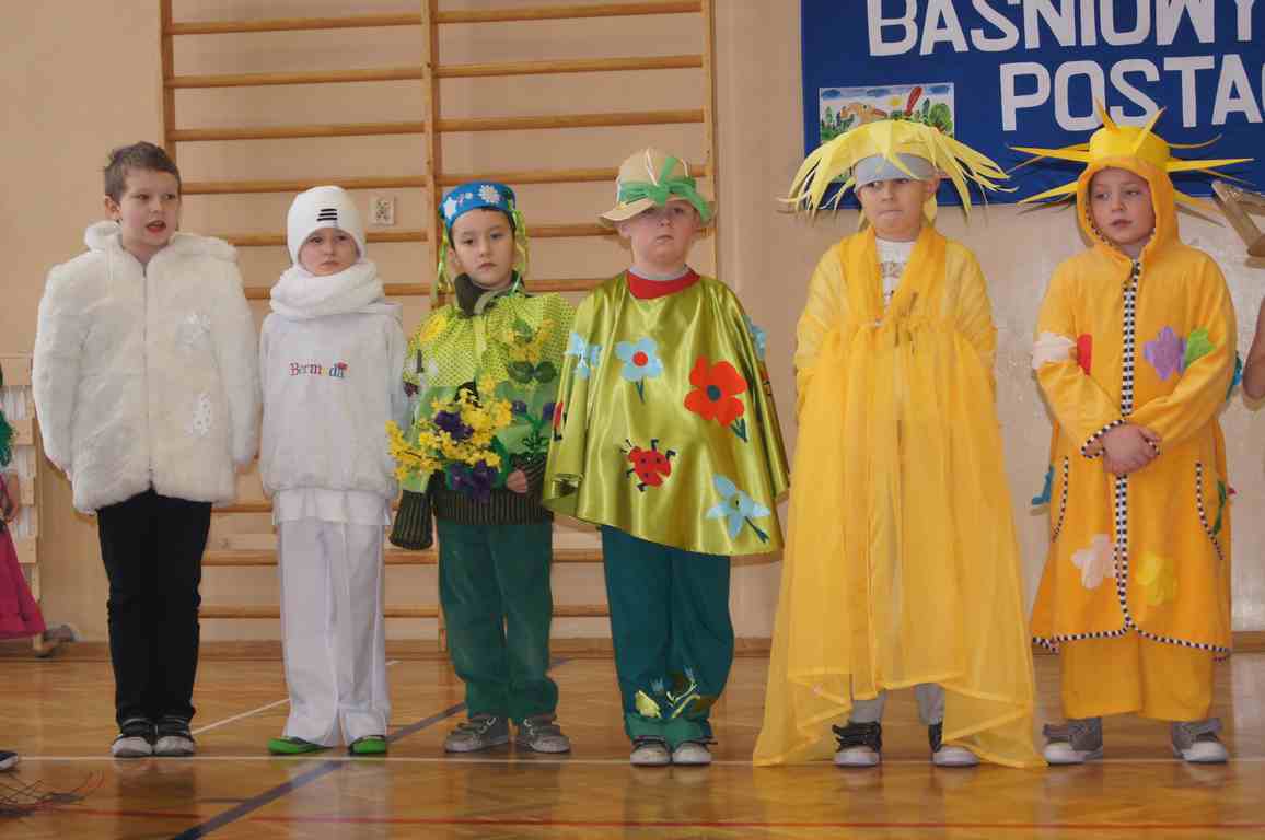 O tym, jak dobrze poznali poszczególne utwory świadczyło poniedziałkowe podsumowanie. Korytarze szkolne od rana zaroiły się od kolorowych postaci, w których nietrudno było rozpoznać bohaterów poszczególnych baśni (przede wszystkim za sprawą świetnych strojów przygotowanych na tę okoliczność przez rodziców drugo – i trzecioklasistów). Na trzeciej lekcji cała społeczność szkolna spotkała się na sali gimnastycznej, gdzie wójt gminy, p. Tomasz Banek przekazał szkolnej bibliotece świeżo zakupione, pachnące jeszcze farbą drukarską nowości wydawnicze, a następnie razem z nami obejrzał przedstawienie pt. „Stokrotka” (na podstawie baśni H. Ch. Andersena) w wykonaniu uczniów kl. III b oraz przeplatany tematycznymi wierszykami i piosenkami pokaz baśniowych postaci, w role których wcielili się uczniowie klasy II. W kolejnym etapie zadaniem zgromadzonej publiczności było odgadnięcie tytułów baśni reprezentowanych przez poszczególnych bohaterów. Finałowym momentem stało się przejście wszystkich zgromadzonych postaci w baśniowym korowodzie.