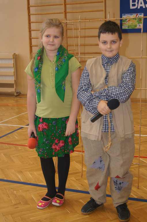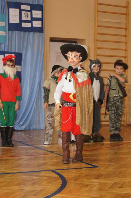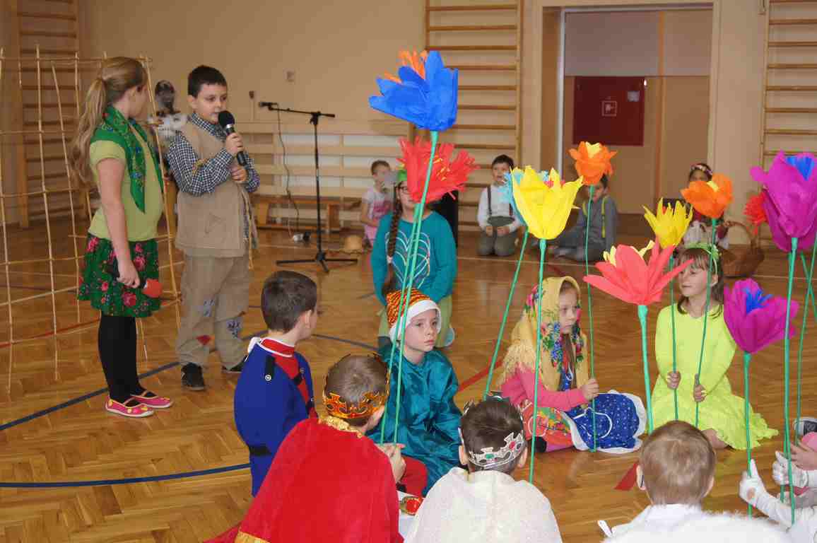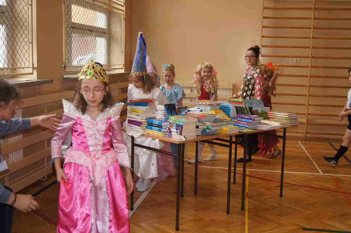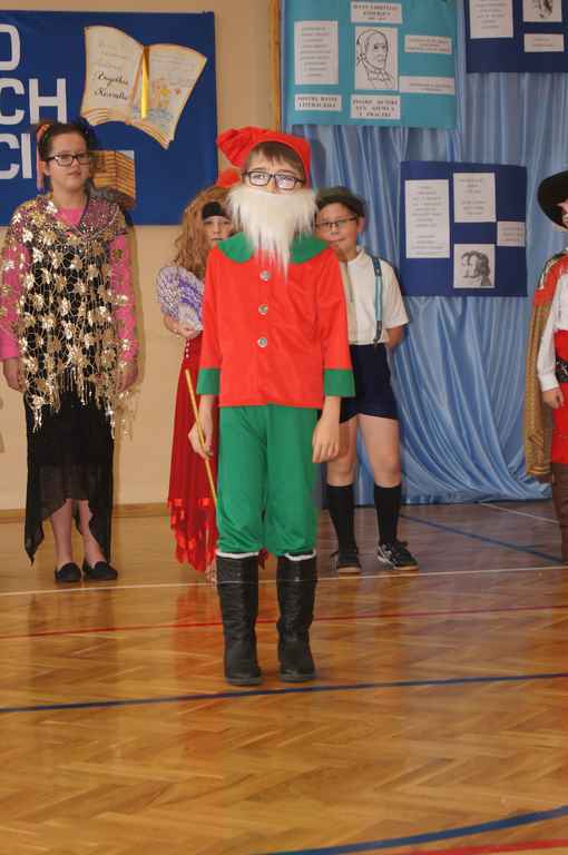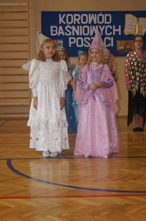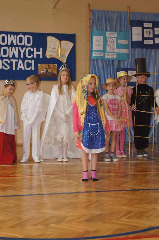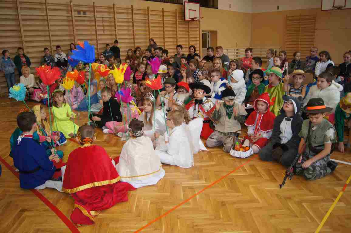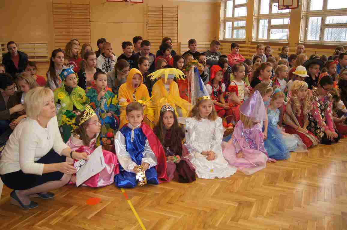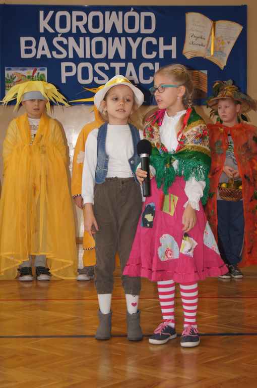 O tym, jak dobrze poznali poszczególne utwory świadczyło poniedziałkowe podsumowanie. Korytarze szkolne od rana zaroiły się od kolorowych postaci, w których nietrudno było rozpoznać bohaterów poszczególnych baśni (przede wszystkim za sprawą świetnych strojów przygotowanych na tę okoliczność przez rodziców drugo – i trzecioklasistów). Na trzeciej lekcji cała społeczność szkolna spotkała się na sali gimnastycznej, gdzie wójt gminy, p. Tomasz Banek przekazał szkolnej bibliotece świeżo zakupione, pachnące jeszcze farbą drukarską nowości wydawnicze, a następnie razem z nami obejrzał przedstawienie pt. „Stokrotka” (na podstawie baśni H. Ch. Andersena) w wykonaniu uczniów kl. III b oraz przeplatany tematycznymi wierszykami i piosenkami pokaz baśniowych postaci, w role których wcielili się uczniowie klasy II. W kolejnym etapie zadaniem zgromadzonej publiczności było odgadnięcie tytułów baśni reprezentowanych przez poszczególnych bohaterów. Finałowym momentem stało się przejście wszystkich zgromadzonych postaci w baśniowym korowodzie.