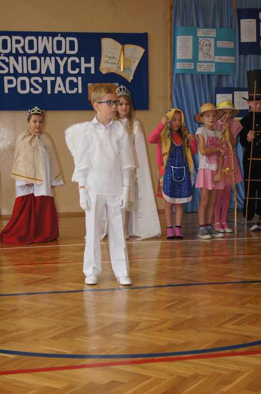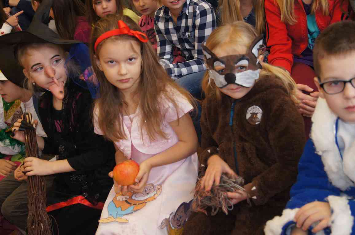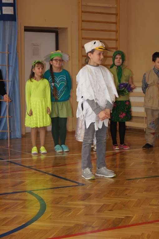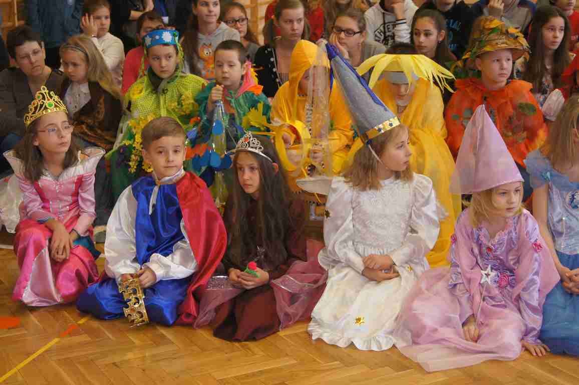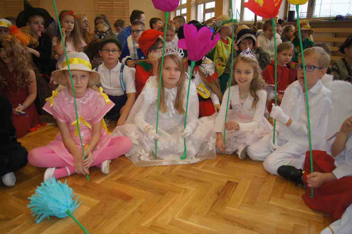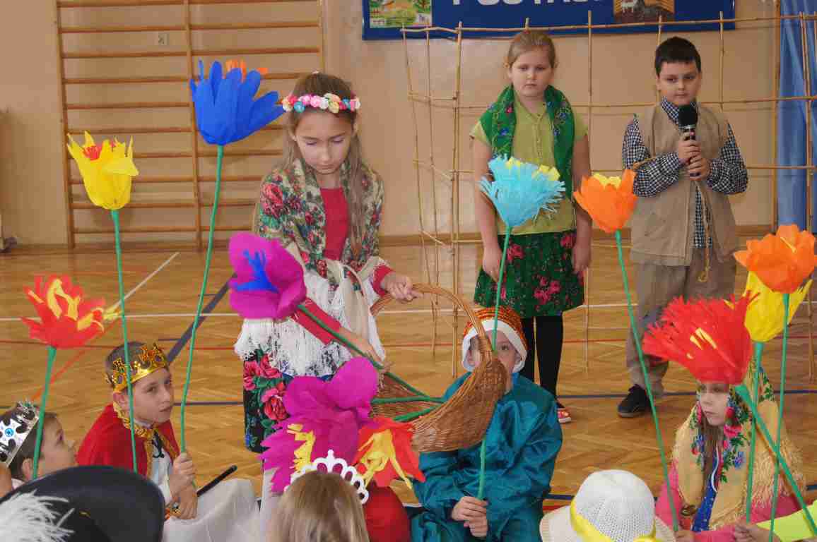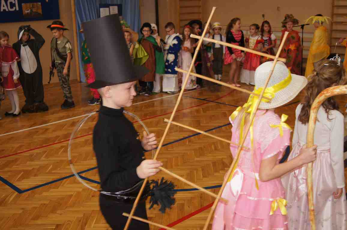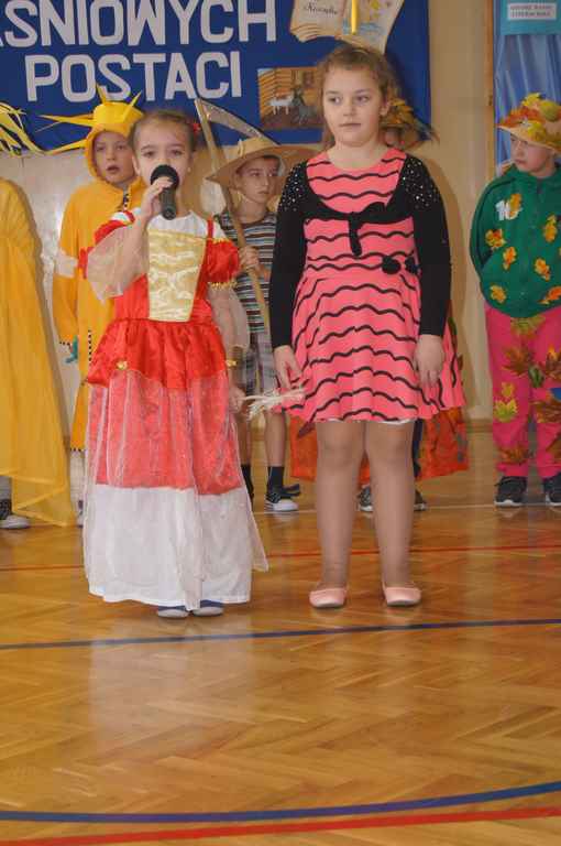 O tym, jak dobrze poznali poszczególne utwory świadczyło poniedziałkowe podsumowanie. Korytarze szkolne od rana zaroiły się od kolorowych postaci, w których nietrudno było rozpoznać bohaterów poszczególnych baśni (przede wszystkim za sprawą świetnych strojów przygotowanych na tę okoliczność przez rodziców drugo – i trzecioklasistów). Na trzeciej lekcji cała społeczność szkolna spotkała się na sali gimnastycznej, gdzie wójt gminy, p. Tomasz Banek przekazał szkolnej bibliotece świeżo zakupione, pachnące jeszcze farbą drukarską nowości wydawnicze, a następnie razem z nami obejrzał przedstawienie pt. „Stokrotka” (na podstawie baśni H. Ch. Andersena) w wykonaniu uczniów kl. III b oraz przeplatany tematycznymi wierszykami i piosenkami pokaz baśniowych postaci, w role których wcielili się uczniowie klasy II. W kolejnym etapie zadaniem zgromadzonej publiczności było odgadnięcie tytułów baśni reprezentowanych przez poszczególnych bohaterów. Finałowym momentem stało się przejście wszystkich zgromadzonych postaci w baśniowym korowodzie.