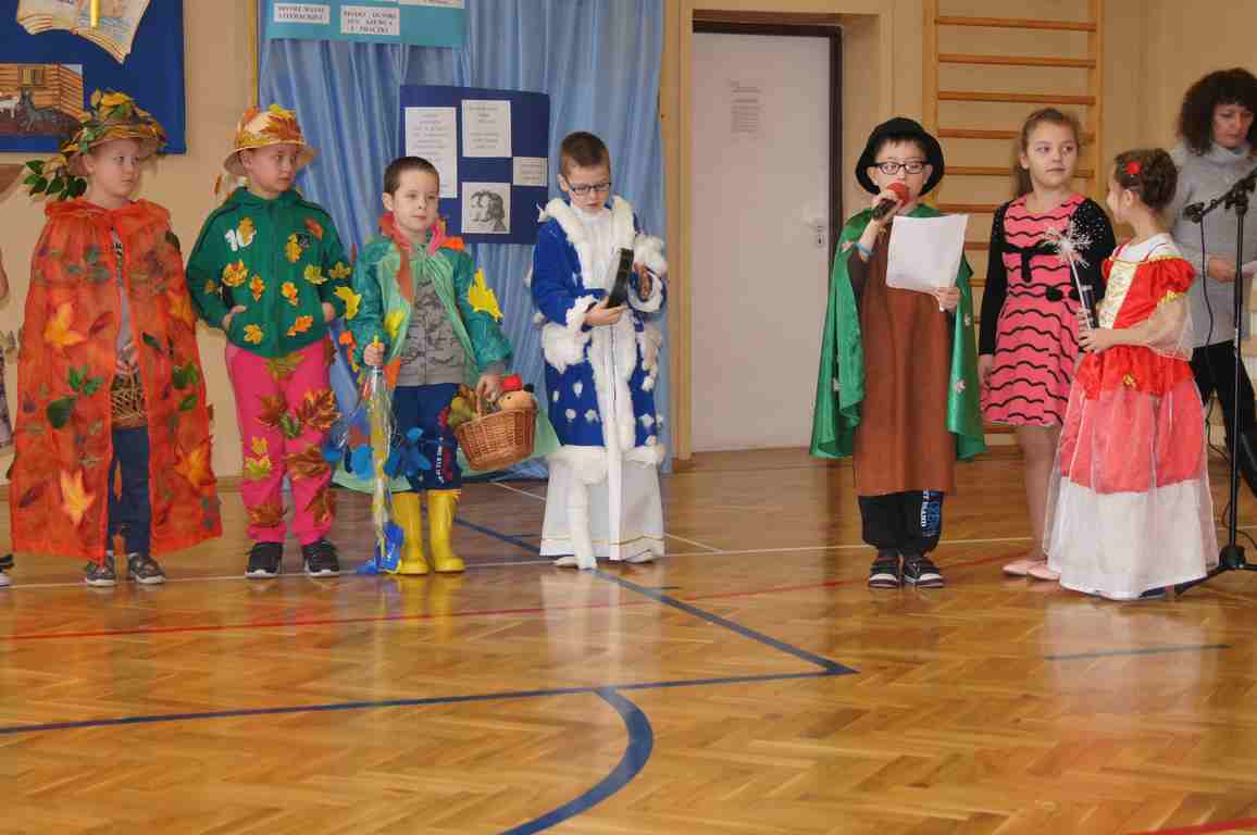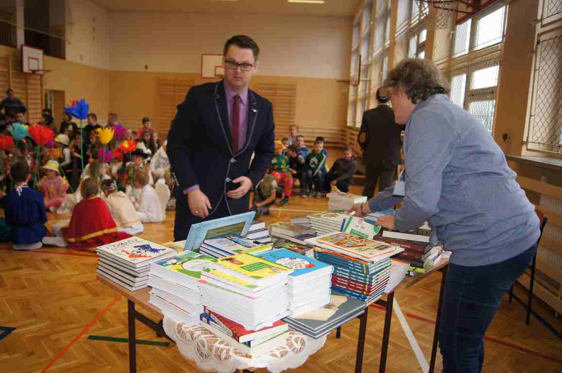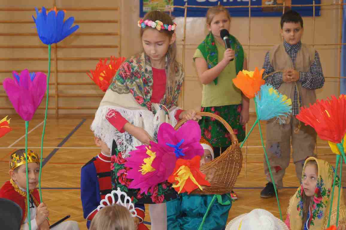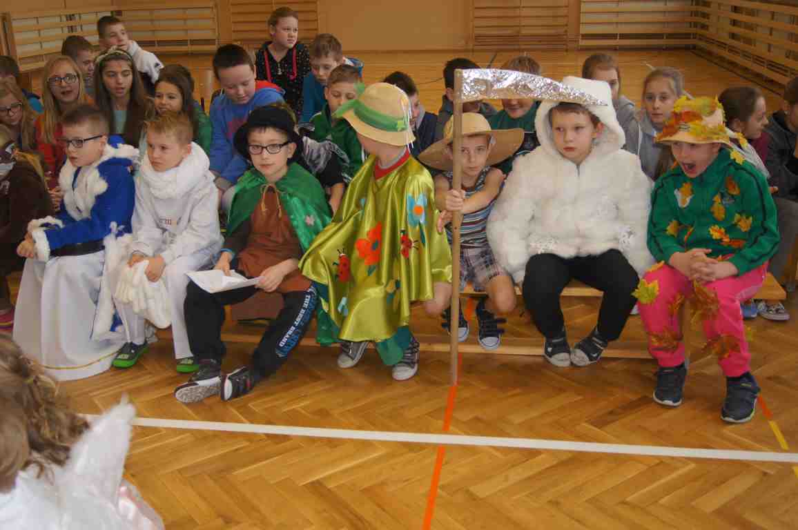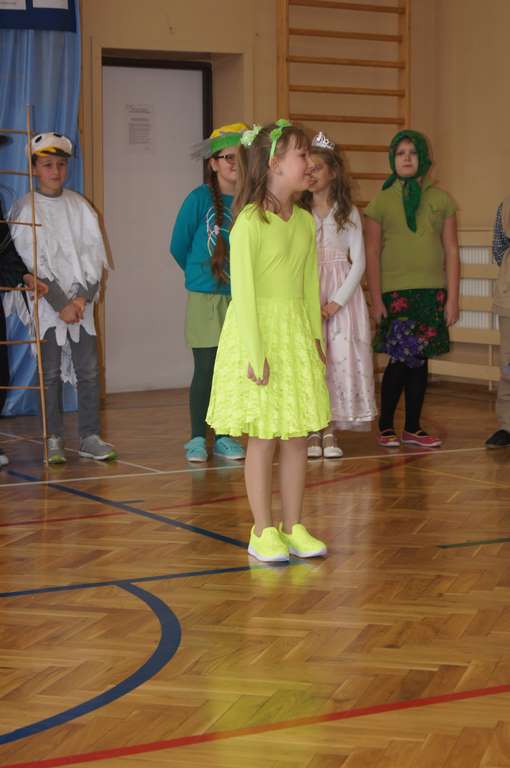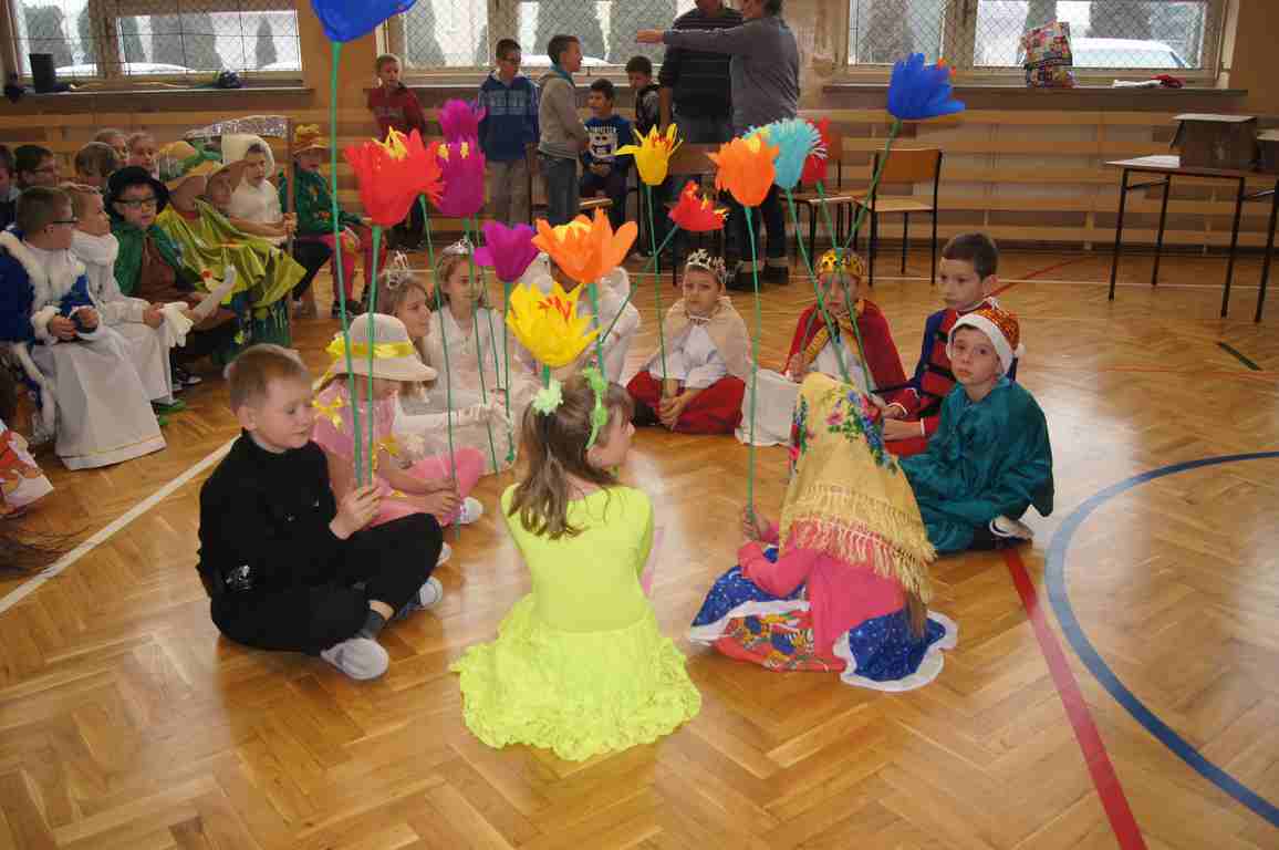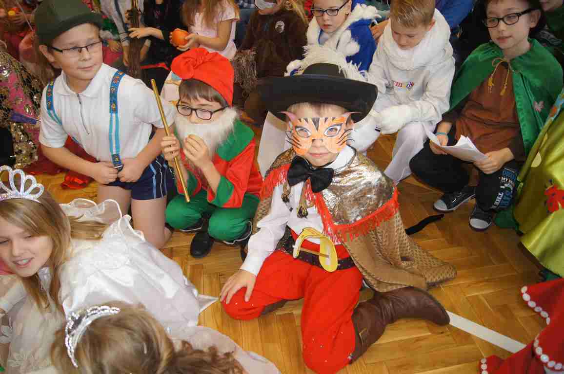 O tym, jak dobrze poznali poszczególne utwory świadczyło poniedziałkowe podsumowanie. Korytarze szkolne od rana zaroiły się od kolorowych postaci, w których nietrudno było rozpoznać bohaterów poszczególnych baśni (przede wszystkim za sprawą świetnych strojów przygotowanych na tę okoliczność przez rodziców drugo – i trzecioklasistów). Na trzeciej lekcji cała społeczność szkolna spotkała się na sali gimnastycznej, gdzie wójt gminy, p. Tomasz Banek przekazał szkolnej bibliotece świeżo zakupione, pachnące jeszcze farbą drukarską nowości wydawnicze, a następnie razem z nami obejrzał przedstawienie pt. „Stokrotka” (na podstawie baśni H. Ch. Andersena) w wykonaniu uczniów kl. III b oraz przeplatany tematycznymi wierszykami i piosenkami pokaz baśniowych postaci, w role których wcielili się uczniowie klasy II. W kolejnym etapie zadaniem zgromadzonej publiczności było odgadnięcie tytułów baśni reprezentowanych przez poszczególnych bohaterów. Finałowym momentem stało się przejście wszystkich zgromadzonych postaci w baśniowym korowodzie.