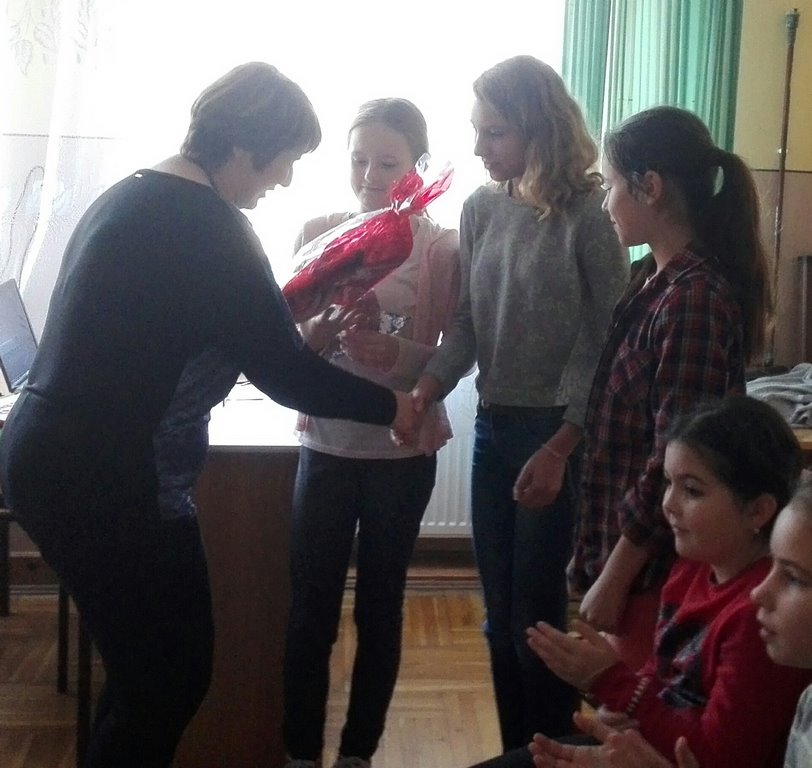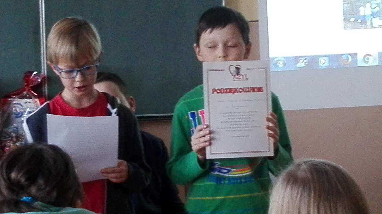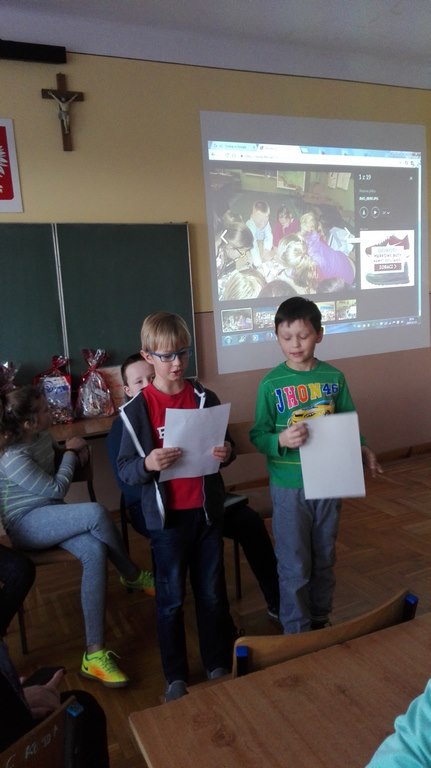 Uczniowie z LOP omówili przebieg akcji „Pomagam zwierzętom przetrwać zimę”, dziewczęta z klasy 6 –Agnieszka Boroń, Julia Pieczonka, Klaudia Wieczorek wyświetliły i omówiły autorsko nakręcony film, a uczeń Jakub Koziara z klasy 4 przedstawił napisane przez siebie opowiadanie. Uczniowie otrzymali nagrody rzeczowe i dyplomy z rąk pani dyrektor Jadwigi Łucarz i pani pedagog.