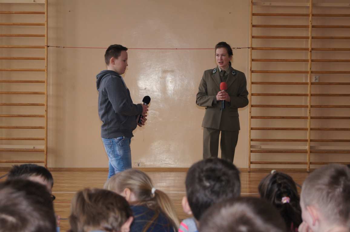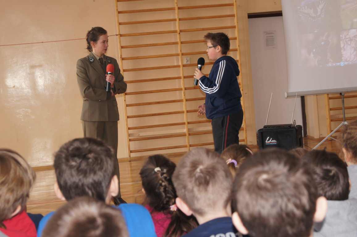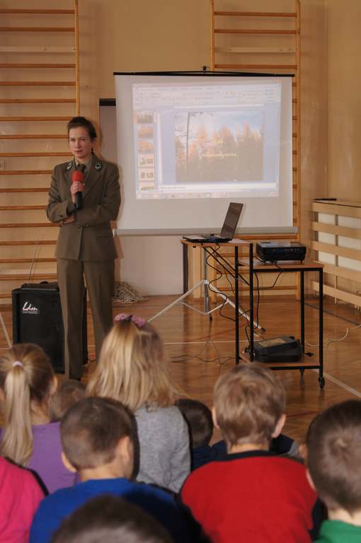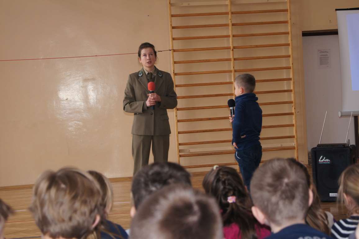 W ramach obchodów Dnia LOP, Szkolne Koło LOP zaprosiło na spotkanie panią Karolinę Matułę – leśnika z punktu edukacyjnego w leśnictwie Wał Ruda. Pani Karolina opowiedziała dzieciom o lesie i jego mieszkańcach, a za pomocą kolorowej prezentacji przybliżyła nazwy wszystkich warstw roślinności leśnej. Uczniowie dowiedzieli się również, na czym polega praca leśnika, jak chroni się okoliczne lasy. Pani leśnik zwróciła także uwagę, jak należy zachowywać się w lesie, by nie płoszyć zwierząt.