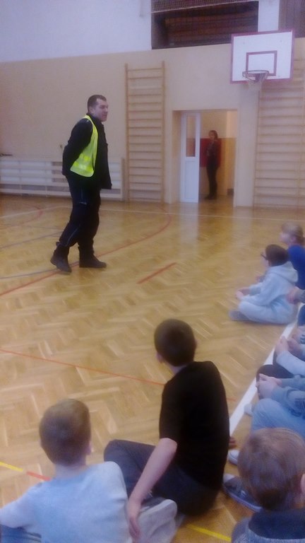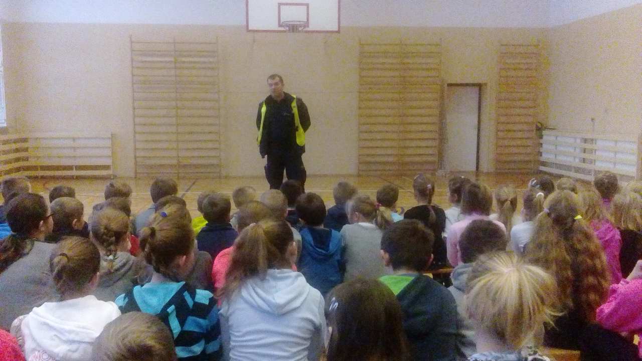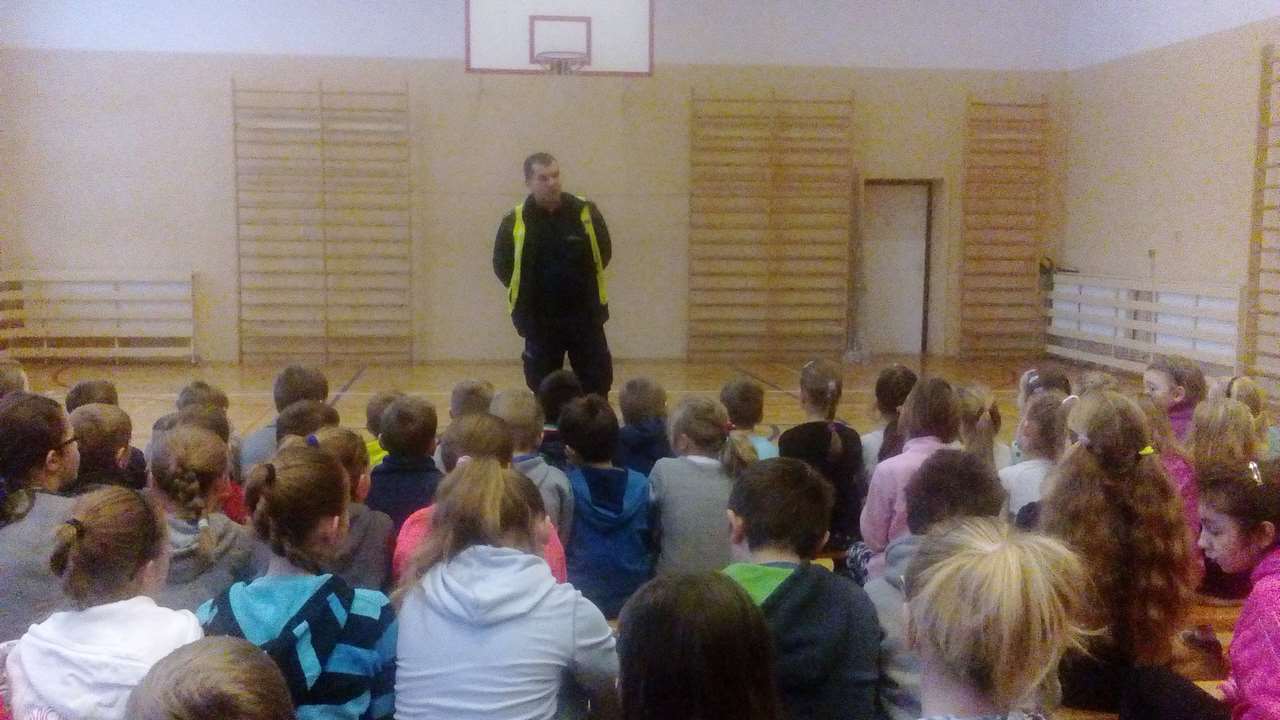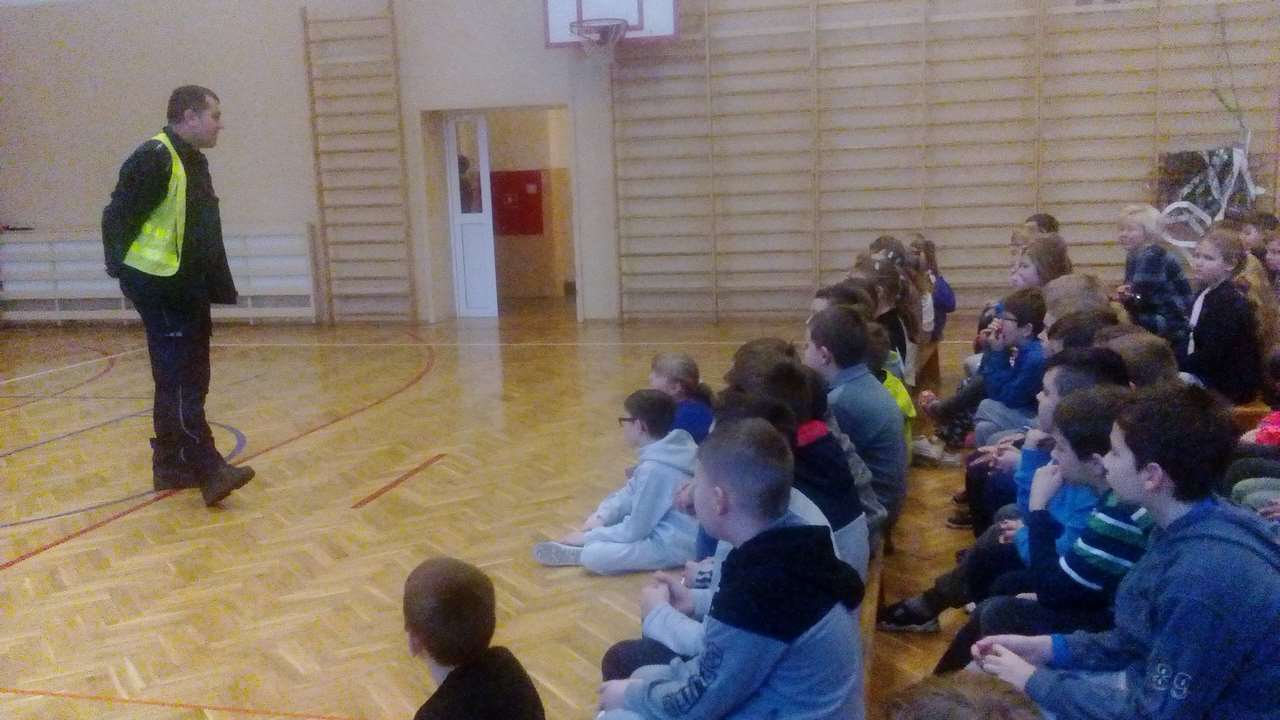 Policjant przestrzegał uczniów przed niebezpieczeństwami, jakie mogą ich spotkać w czasie zabaw na śniegu i lodzie, informował, jakie zagrożenie niesie ze sobą zjeżdżanie na sankach w okolicach, gdzie odbywa się ruch pojazdów oraz przestrzegał przed urządzaniem kuligów za pomocą samochodów bądź traktorów. Pan dzielnicowy przypomniał także obowiązujące przepisy ruchu drogowego, zaznaczając, jak ważne jest ich przestrzeganie, poruszył również temat bezpieczeństwa w sieci i przypomniał numery alarmowe i sytuacje, w których należy z nich korzystać.