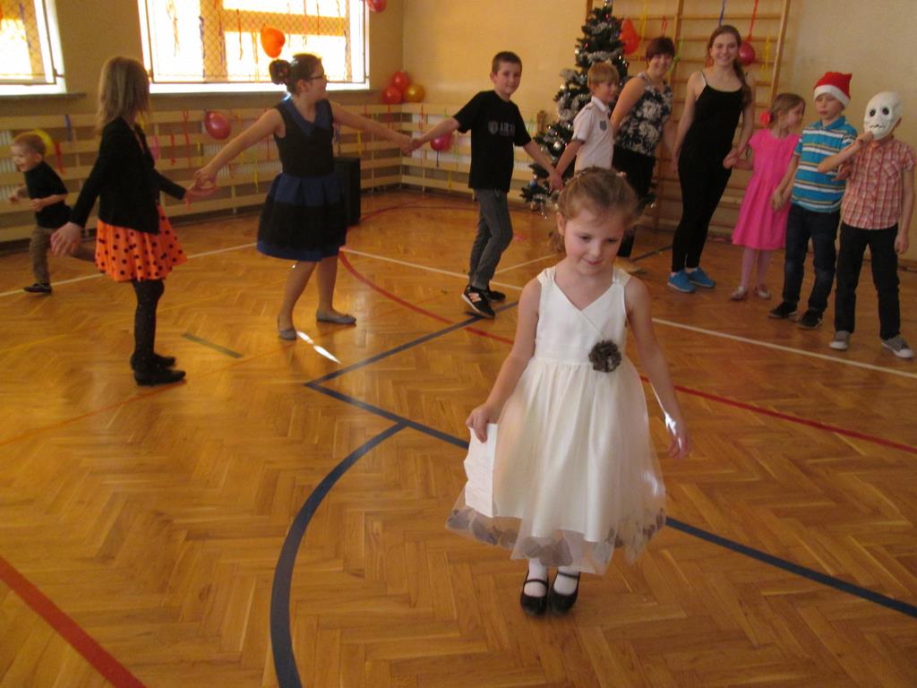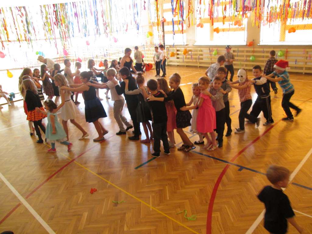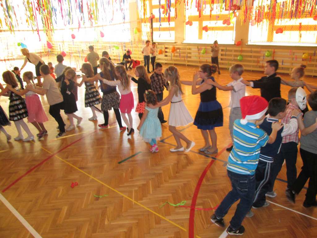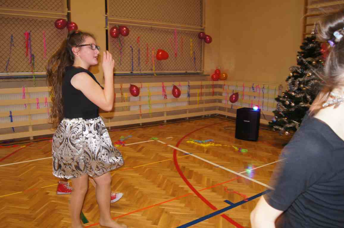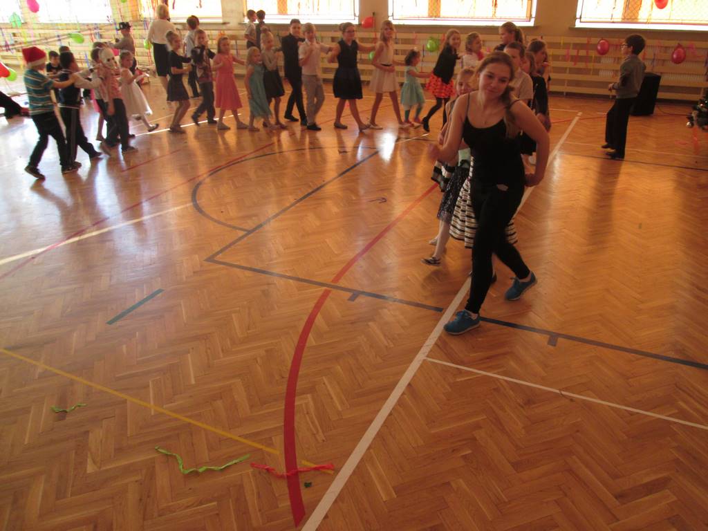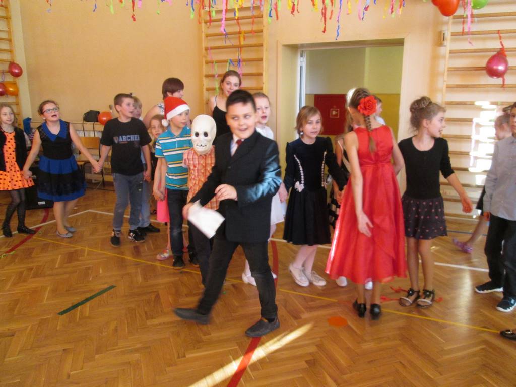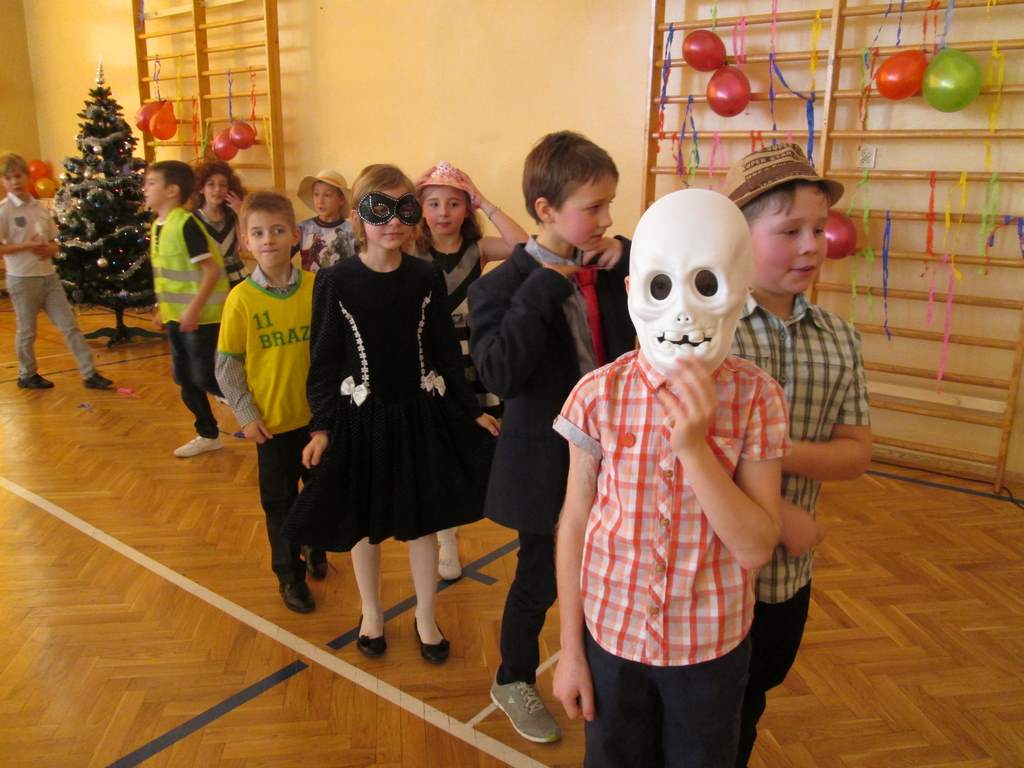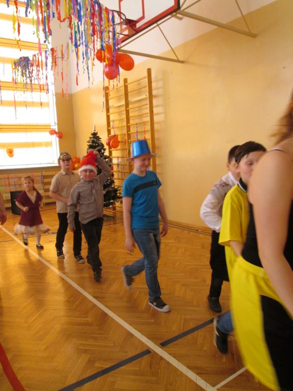 W pięknie udekorowanej sali czas mijał bardzo szybko. Młodsi uczniowie wystrojeni w piękne, kolorowe stroje ochoczo brali udział w tańcach i zabawach proponowanych przez prowadzącą imprezę przewodniczącą Rady Rodziców, p. Agnieszkę Michniak, dzielnie wspieraną przez byłą uczennicę naszej szkoły, Ewelinę Cegielską. Obie panie nie szczędziły wysiłków, by nasi najmłodsi z choinki wyszli wybawieni, zmęczeni, ale przede wszystkim zadowoleni. Jednym z przerywników, a zarazem kulminacyjnym punktem programu było przyniesienie na środek sali ogromnego worka pełnego przeróżnych strojów, masek itp., z którego ochotnicy losowali dla siebie przebrania…Nie trzeba dodawać, że chętni byli wszyscy, a losowane stroje najczęściej dostarczały mnóstwa powodów do śmiechu.