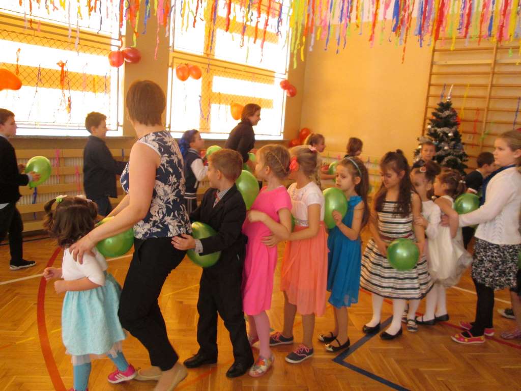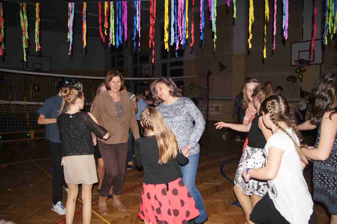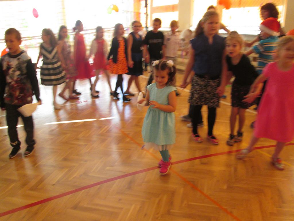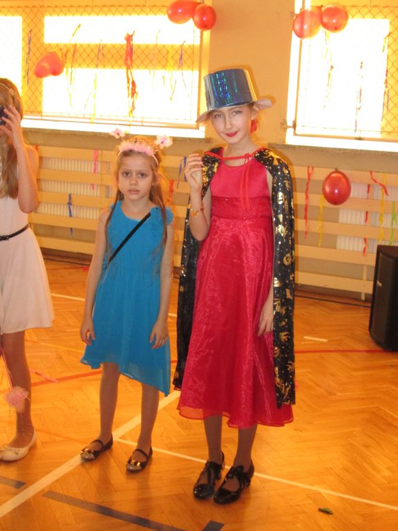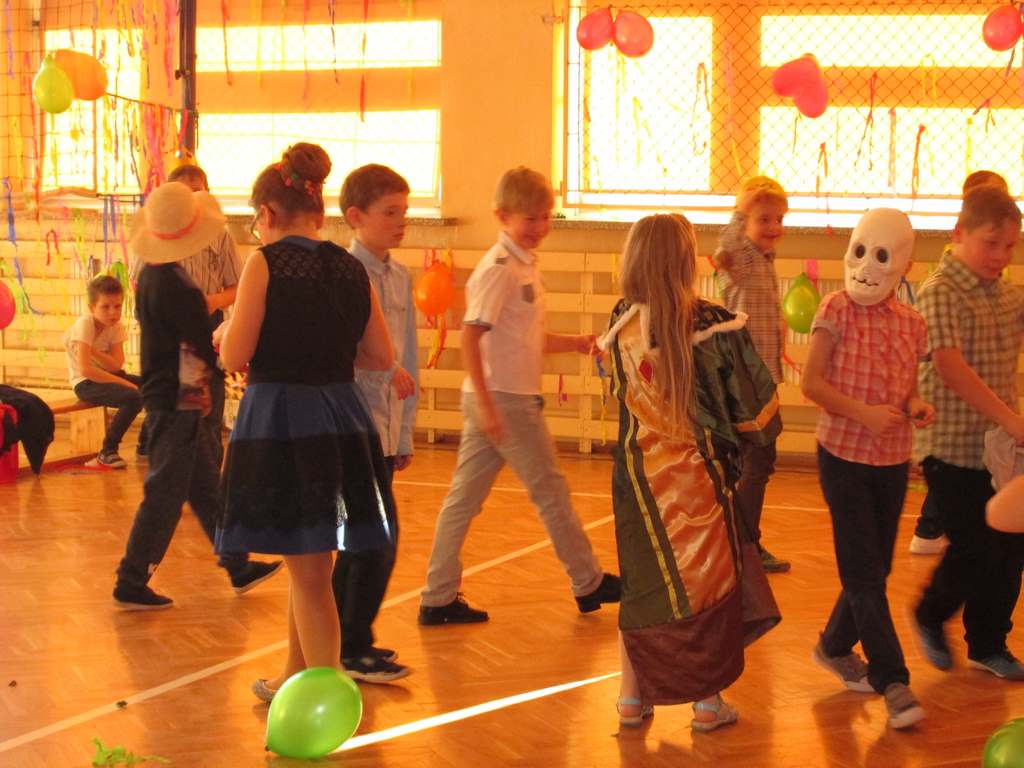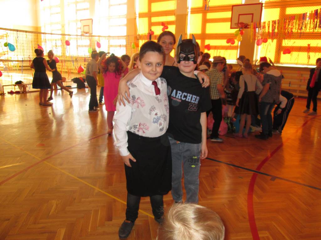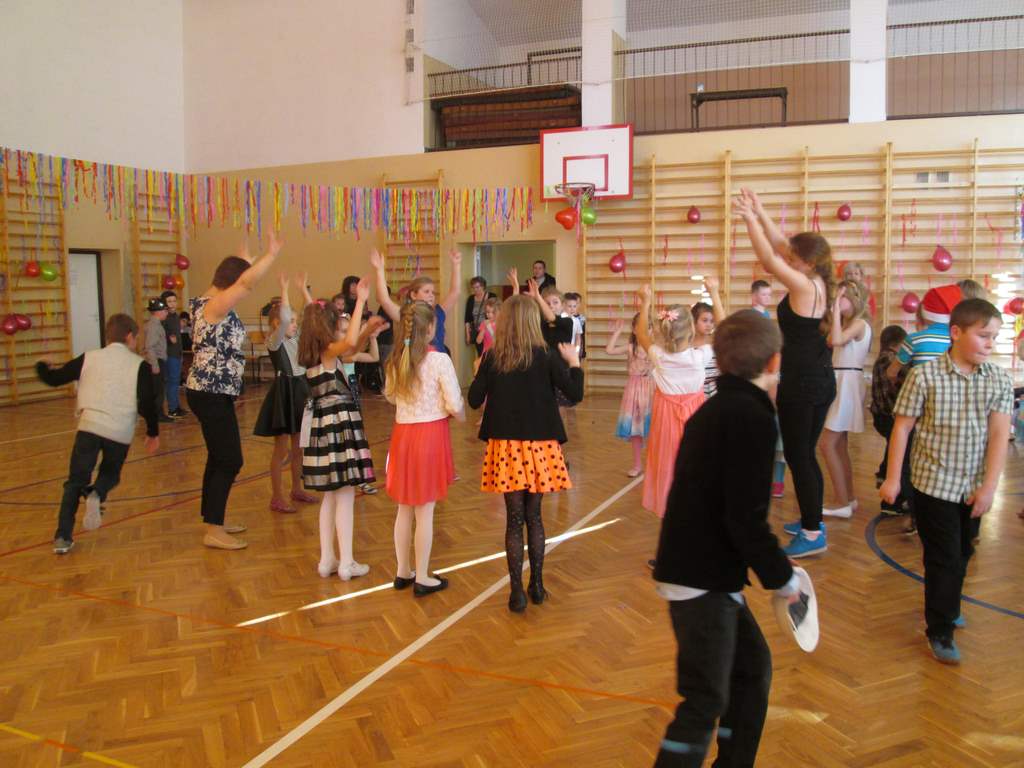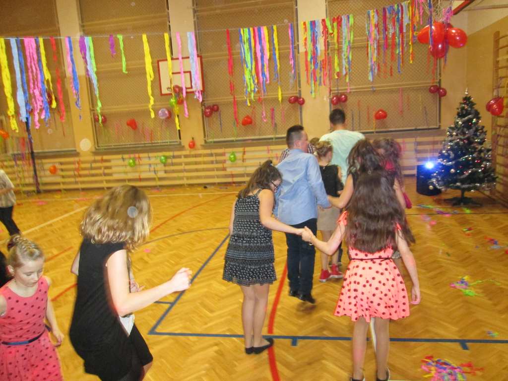 W pięknie udekorowanej sali czas mijał bardzo szybko. Młodsi uczniowie wystrojeni w piękne, kolorowe stroje ochoczo brali udział w tańcach i zabawach proponowanych przez prowadzącą imprezę przewodniczącą Rady Rodziców, p. Agnieszkę Michniak, dzielnie wspieraną przez byłą uczennicę naszej szkoły, Ewelinę Cegielską. Obie panie nie szczędziły wysiłków, by nasi najmłodsi z choinki wyszli wybawieni, zmęczeni, ale przede wszystkim zadowoleni. Jednym z przerywników, a zarazem kulminacyjnym punktem programu było przyniesienie na środek sali ogromnego worka pełnego przeróżnych strojów, masek itp., z którego ochotnicy losowali dla siebie przebrania…Nie trzeba dodawać, że chętni byli wszyscy, a losowane stroje najczęściej dostarczały mnóstwa powodów do śmiechu.