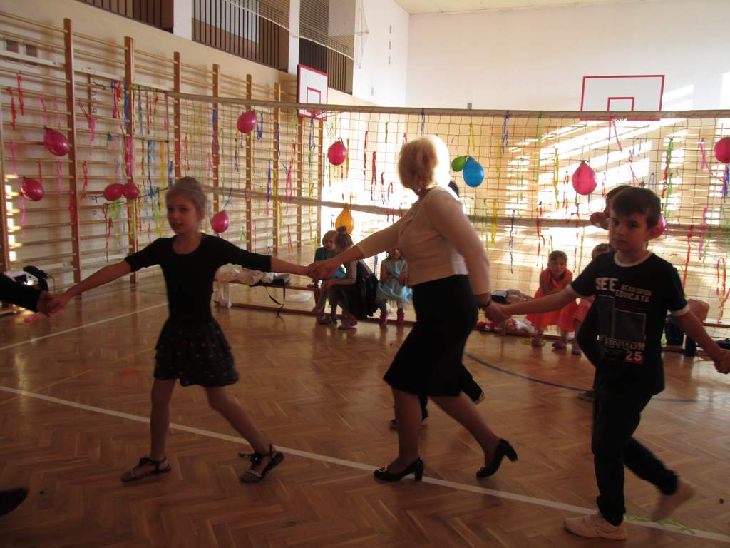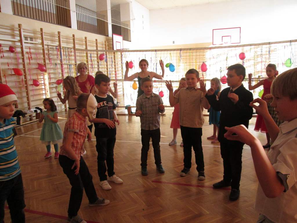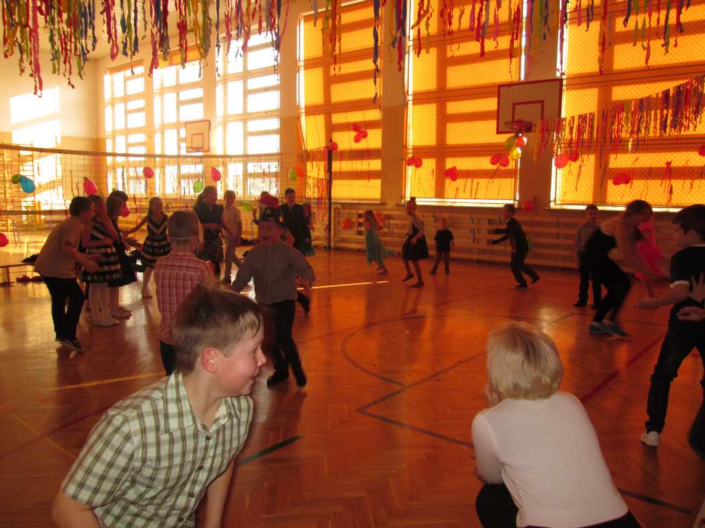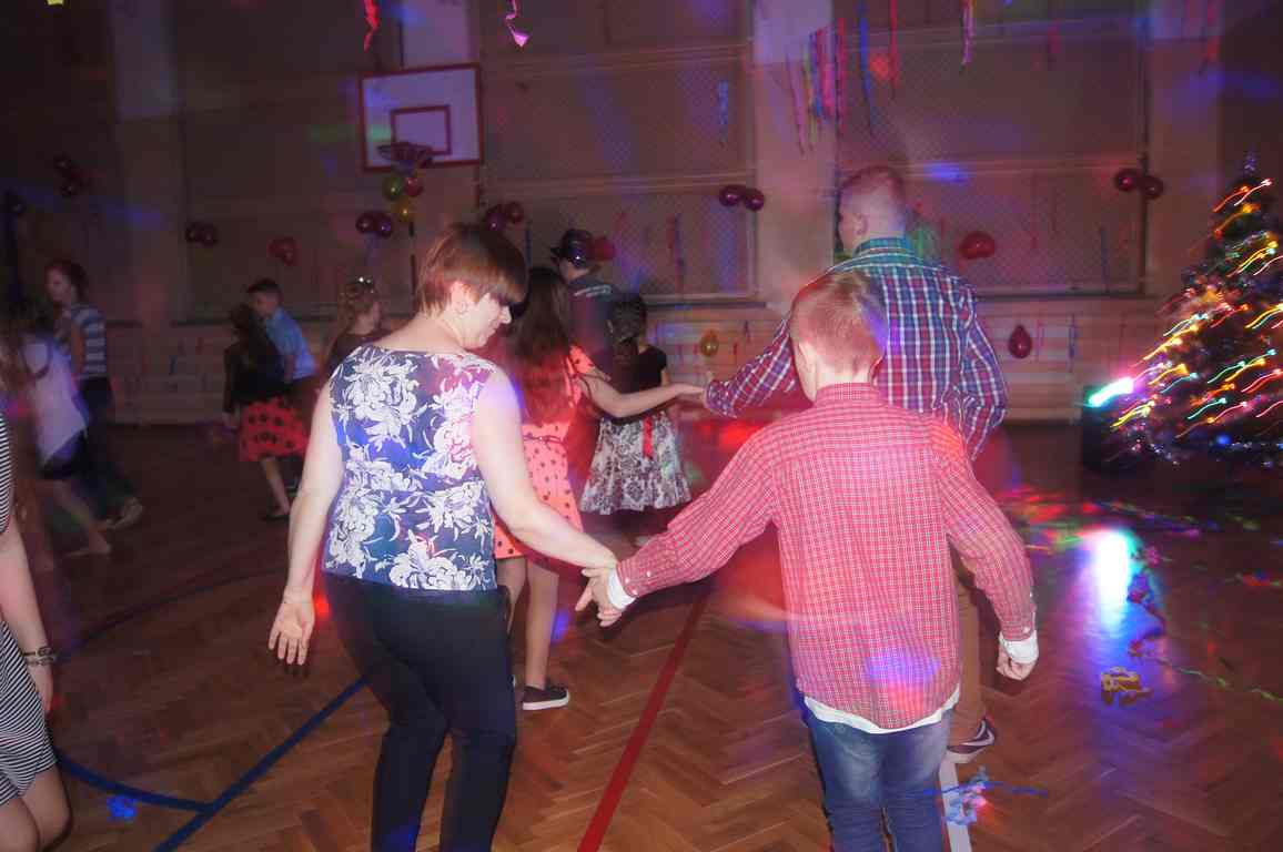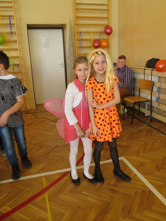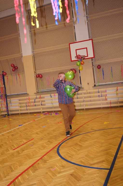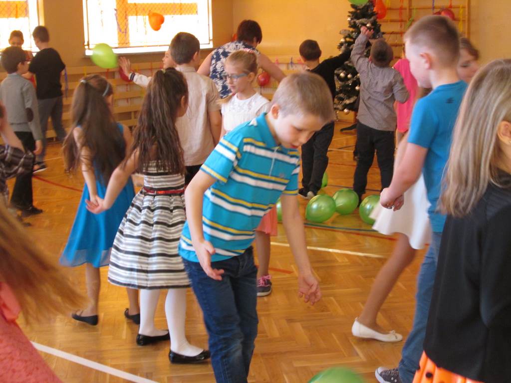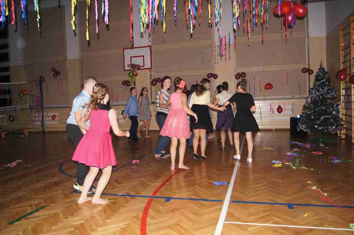 W pięknie udekorowanej sali czas mijał bardzo szybko. Młodsi uczniowie wystrojeni w piękne, kolorowe stroje ochoczo brali udział w tańcach i zabawach proponowanych przez prowadzącą imprezę przewodniczącą Rady Rodziców, p. Agnieszkę Michniak, dzielnie wspieraną przez byłą uczennicę naszej szkoły, Ewelinę Cegielską. Obie panie nie szczędziły wysiłków, by nasi najmłodsi z choinki wyszli wybawieni, zmęczeni, ale przede wszystkim zadowoleni. Jednym z przerywników, a zarazem kulminacyjnym punktem programu było przyniesienie na środek sali ogromnego worka pełnego przeróżnych strojów, masek itp., z którego ochotnicy losowali dla siebie przebrania…Nie trzeba dodawać, że chętni byli wszyscy, a losowane stroje najczęściej dostarczały mnóstwa powodów do śmiechu.