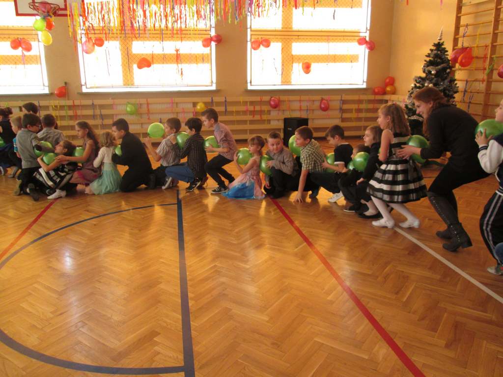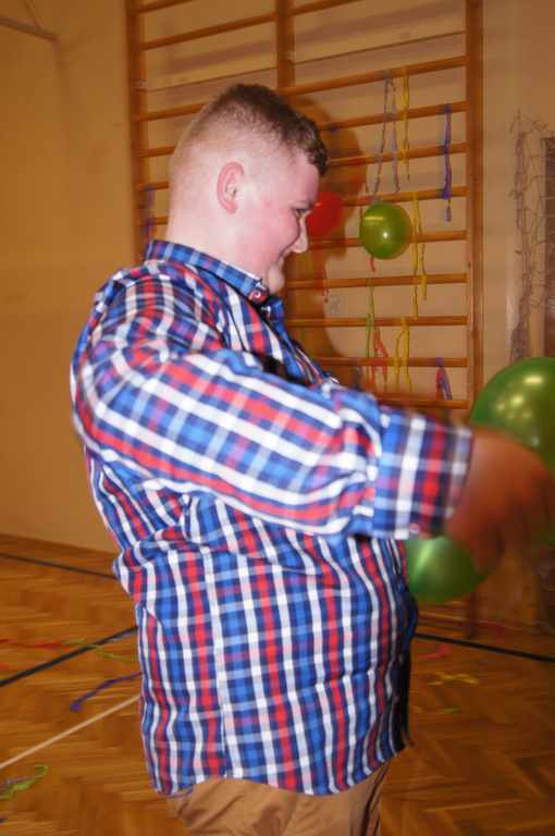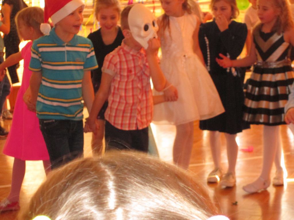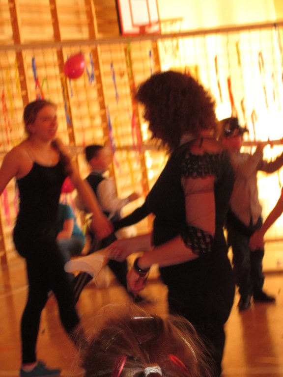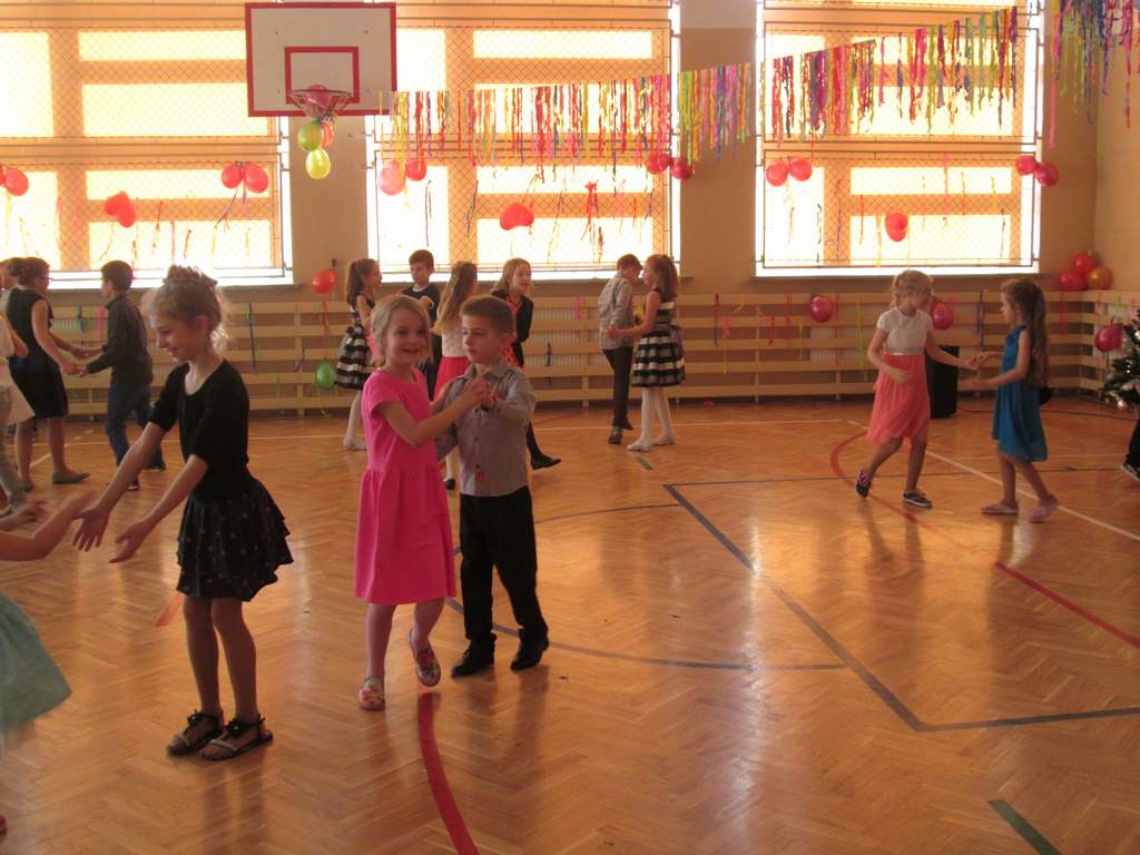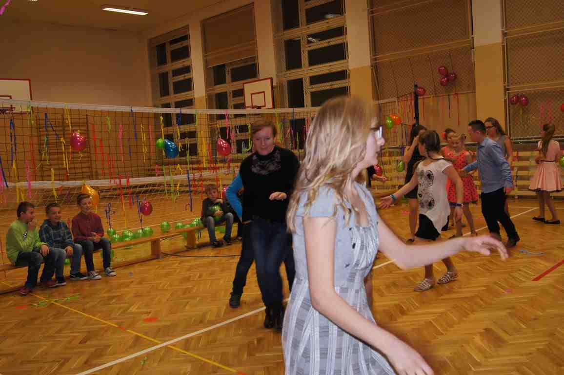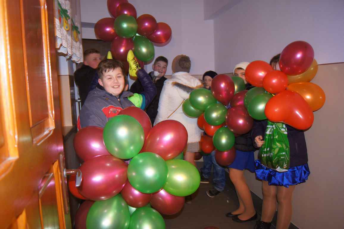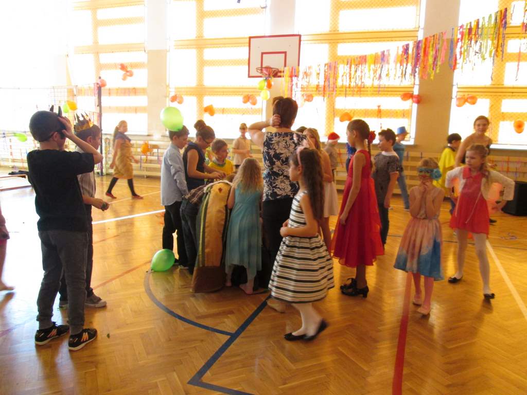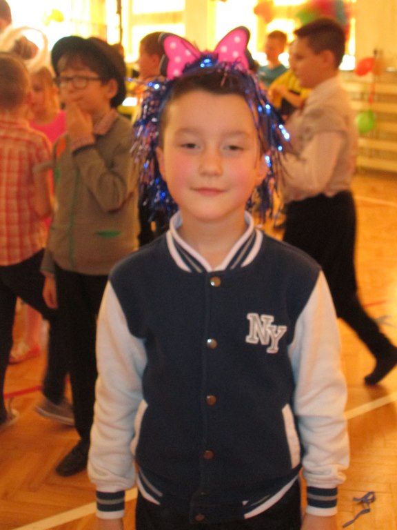 W pięknie udekorowanej sali czas mijał bardzo szybko. Młodsi uczniowie wystrojeni w piękne, kolorowe stroje ochoczo brali udział w tańcach i zabawach proponowanych przez prowadzącą imprezę przewodniczącą Rady Rodziców, p. Agnieszkę Michniak, dzielnie wspieraną przez byłą uczennicę naszej szkoły, Ewelinę Cegielską. Obie panie nie szczędziły wysiłków, by nasi najmłodsi z choinki wyszli wybawieni, zmęczeni, ale przede wszystkim zadowoleni. Jednym z przerywników, a zarazem kulminacyjnym punktem programu było przyniesienie na środek sali ogromnego worka pełnego przeróżnych strojów, masek itp., z którego ochotnicy losowali dla siebie przebrania…Nie trzeba dodawać, że chętni byli wszyscy, a losowane stroje najczęściej dostarczały mnóstwa powodów do śmiechu.