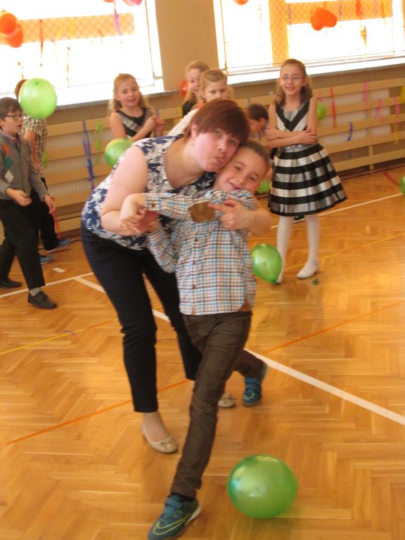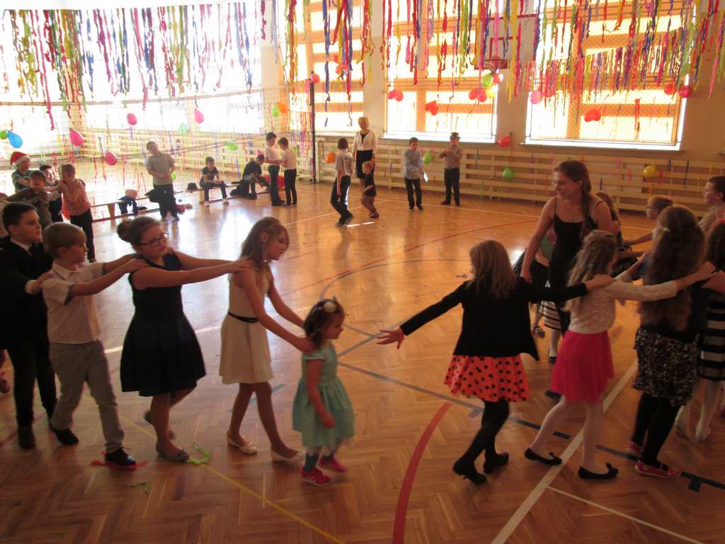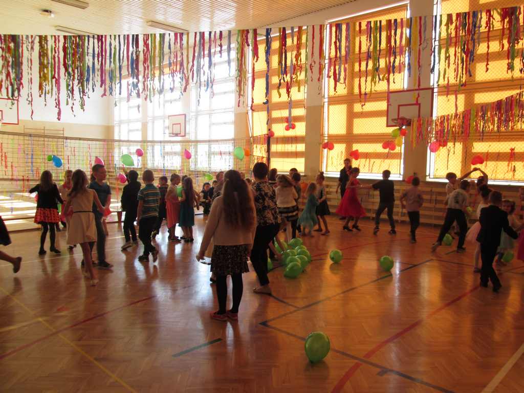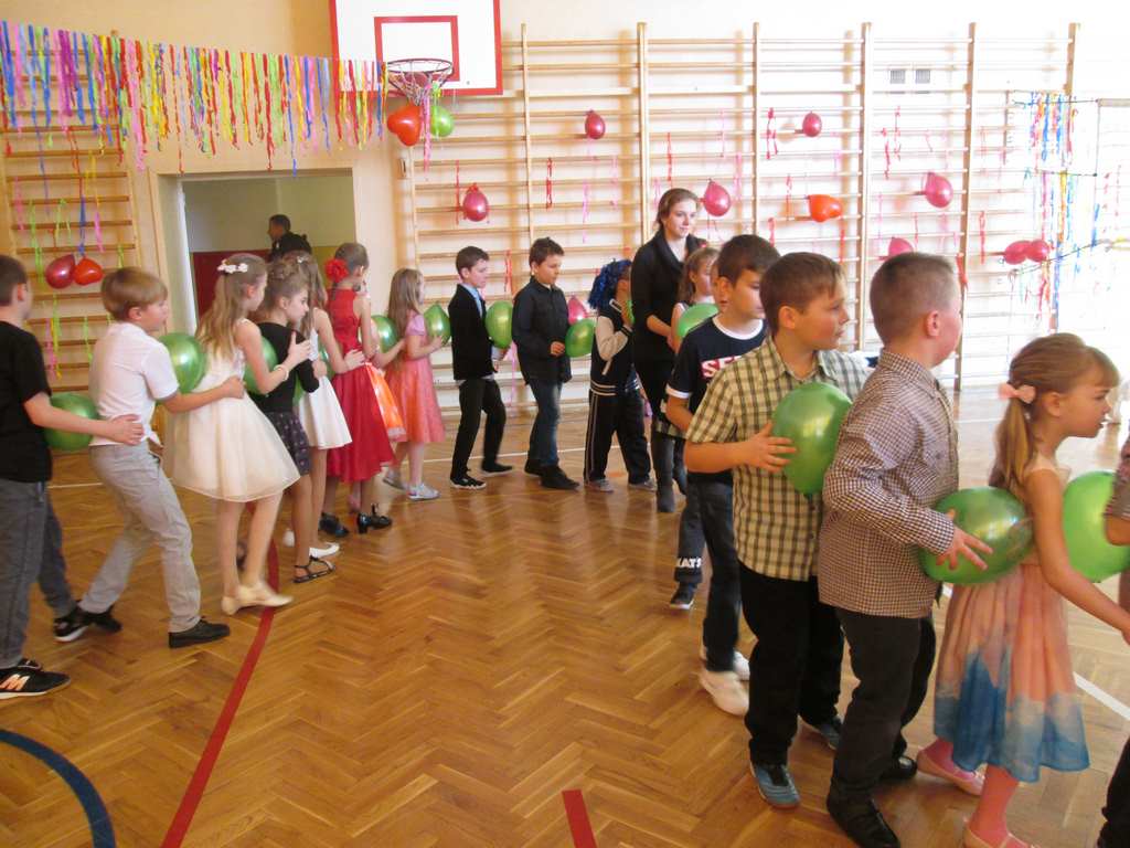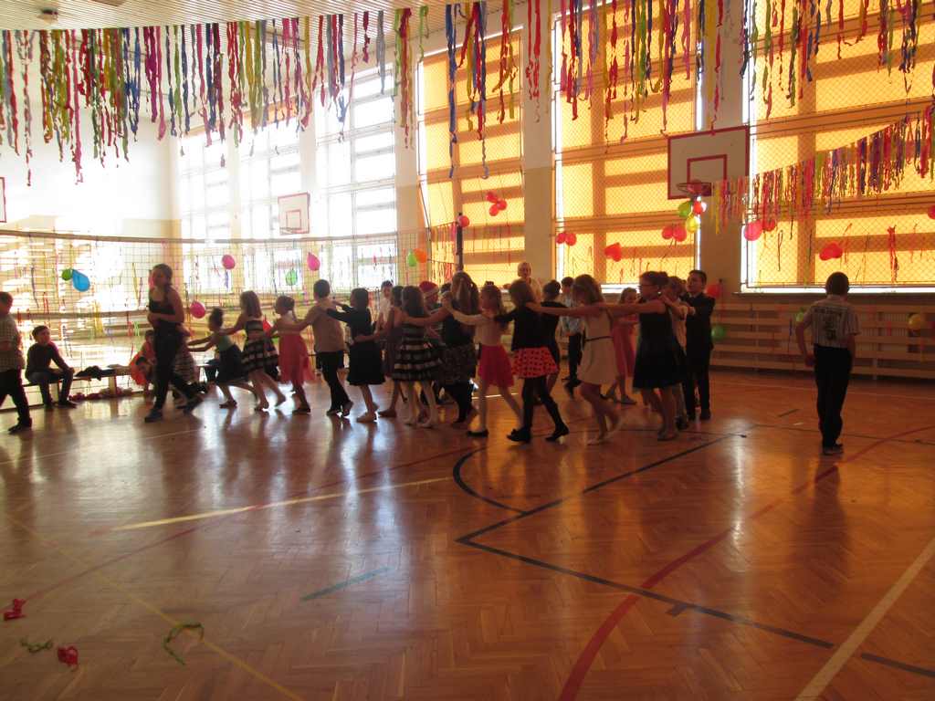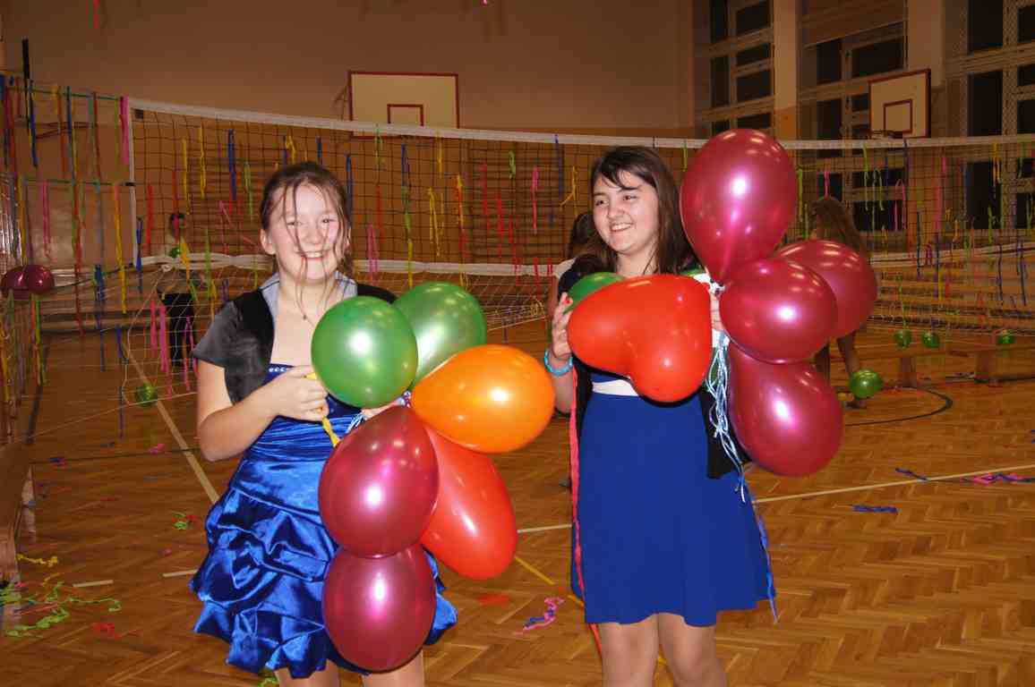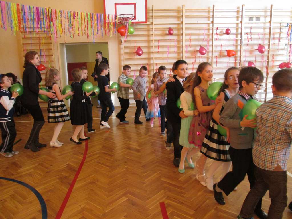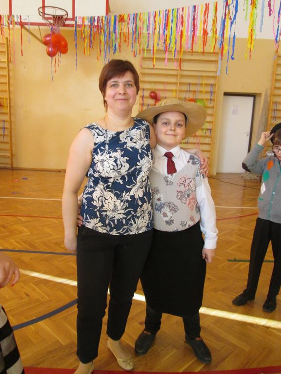 W pięknie udekorowanej sali czas mijał bardzo szybko. Młodsi uczniowie wystrojeni w piękne, kolorowe stroje ochoczo brali udział w tańcach i zabawach proponowanych przez prowadzącą imprezę przewodniczącą Rady Rodziców, p. Agnieszkę Michniak, dzielnie wspieraną przez byłą uczennicę naszej szkoły, Ewelinę Cegielską. Obie panie nie szczędziły wysiłków, by nasi najmłodsi z choinki wyszli wybawieni, zmęczeni, ale przede wszystkim zadowoleni. Jednym z przerywników, a zarazem kulminacyjnym punktem programu było przyniesienie na środek sali ogromnego worka pełnego przeróżnych strojów, masek itp., z którego ochotnicy losowali dla siebie przebrania…Nie trzeba dodawać, że chętni byli wszyscy, a losowane stroje najczęściej dostarczały mnóstwa powodów do śmiechu.