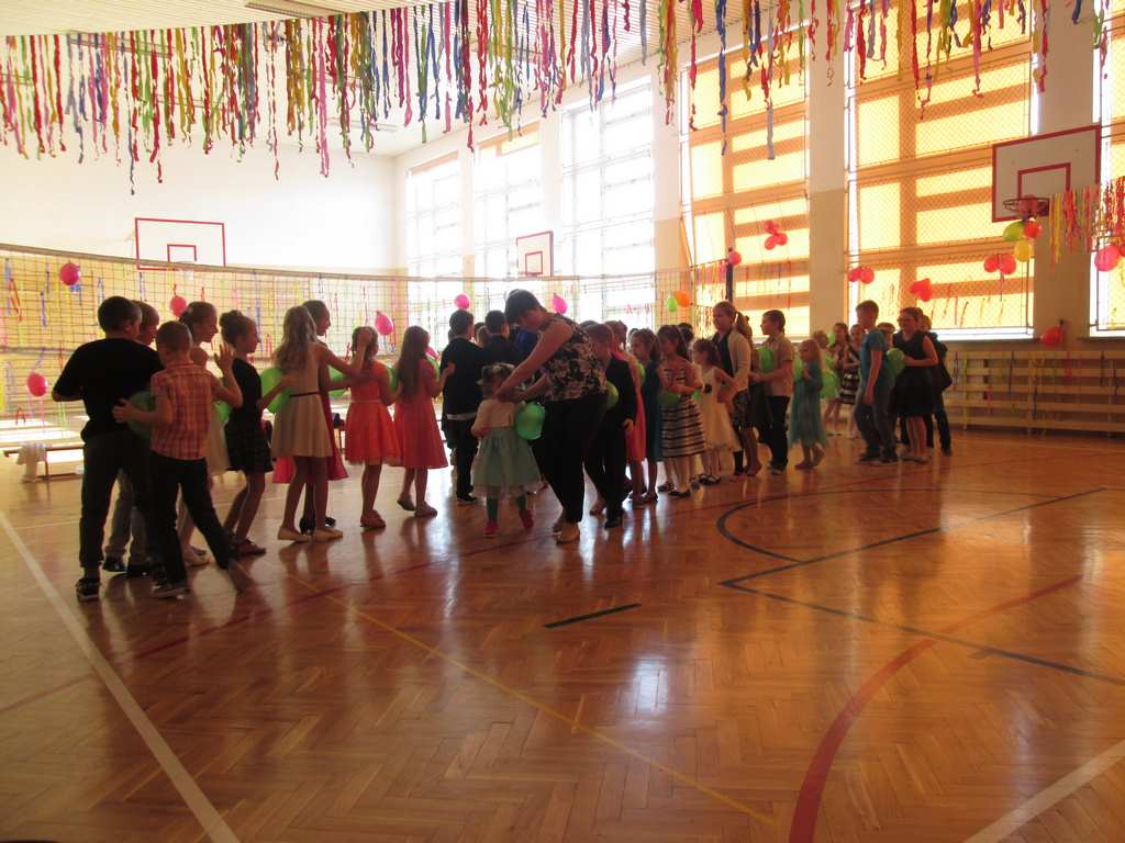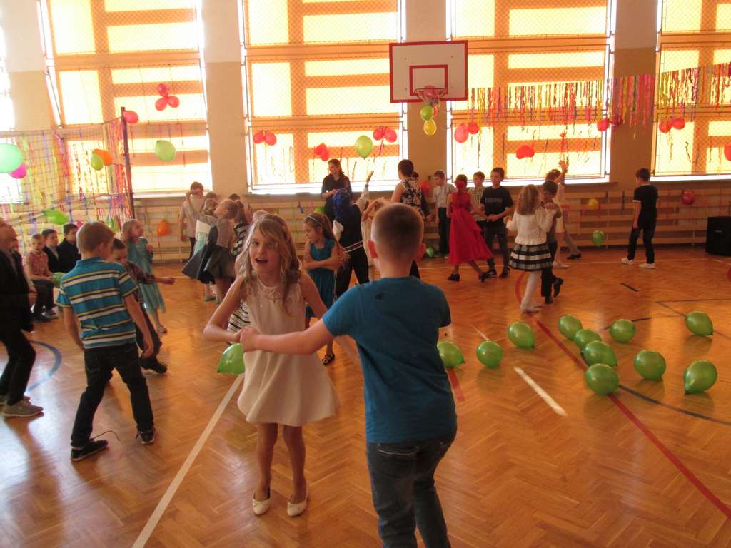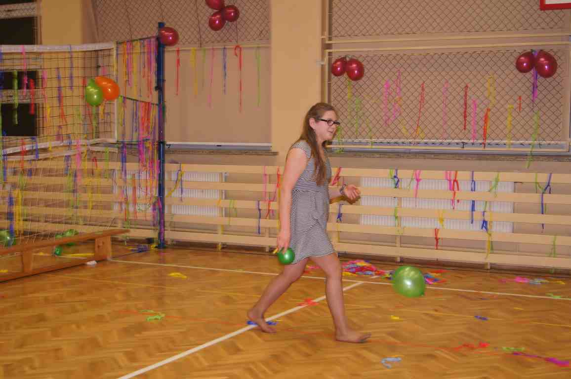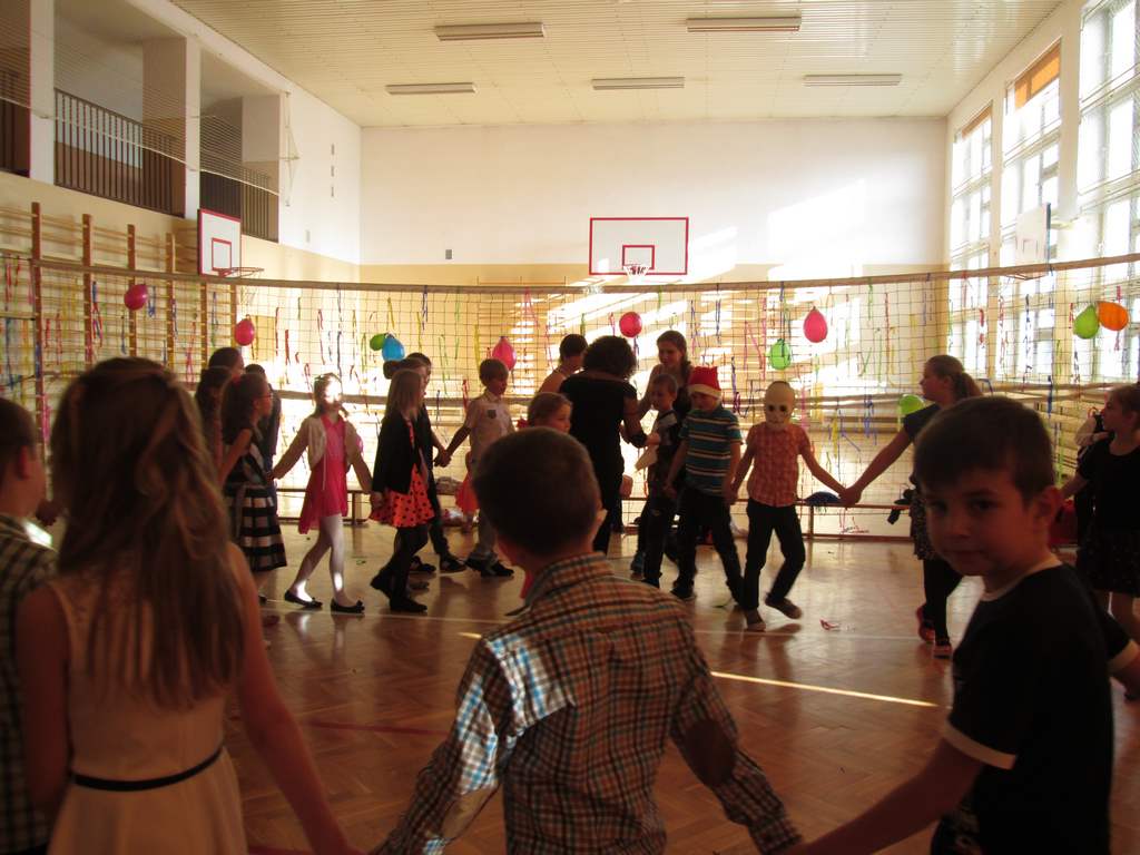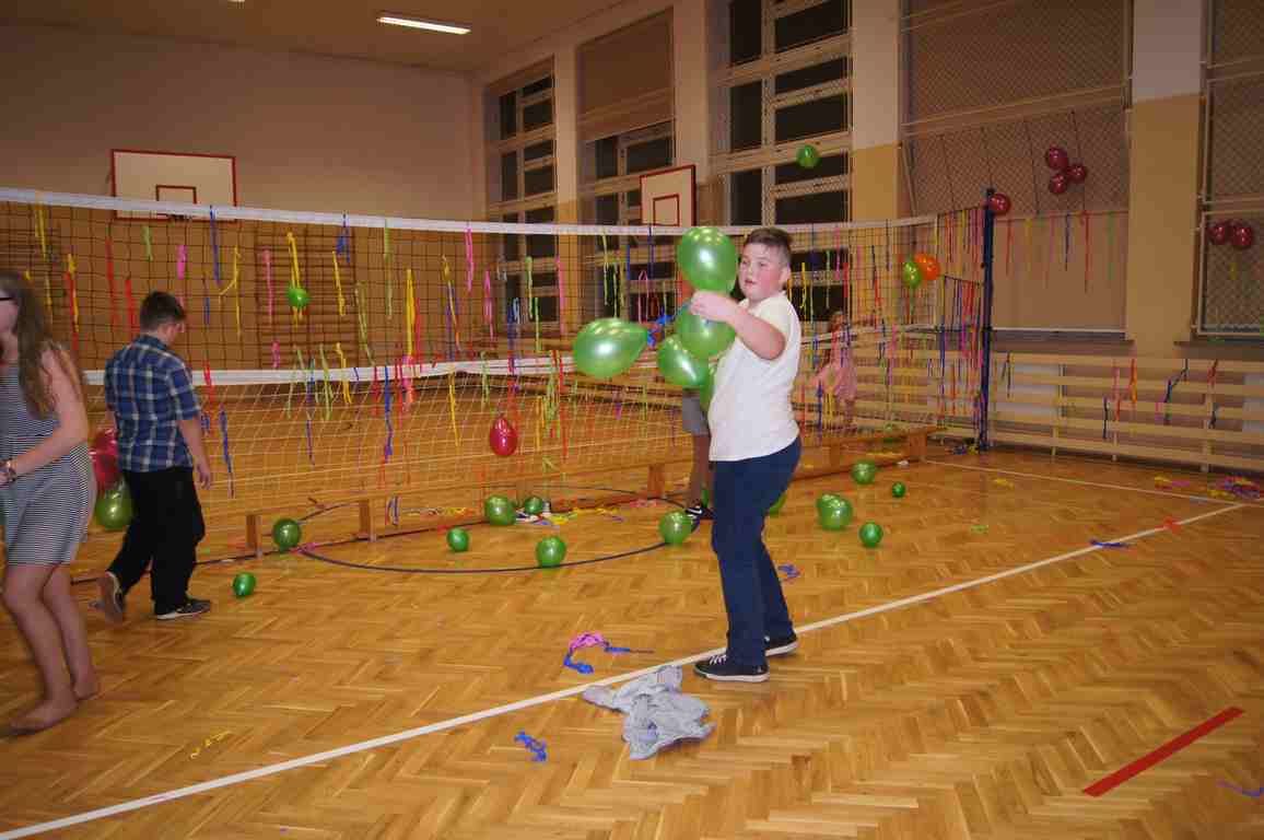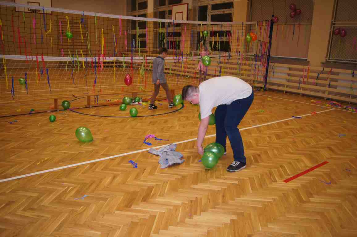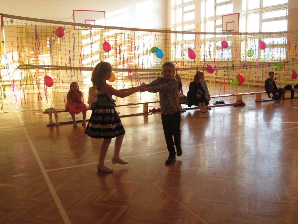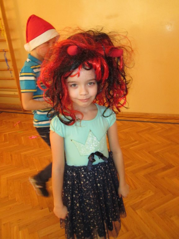 W pięknie udekorowanej sali czas mijał bardzo szybko. Młodsi uczniowie wystrojeni w piękne, kolorowe stroje ochoczo brali udział w tańcach i zabawach proponowanych przez prowadzącą imprezę przewodniczącą Rady Rodziców, p. Agnieszkę Michniak, dzielnie wspieraną przez byłą uczennicę naszej szkoły, Ewelinę Cegielską. Obie panie nie szczędziły wysiłków, by nasi najmłodsi z choinki wyszli wybawieni, zmęczeni, ale przede wszystkim zadowoleni. Jednym z przerywników, a zarazem kulminacyjnym punktem programu było przyniesienie na środek sali ogromnego worka pełnego przeróżnych strojów, masek itp., z którego ochotnicy losowali dla siebie przebrania…Nie trzeba dodawać, że chętni byli wszyscy, a losowane stroje najczęściej dostarczały mnóstwa powodów do śmiechu.