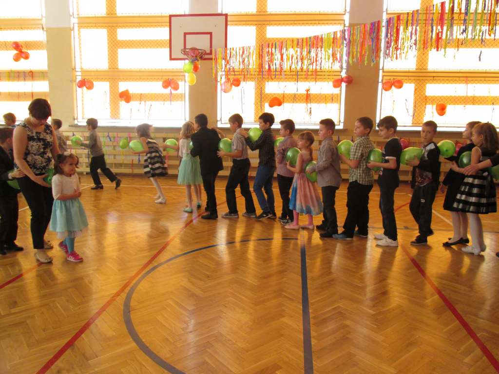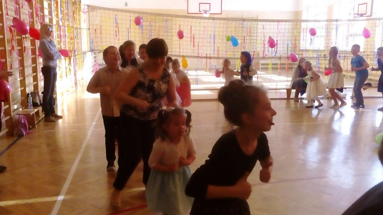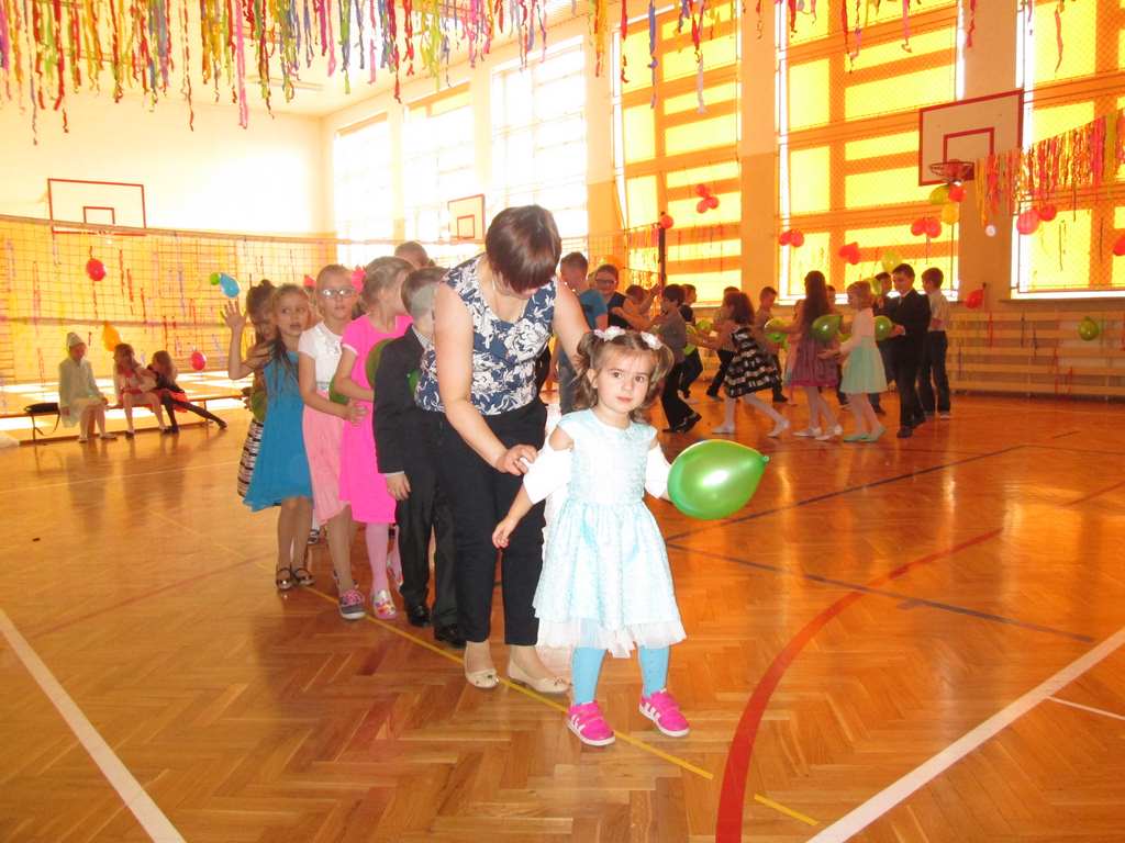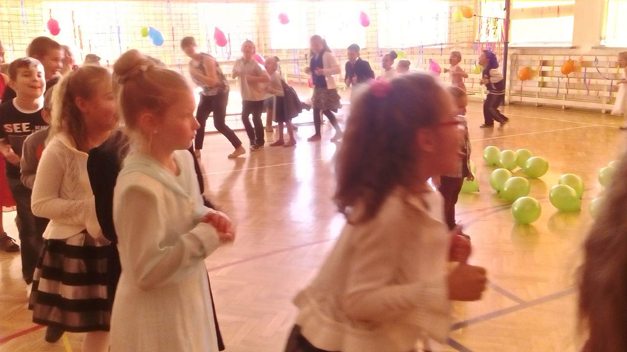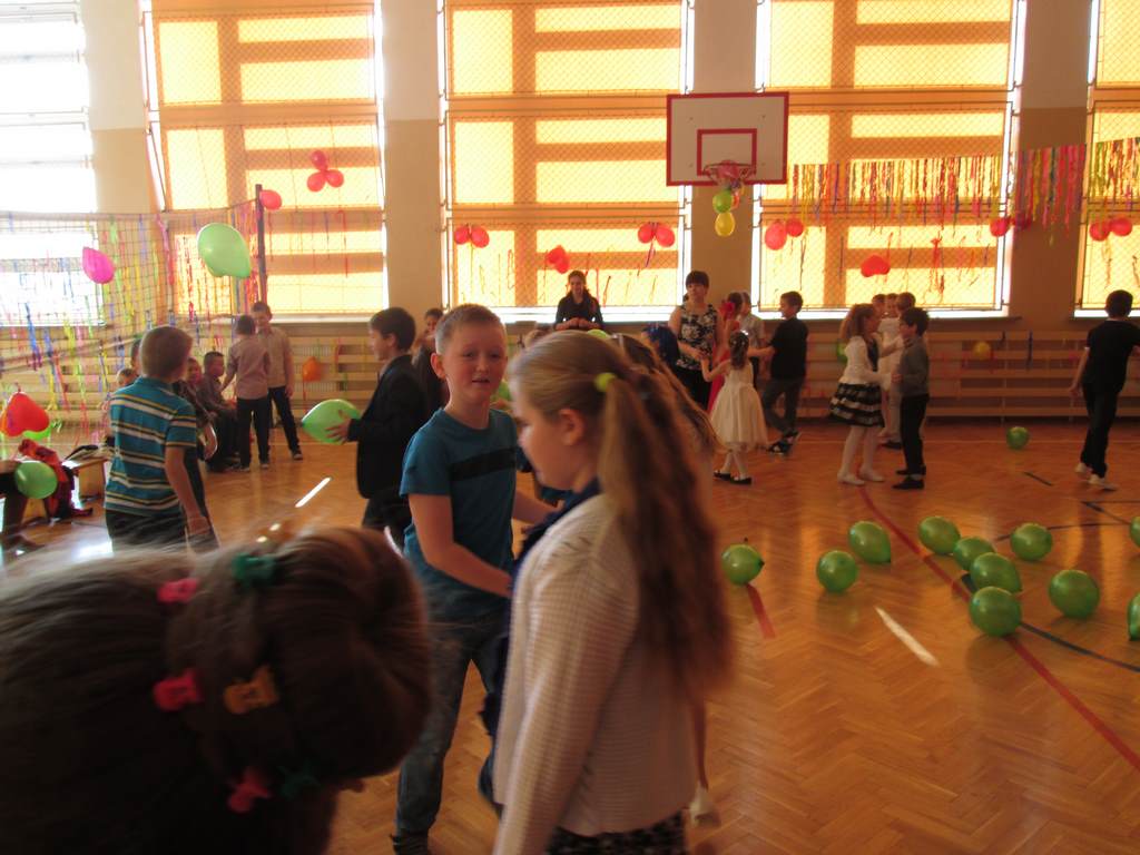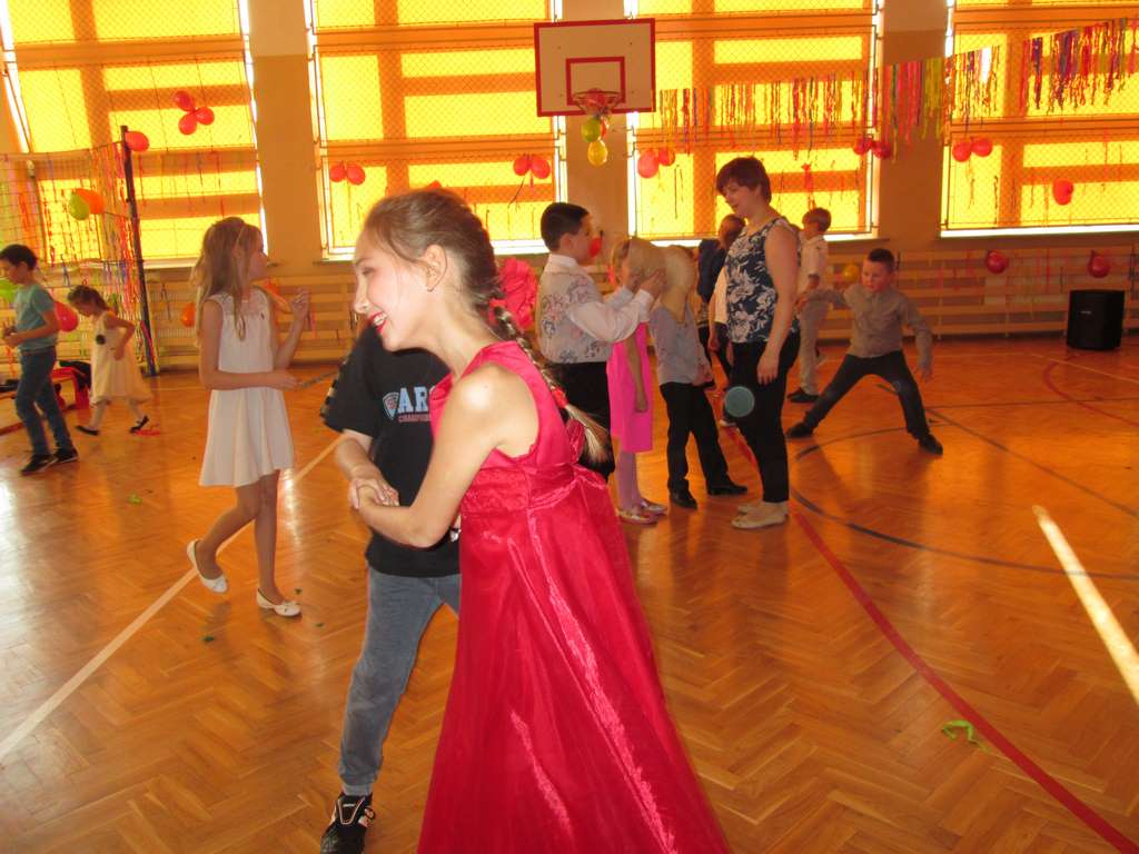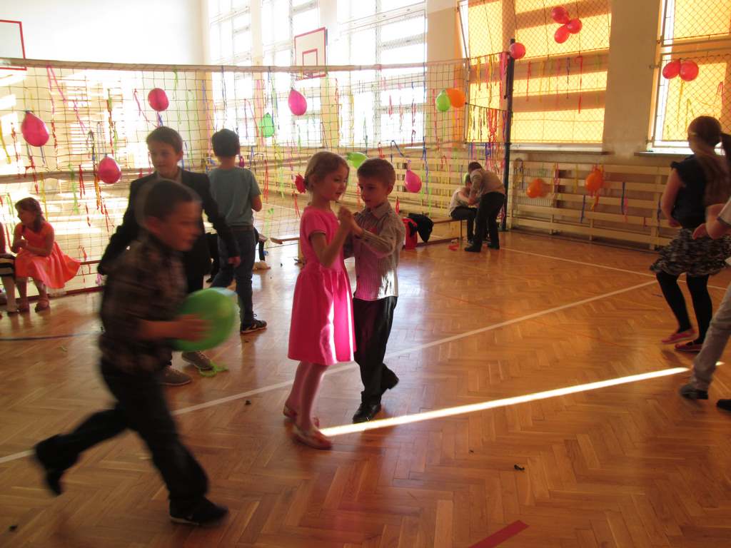 W pięknie udekorowanej sali czas mijał bardzo szybko. Młodsi uczniowie wystrojeni w piękne, kolorowe stroje ochoczo brali udział w tańcach i zabawach proponowanych przez prowadzącą imprezę przewodniczącą Rady Rodziców, p. Agnieszkę Michniak, dzielnie wspieraną przez byłą uczennicę naszej szkoły, Ewelinę Cegielską. Obie panie nie szczędziły wysiłków, by nasi najmłodsi z choinki wyszli wybawieni, zmęczeni, ale przede wszystkim zadowoleni. Jednym z przerywników, a zarazem kulminacyjnym punktem programu było przyniesienie na środek sali ogromnego worka pełnego przeróżnych strojów, masek itp., z którego ochotnicy losowali dla siebie przebrania…Nie trzeba dodawać, że chętni byli wszyscy, a losowane stroje najczęściej dostarczały mnóstwa powodów do śmiechu.