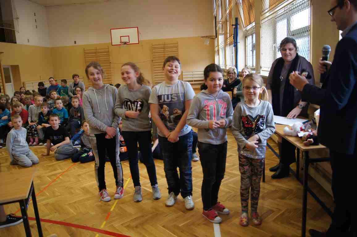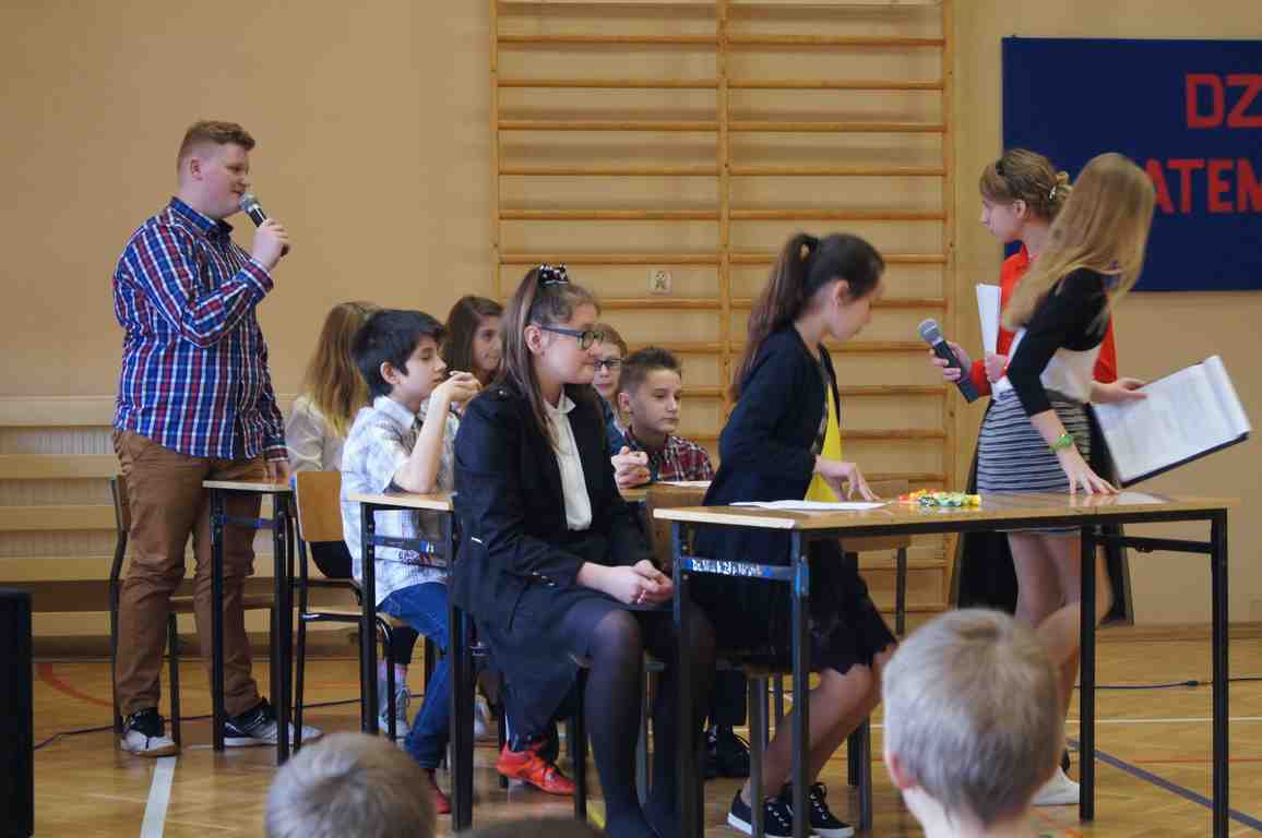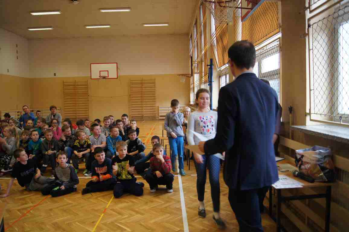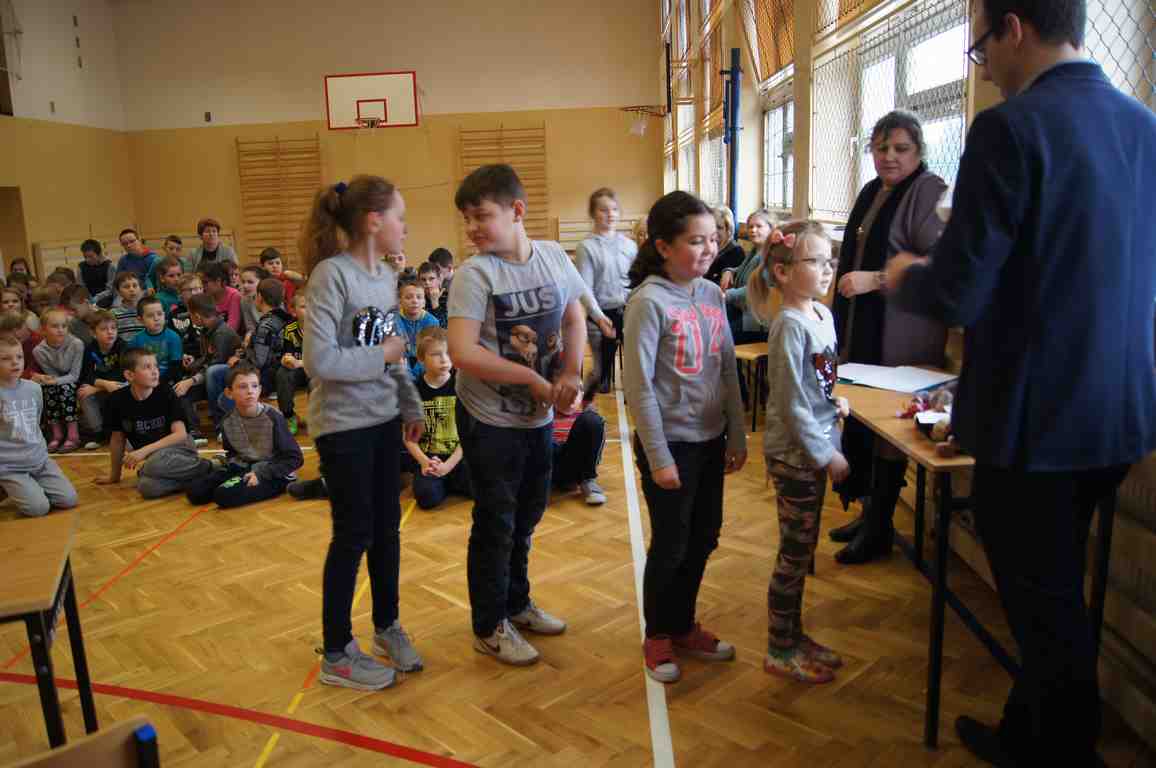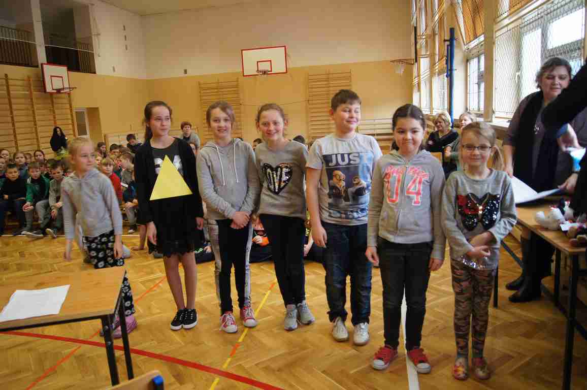 Szóstoklasiści w krótkiej inscenizacji przedstawili niewątpliwą przydatność znajomości zagadnień matematycznych w codziennym życiu i wykazali, że jest ona obecna w zasadzie we wszystkich jego dziedzinach. Ponadto uczniowie poprzez krótkie konkursy przeprowadzane zarówno na sali gimnastycznej, jak i w trakcie przerw na szkolnych korytarzach sprawdzili również umiejętność liczenia wśród dzieci i nauczycieli z naszej szkoły każdą poprawną odpowiedź nagradzając słodyczami. Tym sposobem przekonaliśmy się, jak przyjemnie jest znać matematykę 🙂