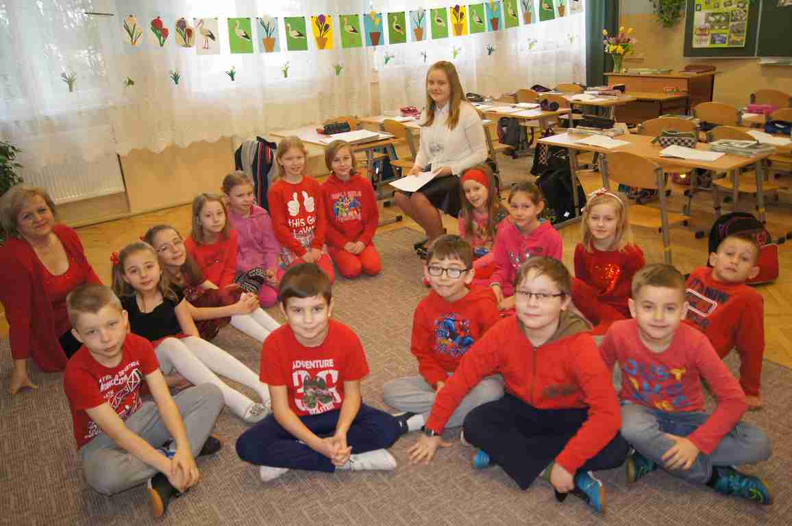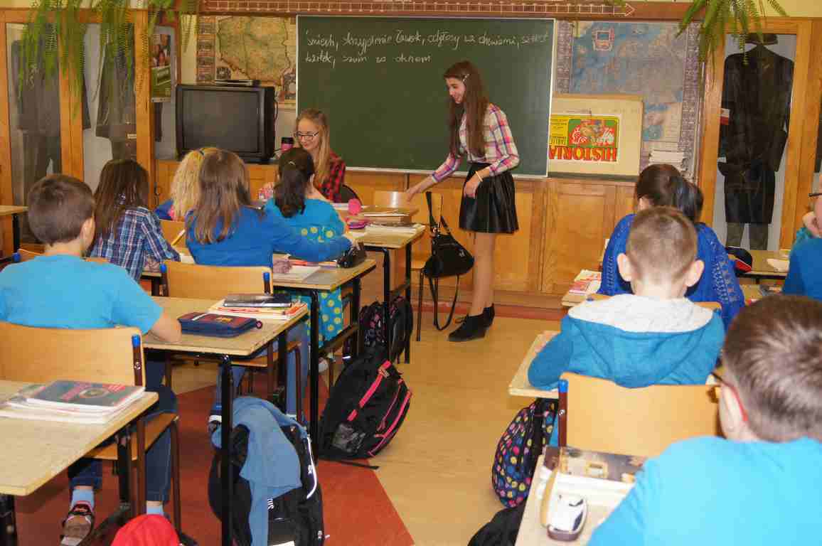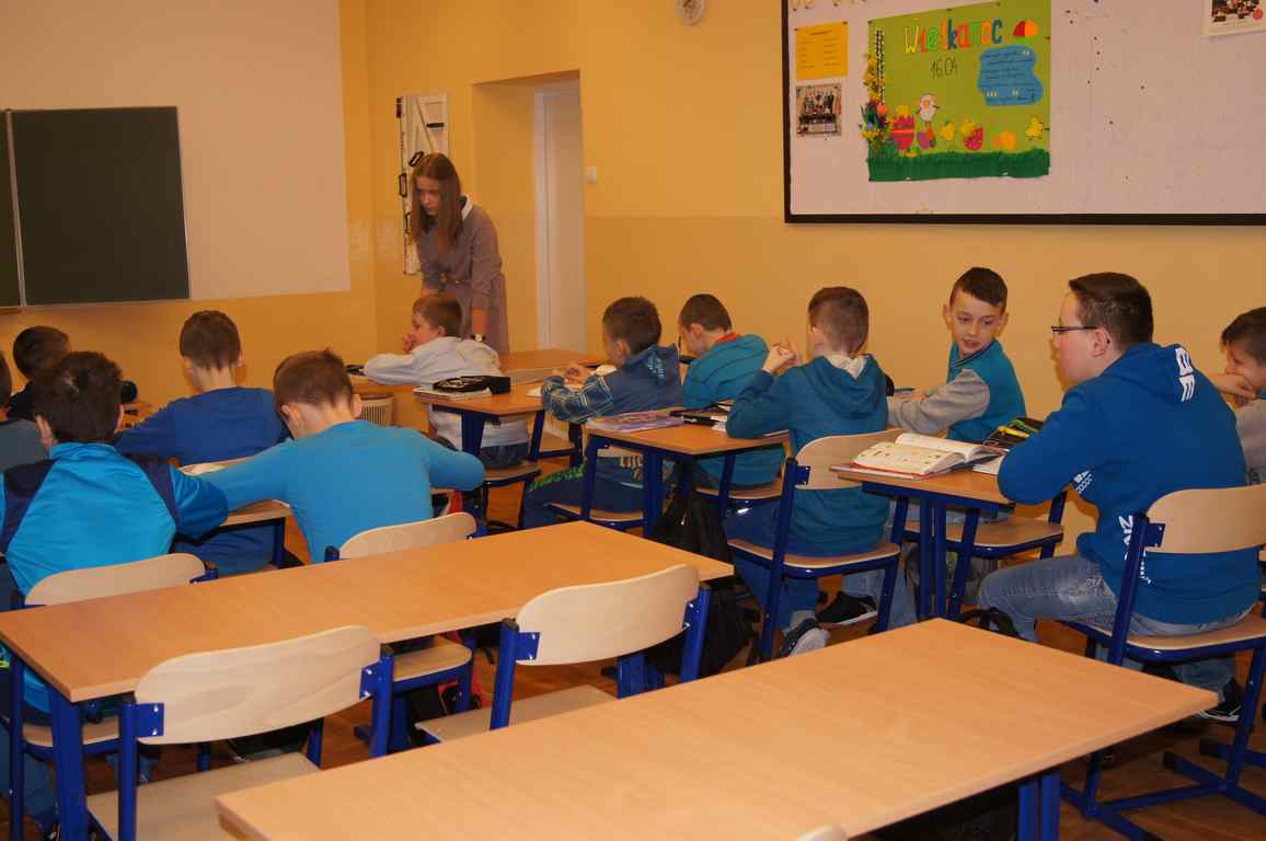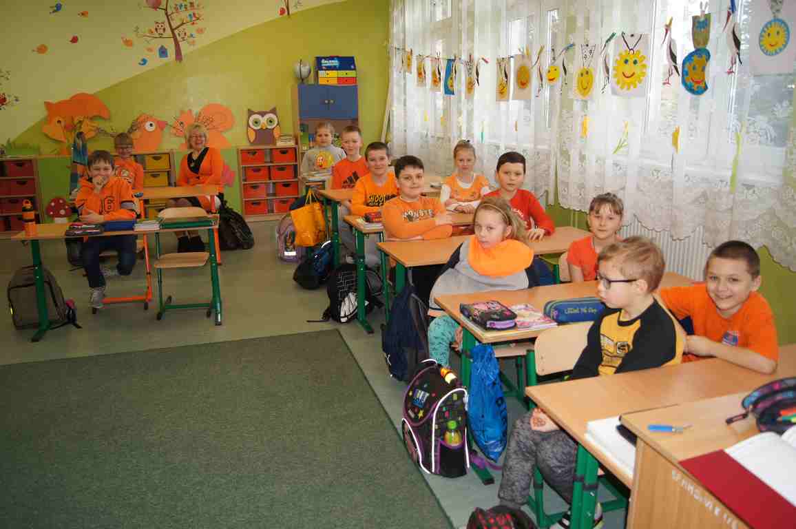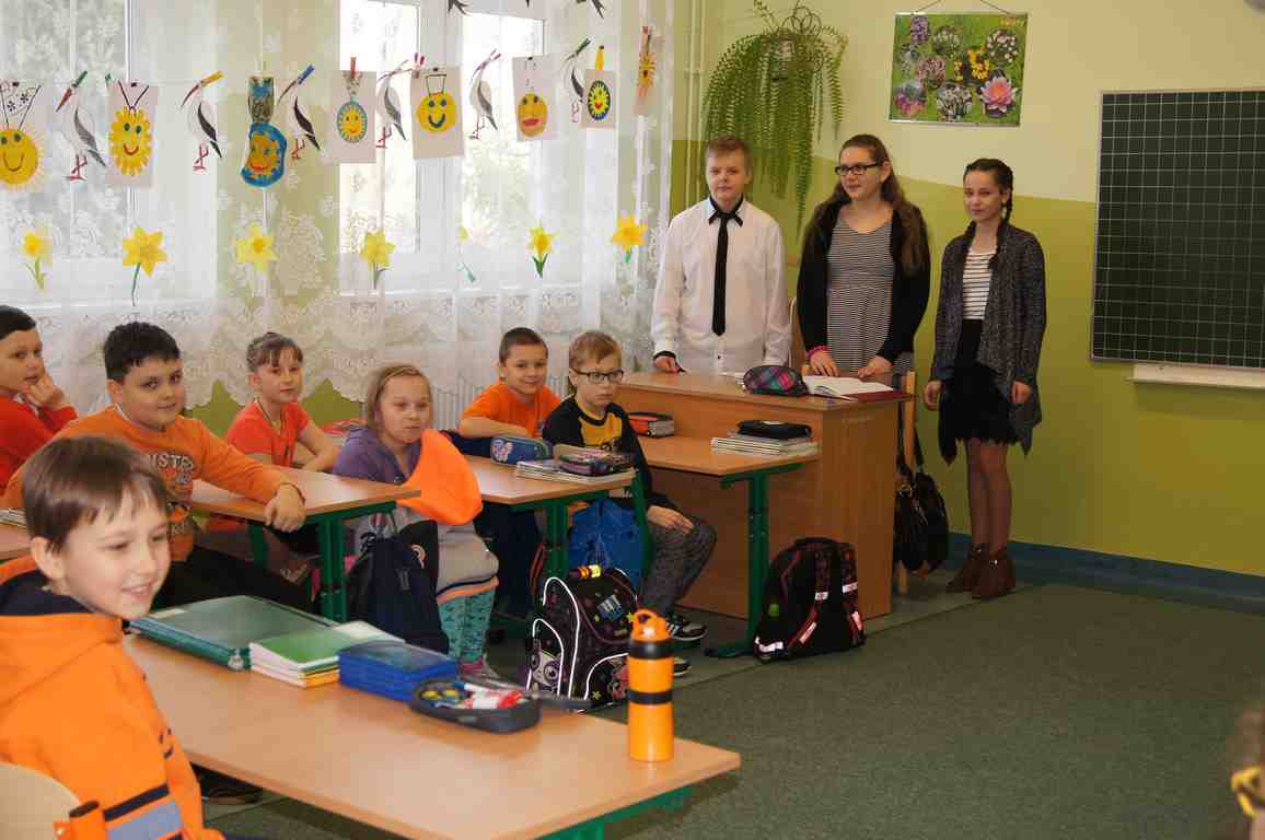 Podobnie rzecz się miała w tym roku. Samorząd Uczniowski, jako dodatkowy obowiązek, wprowadził w owym dniu nakaz założenia jednolitego kolorystycznie stroju. Każda klasa wylosowała kolor, w jakim należący do danego zespołu uczniowie mieli pojawić się 21 marca w szkole. Pomysł spotkał się z dużym zrozumieniem, dzięki czemu pierwszego dnia wiosny nasze dzieciaki na korytarzach tworzyły barwną tęczę. Szóstoklasiści, jako nauczyciele, spisali się znakomicie – przygotowani i odpowiedzialni z ogromnym zaangażowaniem pełnili swe obowiązki. Dla nauczycieli była to zaś bardzo dobra okazja, aby na swoją pracę popatrzeć trochę z innej perspektywy – perspektywy tego, który siedząc w ławce robi co może, by nie zwracać na siebie zbytniej uwagi 🙂