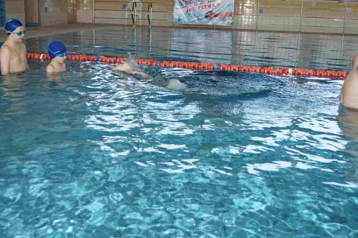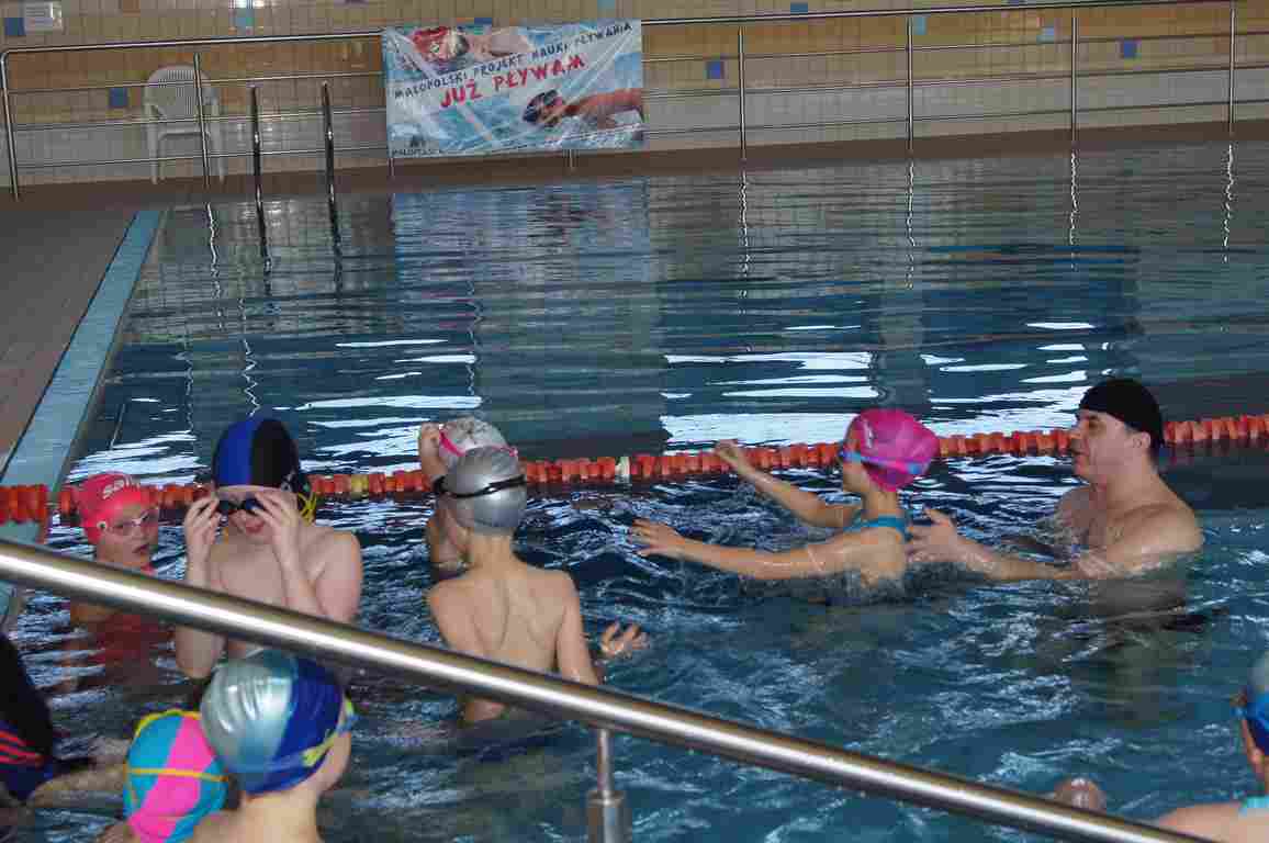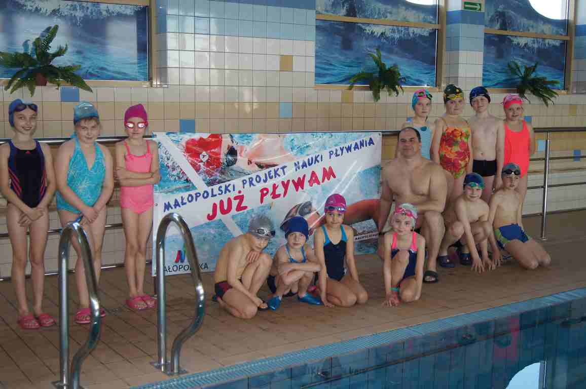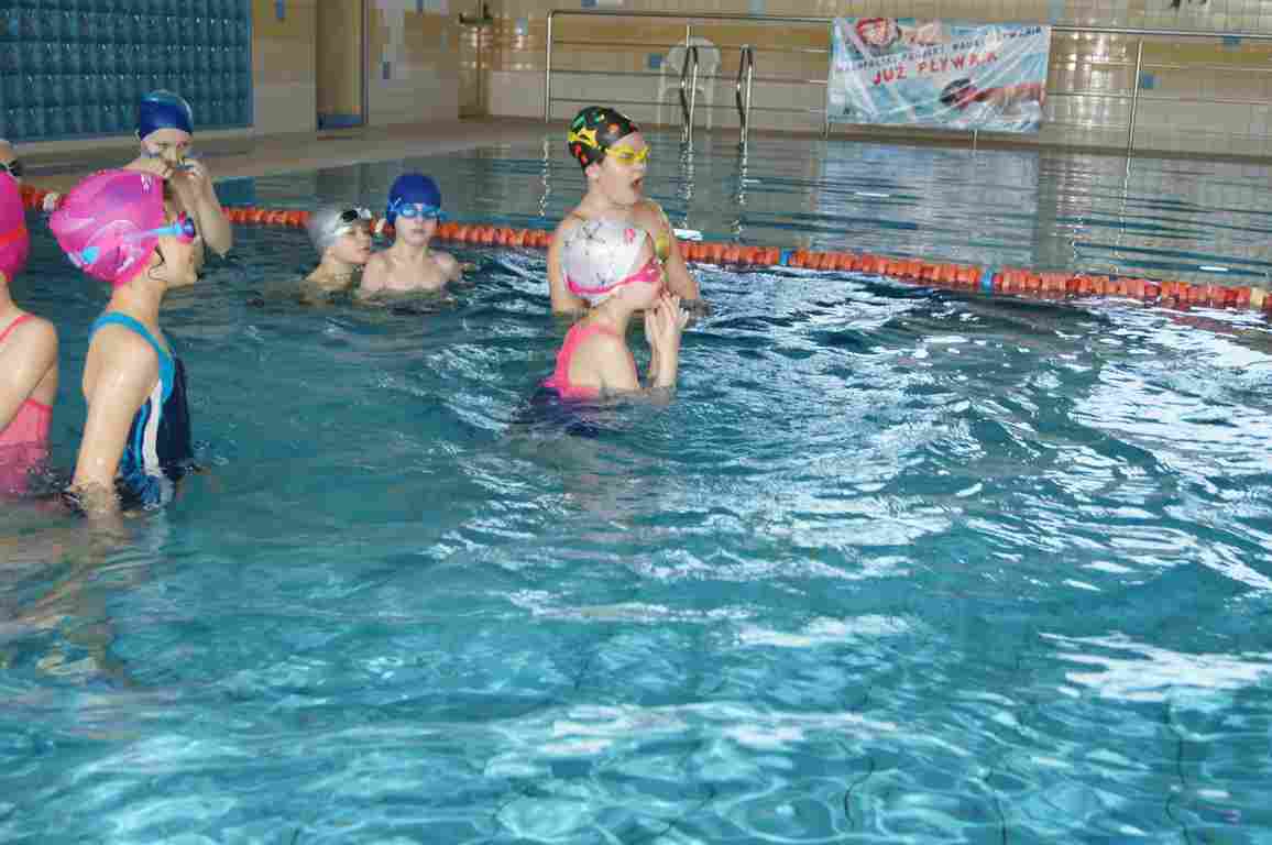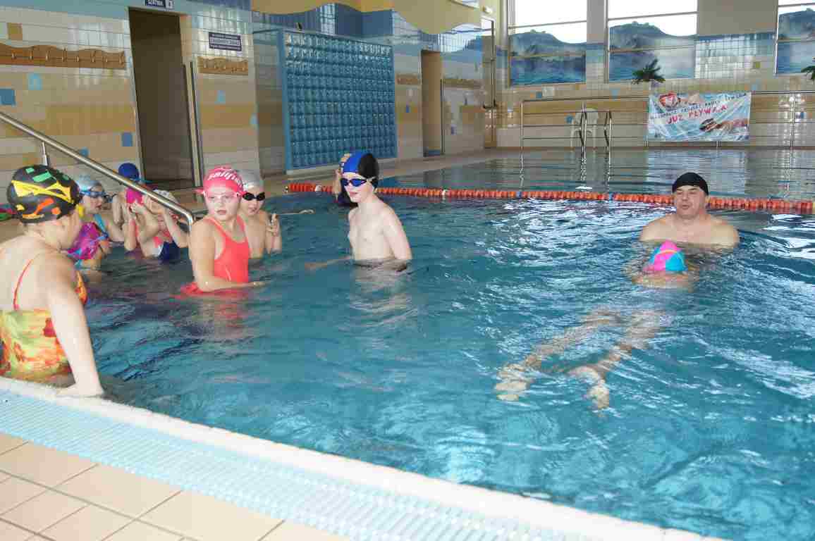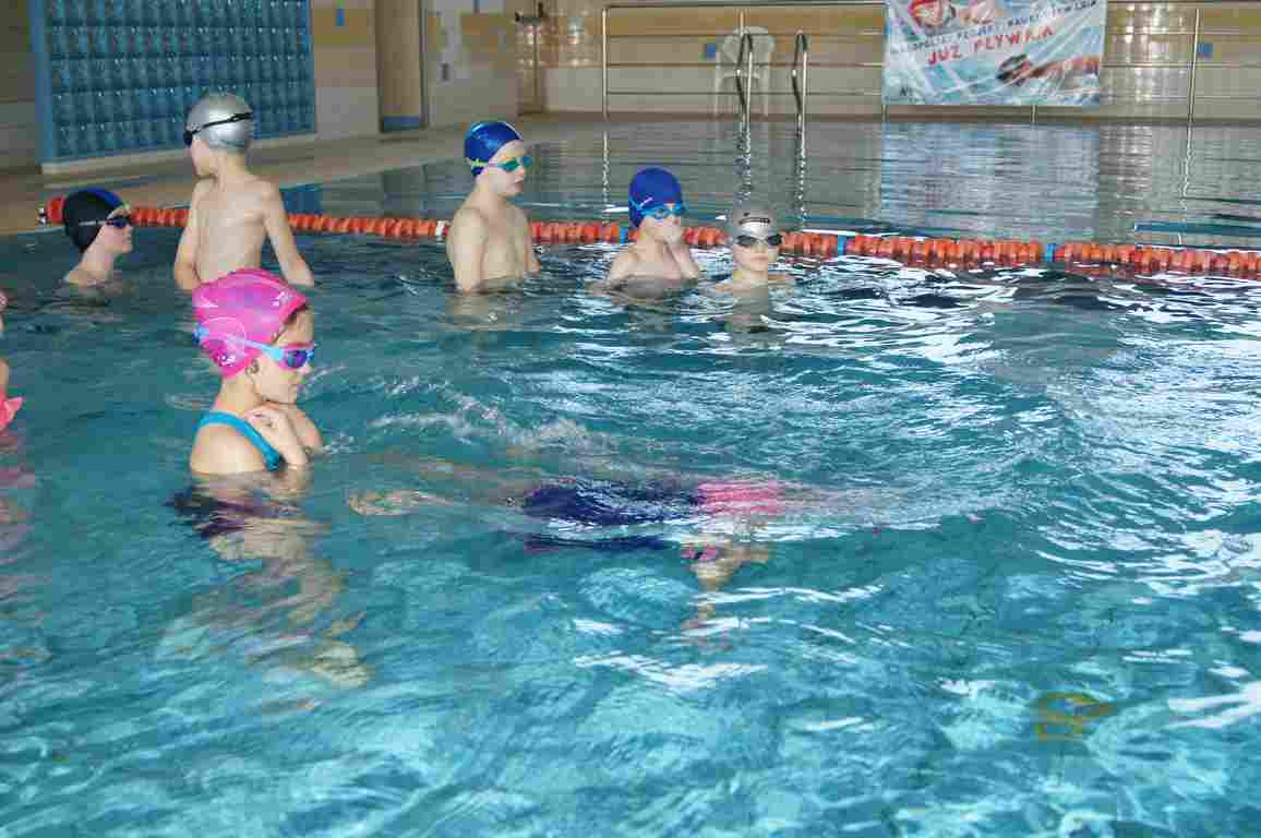 Od marca br. uczniowie klas II – III biorą udział w kursie pływania zorganizowanym na basenie w Jadownikach Mokrych w ramach projektu „Już pływam”. Miło jest patrzeć, jak umiejętności naszych podopiecznych wzrastają wraz z każdym pobytem na basenie. Dzieci nie tylko są już bardzo oswojone z wodą. Bez problemu potrafią w niej zanurkować, znaleźć pod taflą zgubiony krążek, czy przepłynąć pod niskim mostkiem. Umieją także utrzymywać się na wodzie zarówno na plecach, jak i na brzuchu, a zdecydowana większość z nich potrafi dryfować. Oczywiście największą frajdę sprawiają skoki do wody – im dalej, tym lepiej 🙂