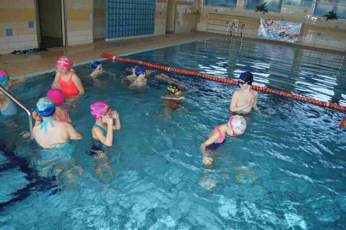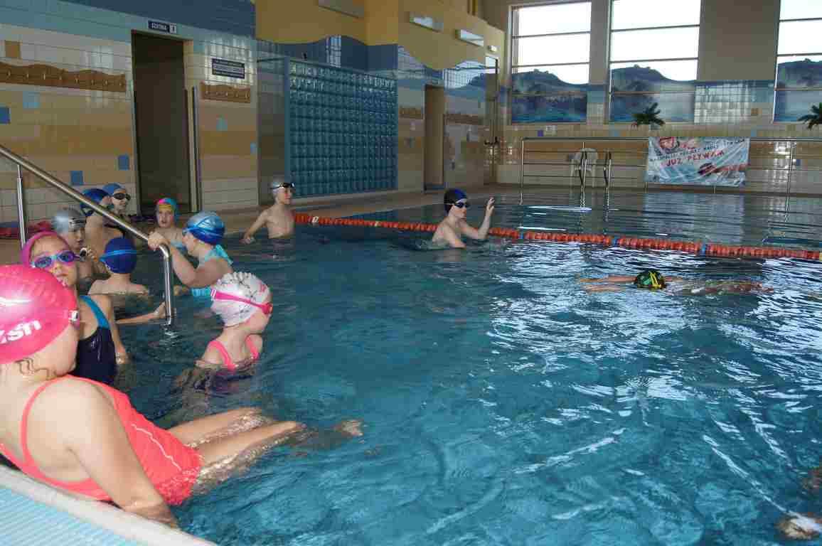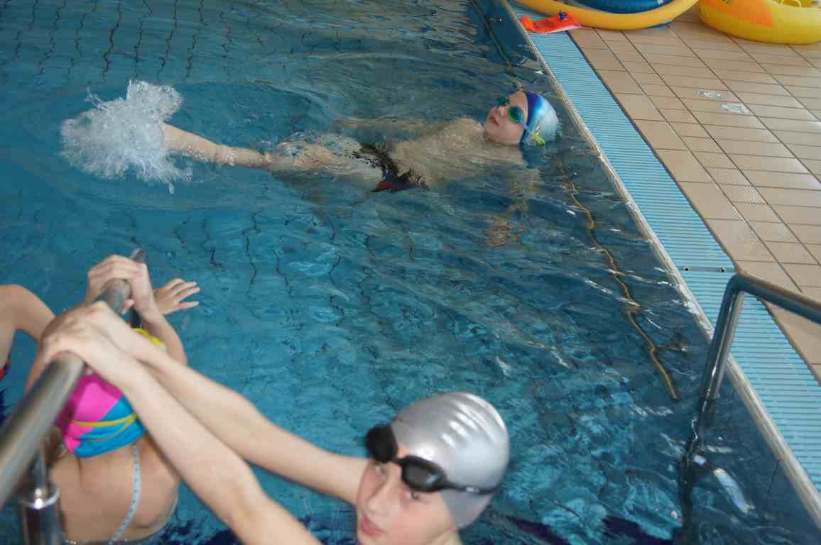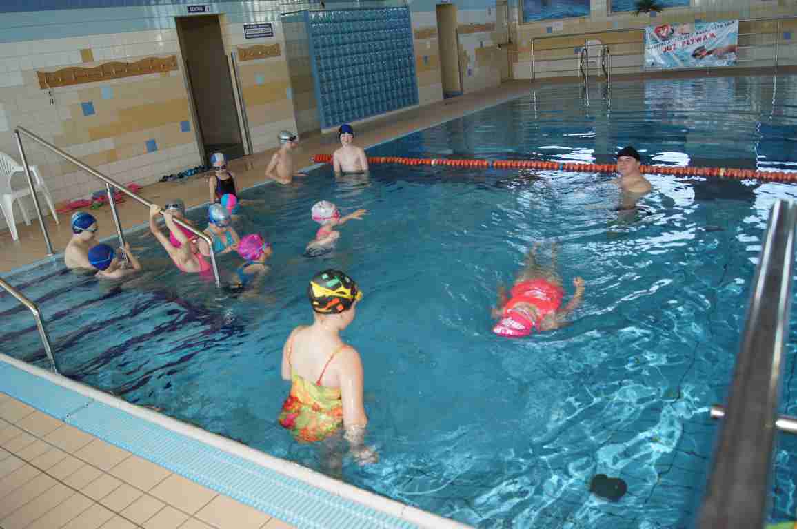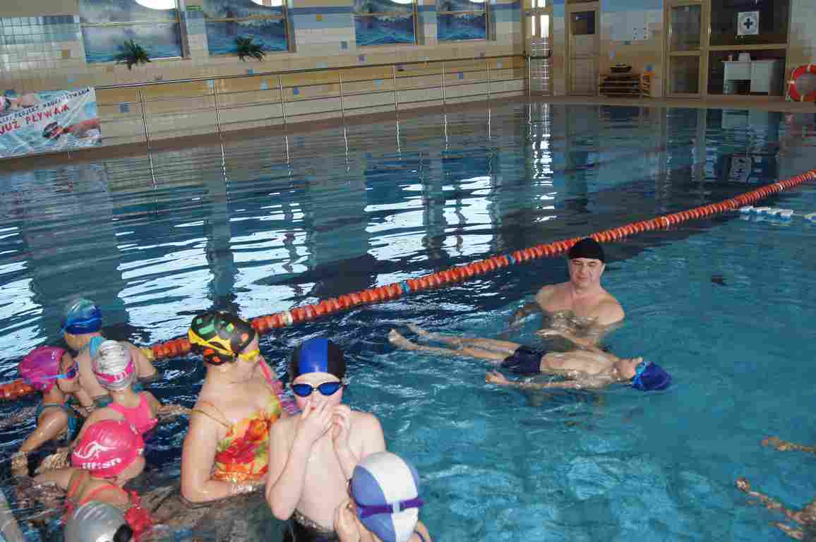 Od marca br. uczniowie klas II – III biorą udział w kursie pływania zorganizowanym na basenie w Jadownikach Mokrych w ramach projektu „Już pływam”. Miło jest patrzeć, jak umiejętności naszych podopiecznych wzrastają wraz z każdym pobytem na basenie. Dzieci nie tylko są już bardzo oswojone z wodą. Bez problemu potrafią w niej zanurkować, znaleźć pod taflą zgubiony krążek, czy przepłynąć pod niskim mostkiem. Umieją także utrzymywać się na wodzie zarówno na plecach, jak i na brzuchu, a zdecydowana większość z nich potrafi dryfować. Oczywiście największą frajdę sprawiają skoki do wody – im dalej, tym lepiej 🙂