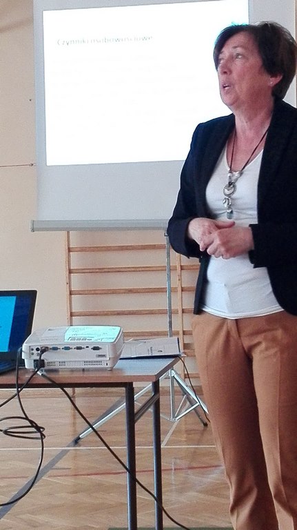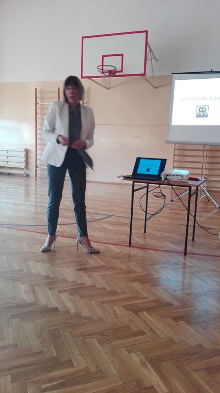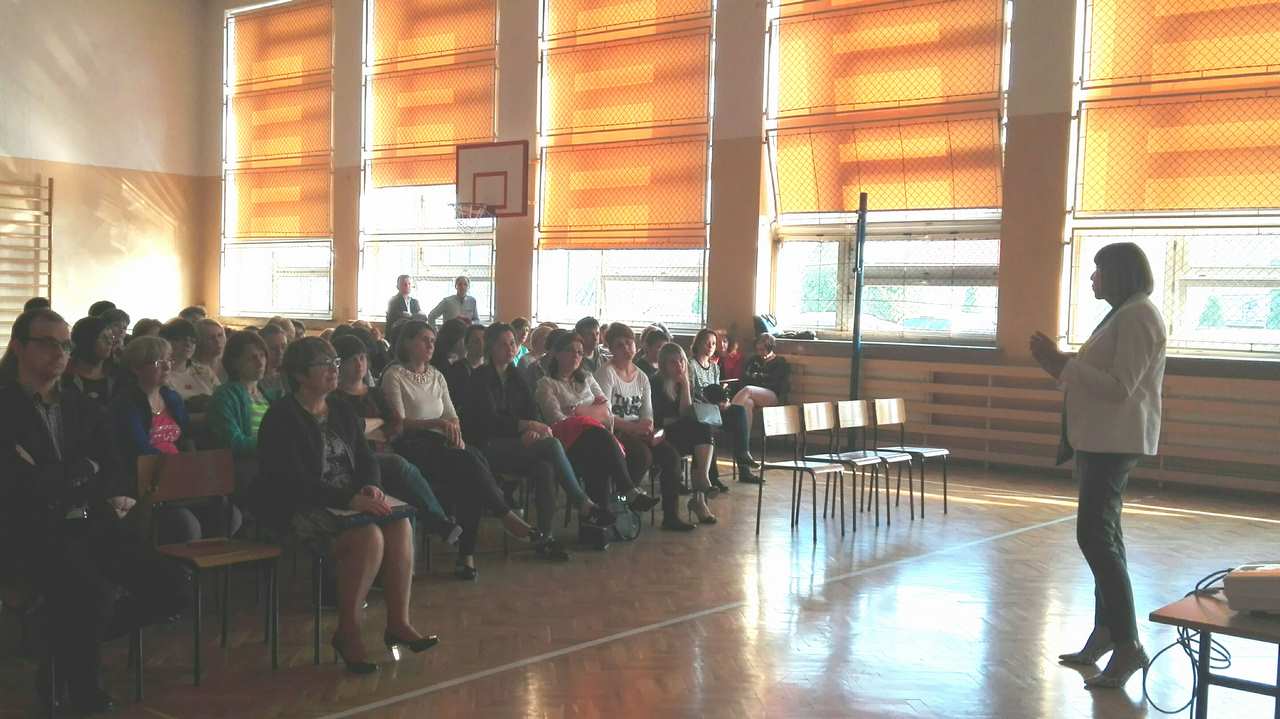 Panie przybyły na zaproszenie dyrekcji oraz pedagog szkolnej z prelekcją pt. „Uzależnienia medialne- poradnik dla rodziców”, która obejmowała treści związane z mechanizmami wchodzenia w uzależnienie od Internetu, telefonów komórkowych, gier video czy innych, powiązanych z przenośnymi środkami medialnymi. Panie: psycholog i pedagog omówiły mechanizm wchodzenia w uzależnienie, jego konsekwencje psychiczne dla dziecka, podały sposoby i wskazówki do wykorzystania przez rodziców w oddziaływaniach wychowawczych, mające na celu zapobiegnięcie skutkom długotrwałego spędzania czasu z mediami. Specjalistki zwróciły uwagę na obecne w Internecie zjawisko cyberprzemocy, zagrażające dzieciom i młodzieży w podatnym na niekontrolowaną manipulację on-line wieku rozwojowym. Doradziły rodzicom jak skutecznie wykorzystać zasady filtrowania treści płynących z sieci i nauczyć dziecko racjonalnego wykorzystania czasu wolnego, powołując się na przykład własny- przykład rodzica.