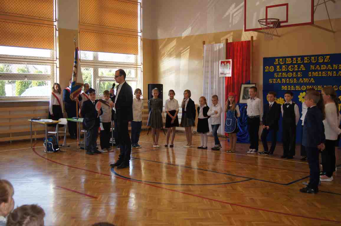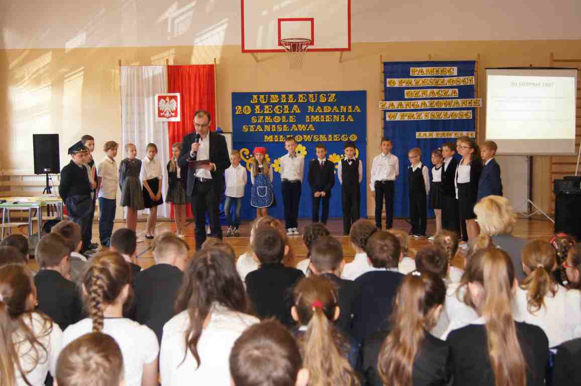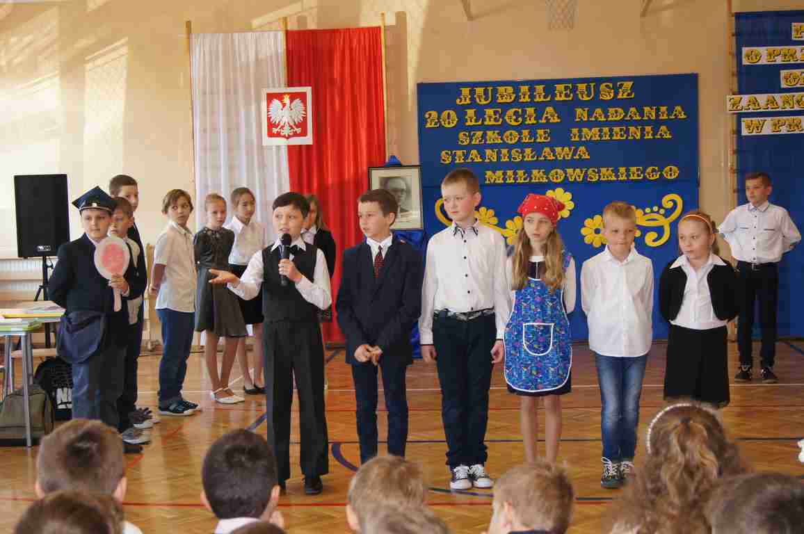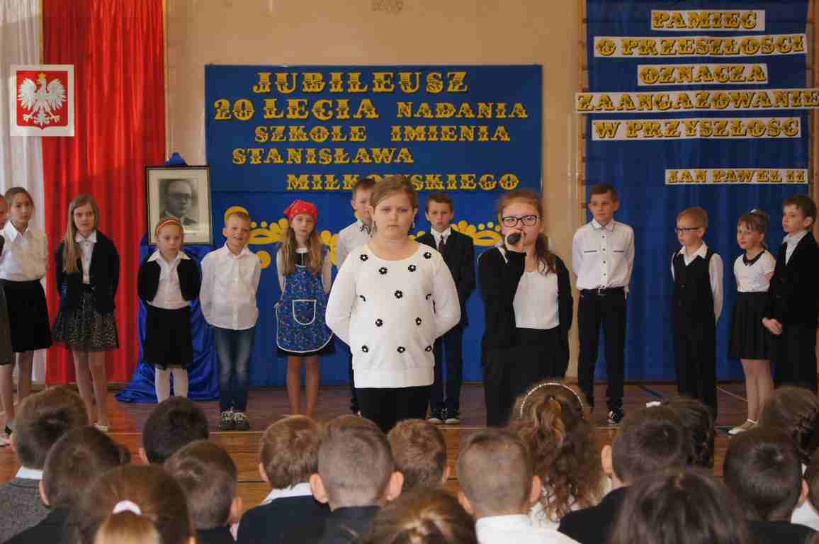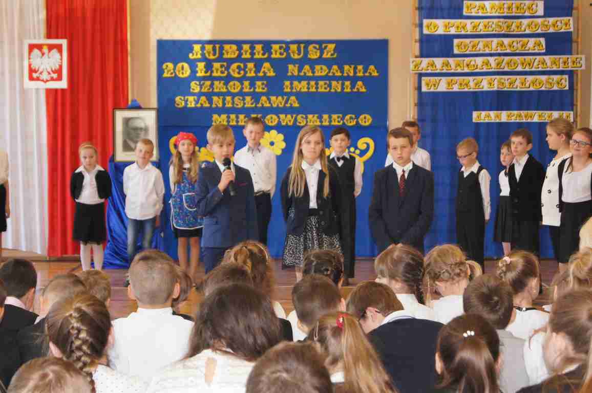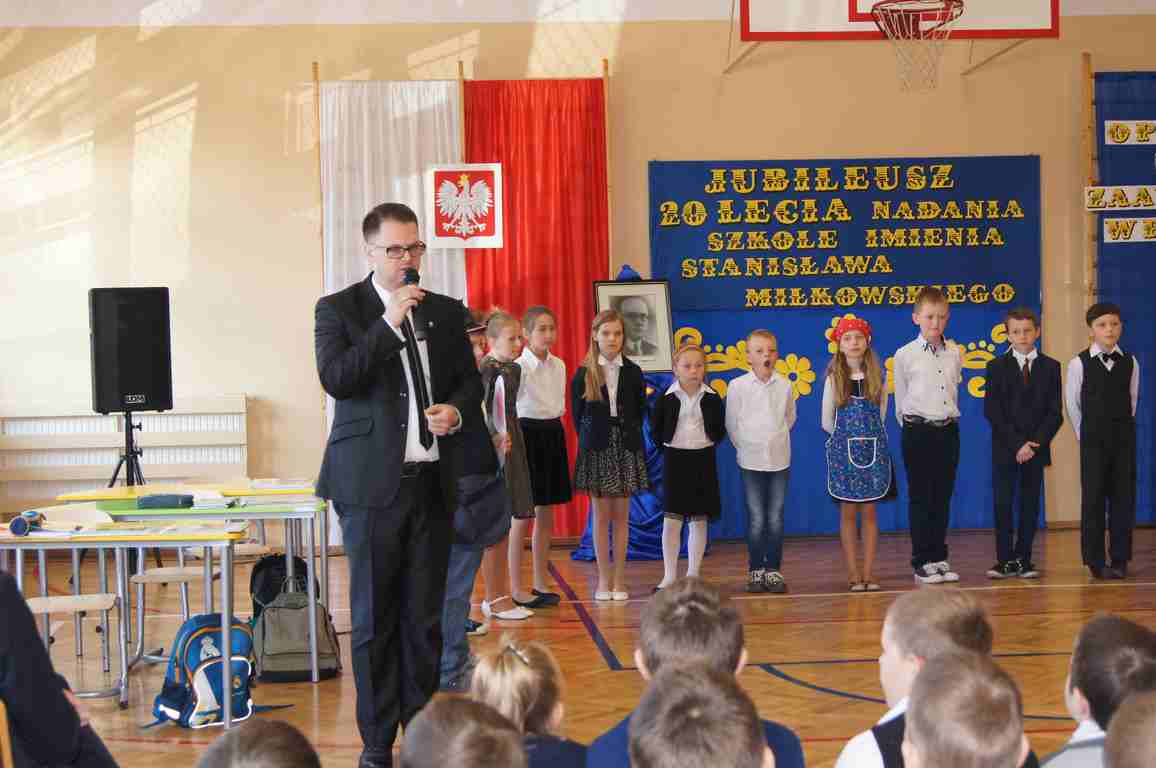17 maja obchodziliśmy Święto Patrona Szkoły oraz jubileusz 20 – lecia nadania szkole podstawowej imienia Stanisława Miłkowskiego. Akademię z tej okazji przygotowała klasa III b pod kierunkiem wychowawczyni, p. Wandy Borowiec przy współpracy z p. Jolantą Gorlą i Lucją Kołaczyńska, które zajęły się dekoracją. Uroczystość rozpoczęła się o godz. 9.00 na sali gimnastycznej. Po odśpiewaniu hymnu narodowego głos zabrał wicedyrektor szkoły, pan Michał Wolak, który przywitał zebranych, w kilku słowach przypomniał postać Stanisława Miłkowskiego oraz zwrócił uwagę na fakt, jak ważna jest pamięć o tych, którzy odeszli. Do zgromadzonych zwrócił się również wójt gminy, pan Tomasz Banek, który podziękował za zaproszenie oraz wyraził radość z tego, że szkoła staje się coraz ładniejsza, a współpraca między dyrekcją a organem prowadzącym przynosi bardzo dobre rezultaty. Pan wójt zwrócił również uwagę uczniów na to, by pamiętali o wszystkich, którzy pracowali i pracują dla ich dobra.