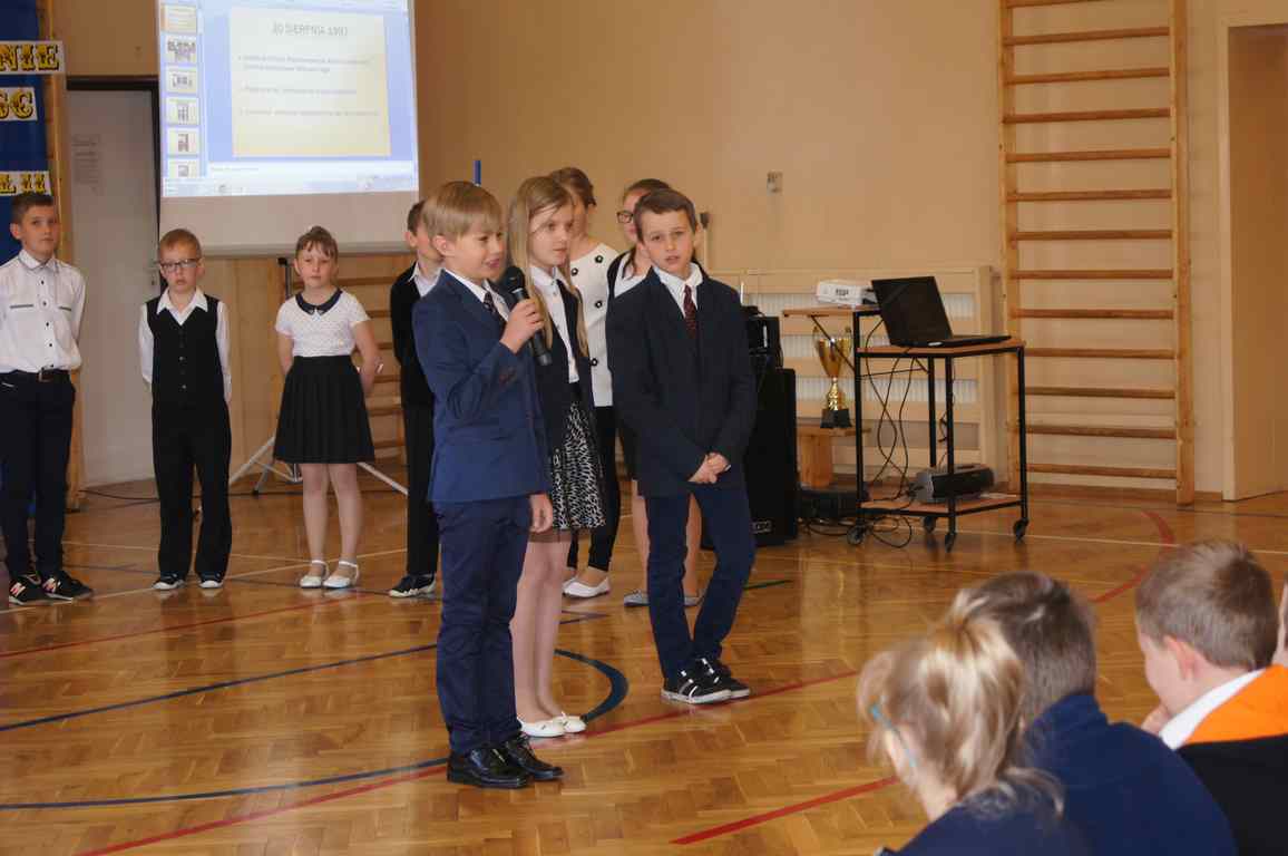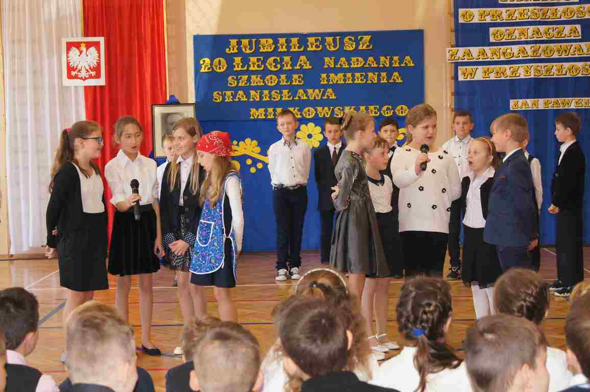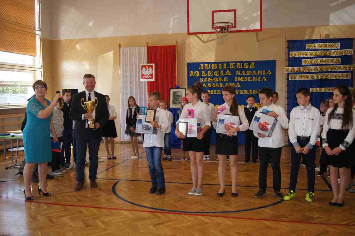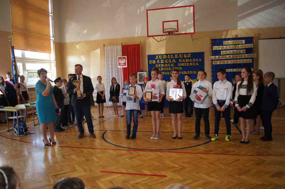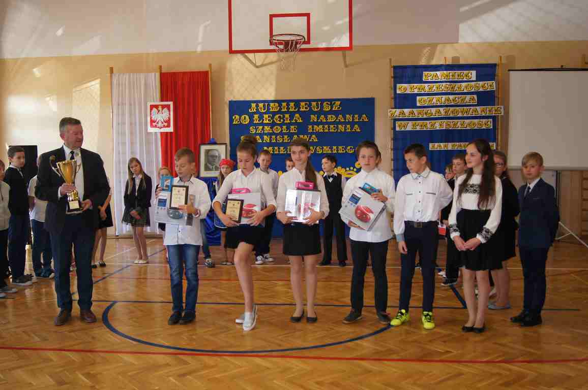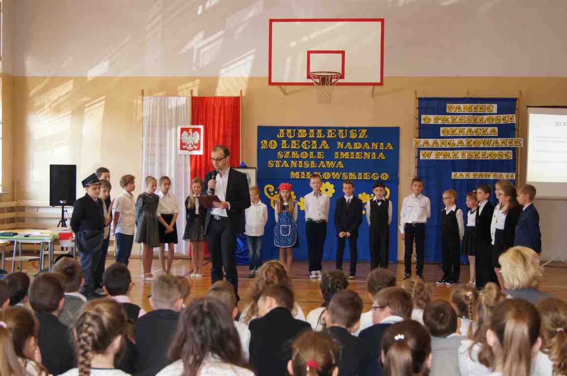 17 maja obchodziliśmy Święto Patrona Szkoły oraz jubileusz 20 – lecia nadania szkole podstawowej imienia Stanisława Miłkowskiego. Akademię z tej okazji przygotowała klasa III b pod kierunkiem wychowawczyni, p. Wandy Borowiec przy współpracy z p. Jolantą Gorlą i Lucją Kołaczyńska, które zajęły się dekoracją. Uroczystość rozpoczęła się o godz. 9.00 na sali gimnastycznej. Po odśpiewaniu hymnu narodowego głos zabrał wicedyrektor szkoły, pan Michał Wolak, który przywitał zebranych, w kilku słowach przypomniał postać Stanisława Miłkowskiego oraz zwrócił uwagę na fakt, jak ważna jest pamięć o tych, którzy odeszli. Do zgromadzonych zwrócił się również wójt gminy, pan Tomasz Banek, który podziękował za zaproszenie oraz wyraził radość z tego, że szkoła staje się coraz ładniejsza, a współpraca między dyrekcją a organem prowadzącym przynosi bardzo dobre rezultaty. Pan wójt zwrócił również uwagę uczniów na to, by pamiętali o wszystkich, którzy pracowali i pracują dla ich dobra.