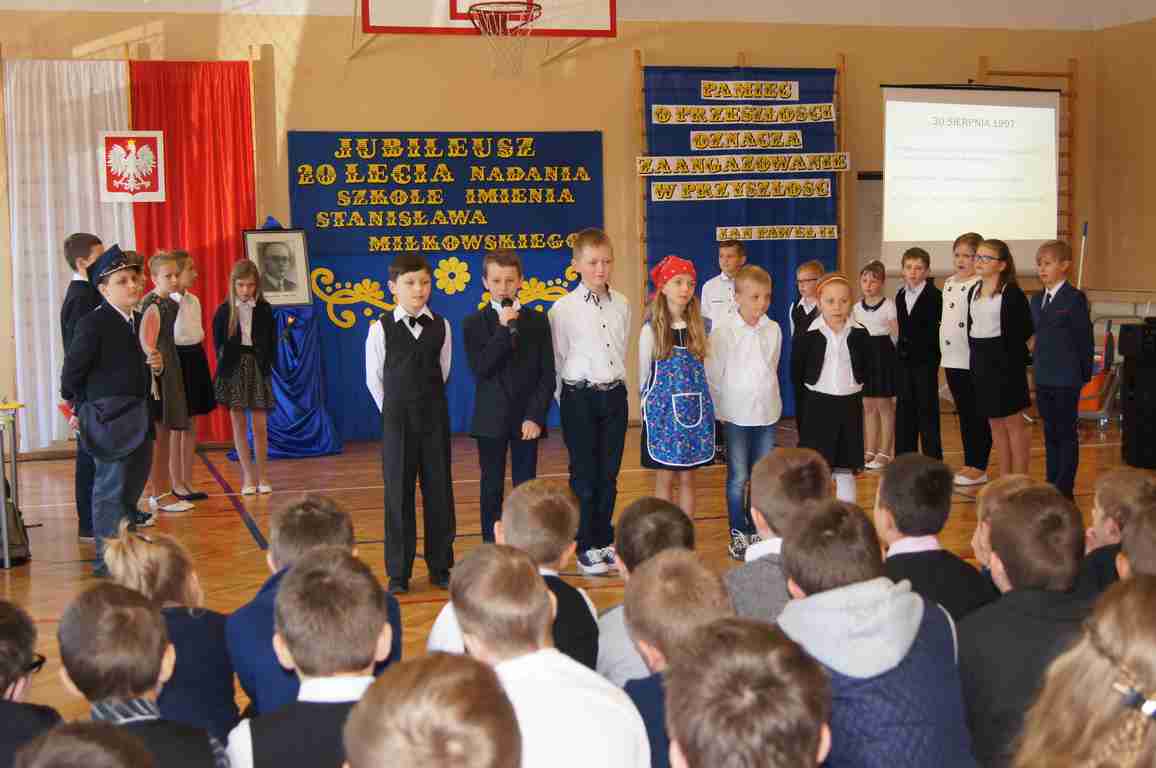 Po wystąpieniach oficjalnych rozpoczęła się akademia. Trzecioklasiści poprzez ciekawe wiersze i piękne piosenki opowiedzieli nie tylko o patronie, ale również o szkolnym życiu, jego zaletach i wadach. Dopełnieniem ich występu była prezentacja multimedialna przypominająca nadanie szkole imienia Stanisława Miłkowskiego oraz najważniejsze wydarzenia z 20 lat, które upłynęły od tego momentu.