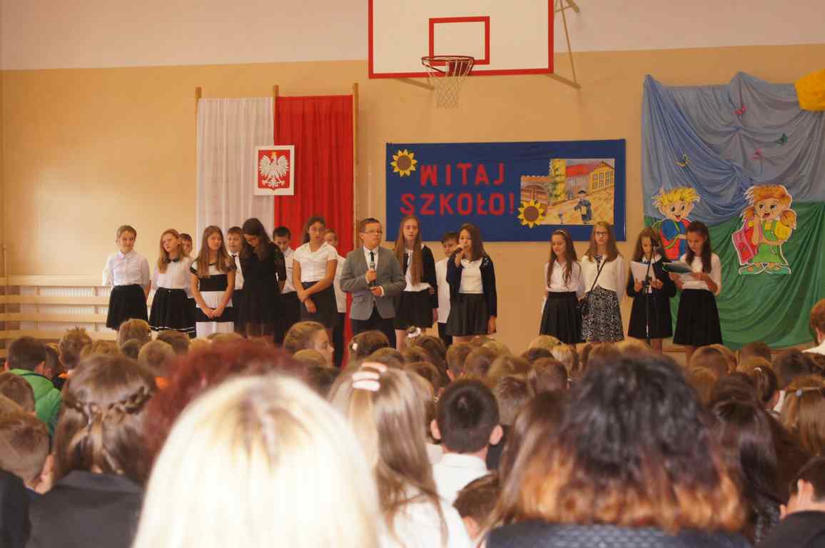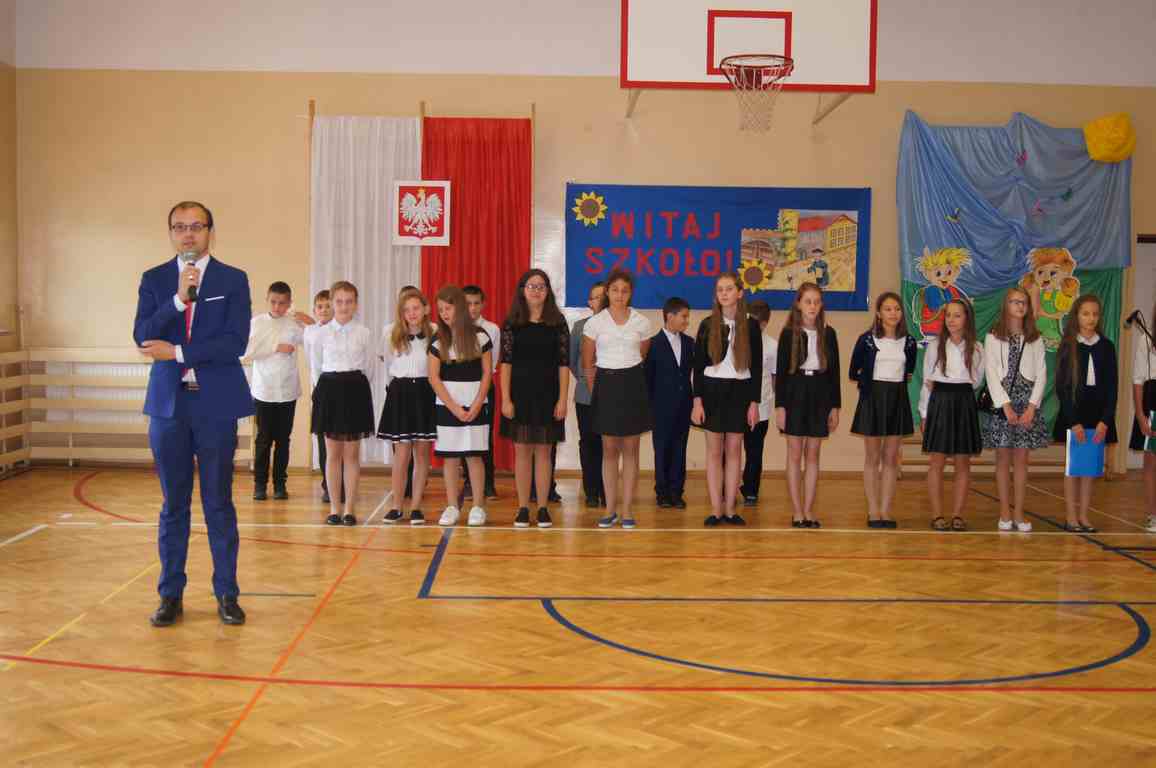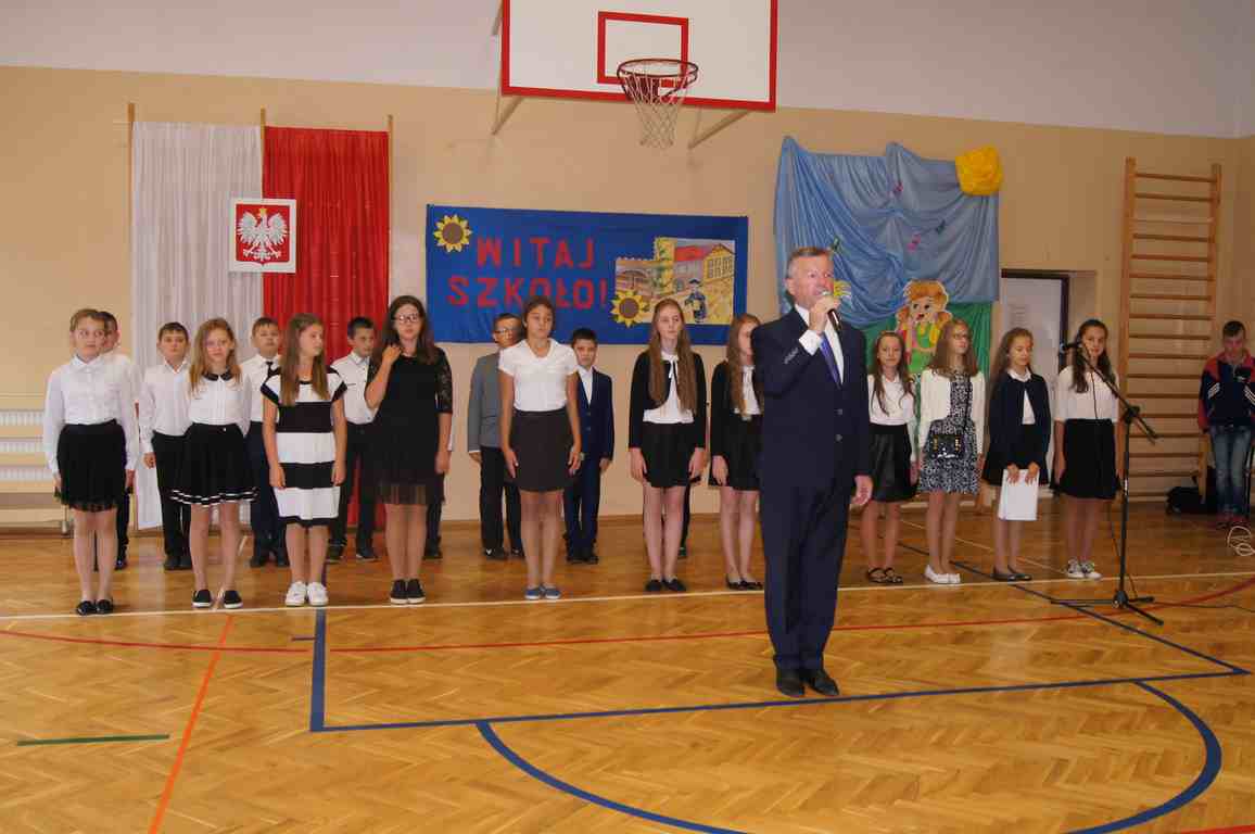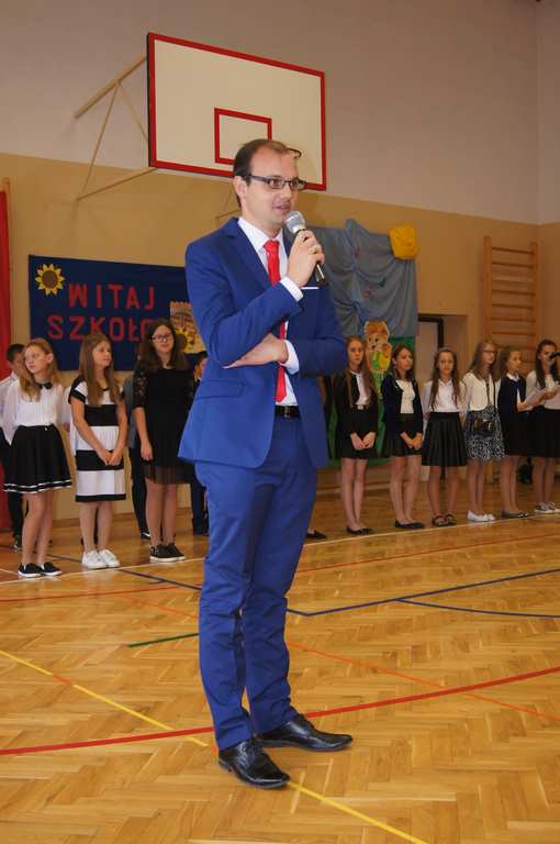 W części oficjalnej zabrał także głos Wójt Gminy Wietrzychowice, pan Tomasz Banek, jak zawsze chętnie uczestniczący w każdym szkolnym wydarzeniu. Wójt w pierwszych słowach powitał wszystkich zebranych oraz podziękował za przygotowanie, zorganizowanie i przeprowadzenie letniej półkolonii dla dzieci z naszej gminy. Zwrócił również uwagę na bardzo dobrą współpracę dyrekcji i nauczycieli z organem prowadzącym, dzięki czemu realizowane są nawet trudne zadania, a efekty tejże współpracy nie tylko cieszą, ale przede wszystkim ułatwiają realizację zadań, jakie stawiane są szkole. Jednym z wyników owej współpracy jest nowy wizerunek korytarza na parterze w budynku naszej szkoły, który w trakcie wakacyjnej przerwy przeszedł gruntowną metamorfozę i zaskoczył każdego, kto ostatni raz widział go w czerwcu. Świetny wygląd zyskała posadzka, na której położony został tarkett oraz pięknie pomalowane, jasne ściany dodatkowo ozdobione dekoracyjnymi płatkami. Wszystko to sprawiło, że korytarz na parterze nie tylko wygląda efektownie, ale sprawia wrażenie dłuższego i szerszego. Nowy wizerunek zyskała także sala nr 16 i kantorek fizyczno – chemiczny. Zmiany wprowadzono również na szkolnej świetlicy (odświeżonej w ubiegłym roku szkolnym), której okna doczekały się ślicznych firanek i doskonale dobranych zasłon, co zdecydowanie dodało jej przytulności. Niedługo wszystkich nas czeka jeszcze jeden poważny remont, ten, którego życzyliśmy sobie od dłuższego czasu – jeszcze we wrześniu rozpoczną się prace nad ociepleniem i elewacją budynku szkoły – to zdecydowanie jedna z najprzyjemniejszych wiadomości na początek 🙂