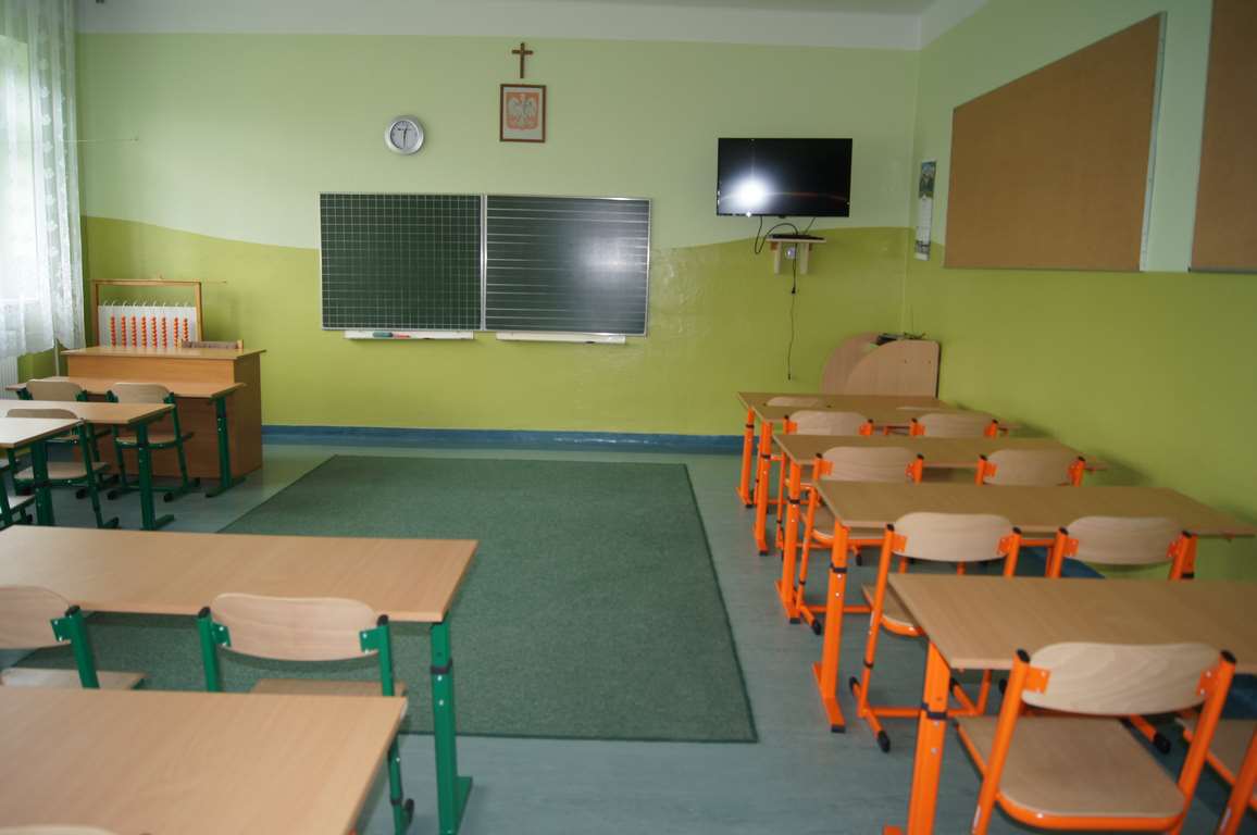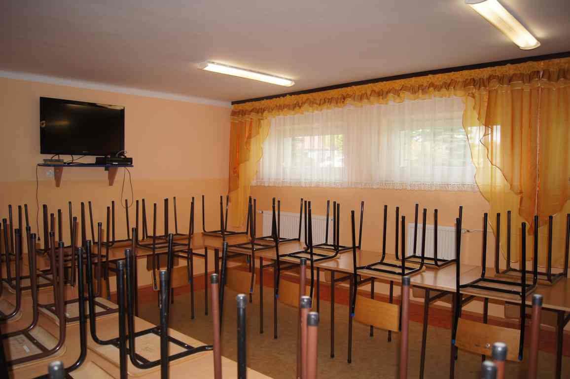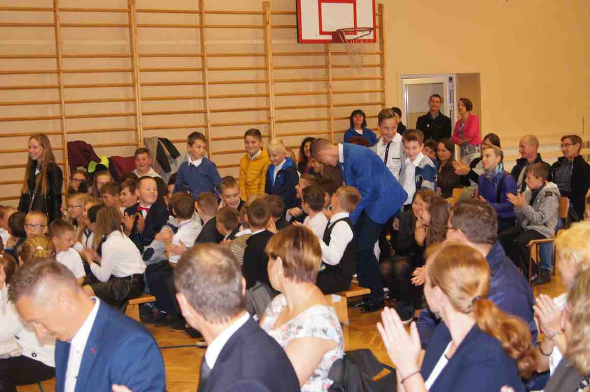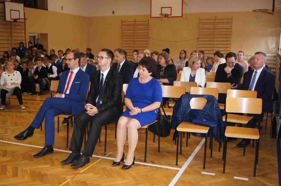 W części oficjalnej zabrał także głos Wójt Gminy Wietrzychowice, pan Tomasz Banek, jak zawsze chętnie uczestniczący w każdym szkolnym wydarzeniu. Wójt w pierwszych słowach powitał wszystkich zebranych oraz podziękował za przygotowanie, zorganizowanie i przeprowadzenie letniej półkolonii dla dzieci z naszej gminy. Zwrócił również uwagę na bardzo dobrą współpracę dyrekcji i nauczycieli z organem prowadzącym, dzięki czemu realizowane są nawet trudne zadania, a efekty tejże współpracy nie tylko cieszą, ale przede wszystkim ułatwiają realizację zadań, jakie stawiane są szkole. Jednym z wyników owej współpracy jest nowy wizerunek korytarza na parterze w budynku naszej szkoły, który w trakcie wakacyjnej przerwy przeszedł gruntowną metamorfozę i zaskoczył każdego, kto ostatni raz widział go w czerwcu. Świetny wygląd zyskała posadzka, na której położony został tarkett oraz pięknie pomalowane, jasne ściany dodatkowo ozdobione dekoracyjnymi płatkami. Wszystko to sprawiło, że korytarz na parterze nie tylko wygląda efektownie, ale sprawia wrażenie dłuższego i szerszego. Nowy wizerunek zyskała także sala nr 16 i kantorek fizyczno – chemiczny. Zmiany wprowadzono również na szkolnej świetlicy (odświeżonej w ubiegłym roku szkolnym), której okna doczekały się ślicznych firanek i doskonale dobranych zasłon, co zdecydowanie dodało jej przytulności. Niedługo wszystkich nas czeka jeszcze jeden poważny remont, ten, którego życzyliśmy sobie od dłuższego czasu – jeszcze we wrześniu rozpoczną się prace nad ociepleniem i elewacją budynku szkoły – to zdecydowanie jedna z najprzyjemniejszych wiadomości na początek 🙂