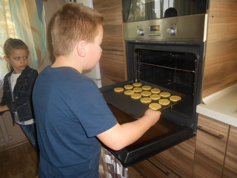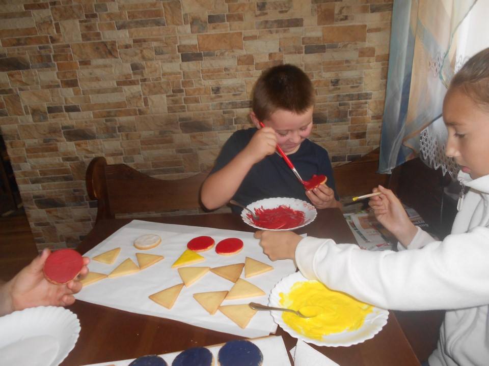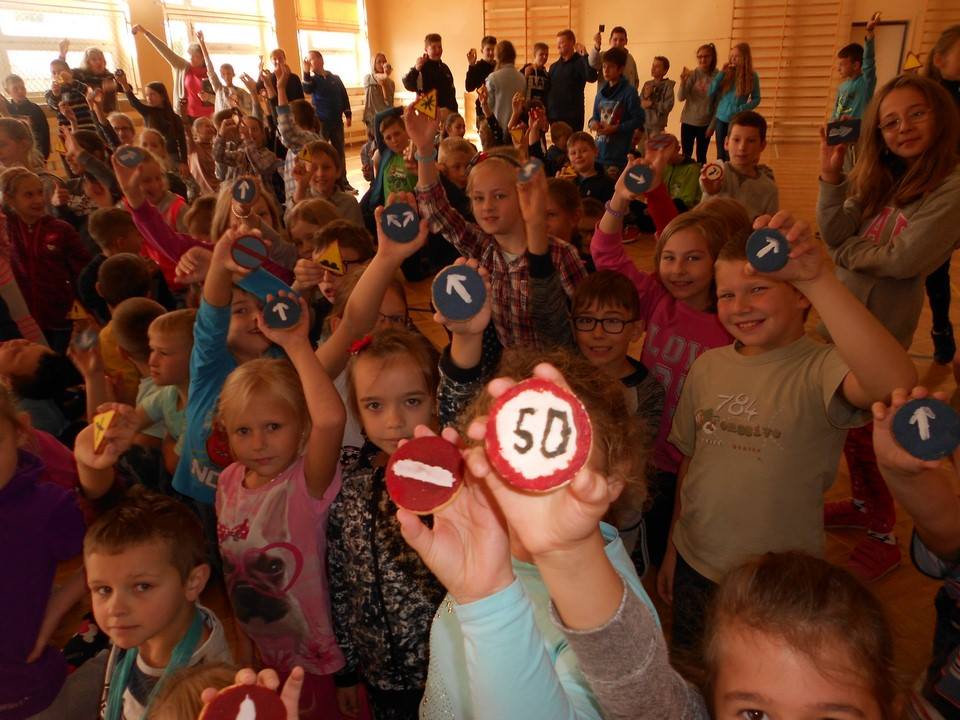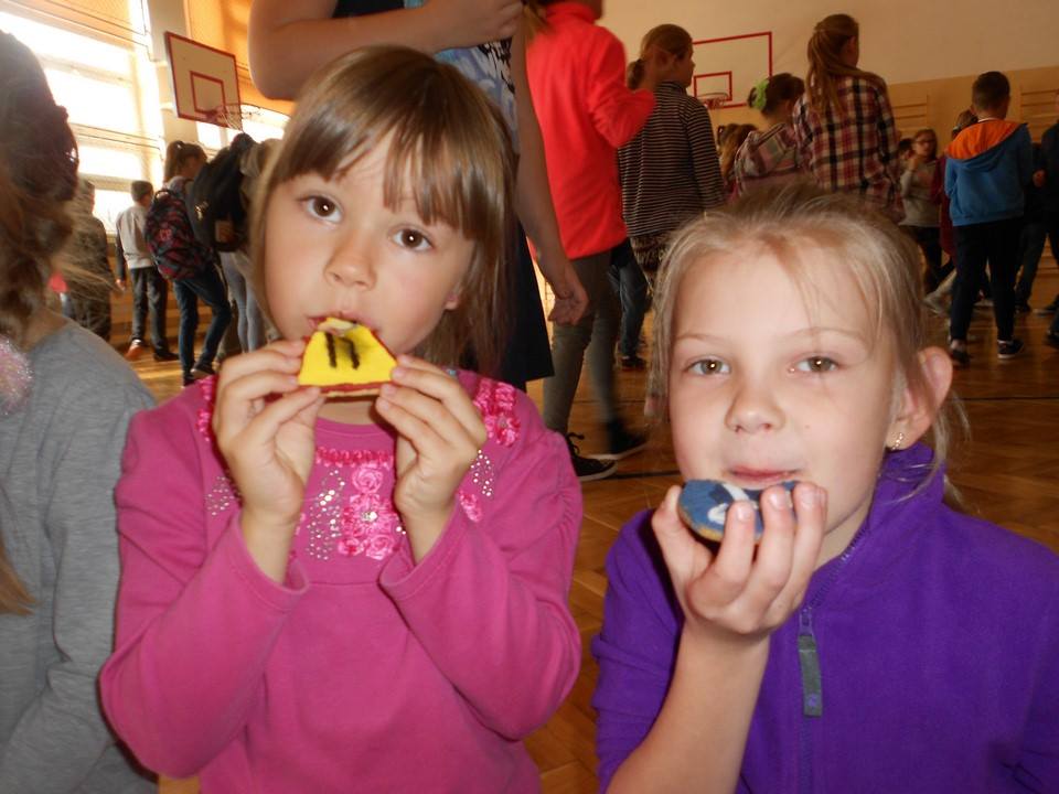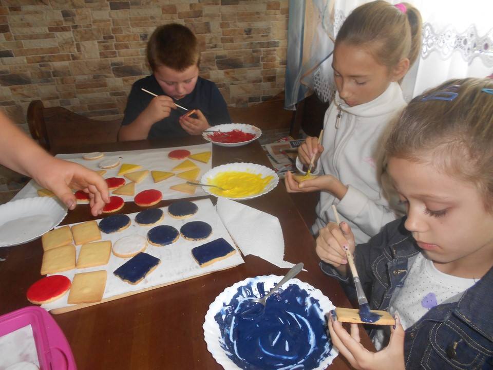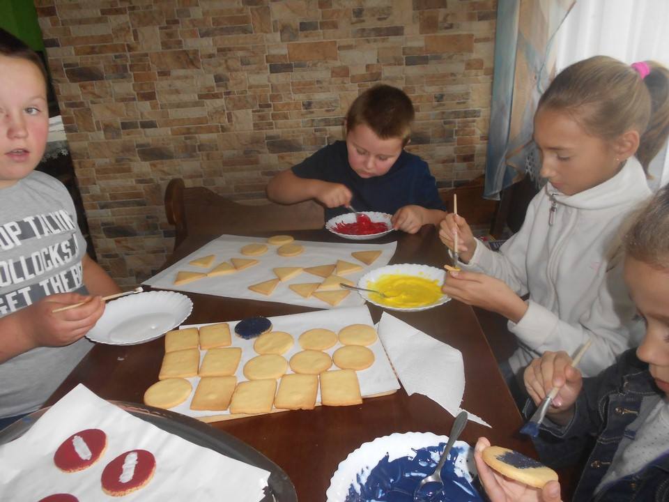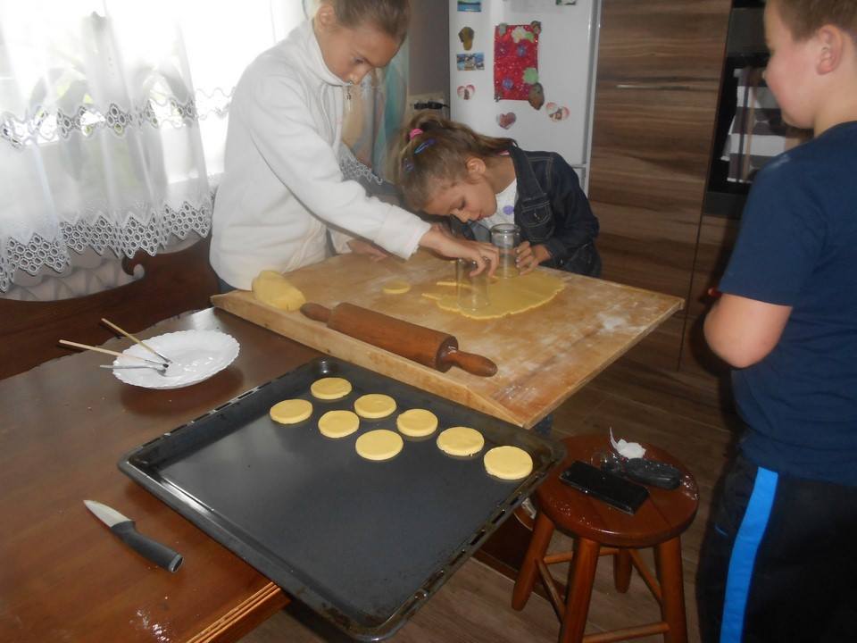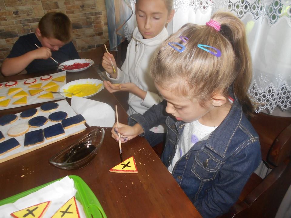 Sobotnie popołudnie grupka dzieci z naszej szkoły spędziła bardzo pracowicie piekąc ciastka, które w efekcie końcowym miały stać się znakami drogowymi. Dzieci bardzo zaangażowały się we wszelkie przygotowania. Po dokładnym umyciu rąk,  pod czujnym okiem pani Kasi, ochoczo przystąpiły do pracy. Mieszając potrzebne składniki zagniatały ciasto, rozwałkowywały je, a następnie wycinały i układały na blaszce, ostrożnie wkładając do piekarnika. Na tym praca się nie zakończyła, gdyż po upieczeniu i wystygnięciu nastąpiło dekorowanie ciasteczek. Dzięki dużej pomocy pani Kasi i pana Rafała ciastka zrobiły się kolorowe i powstały z nich piękne znaki drogowe.