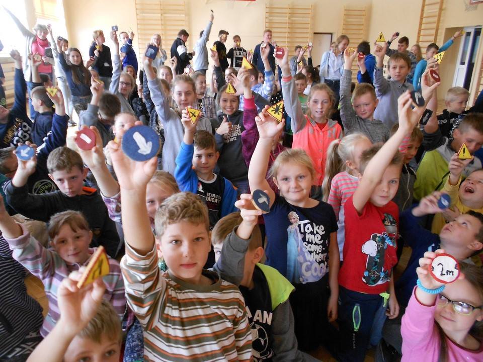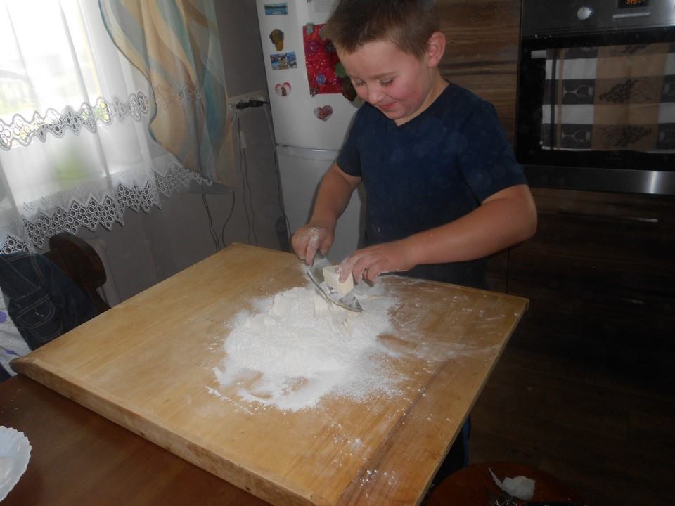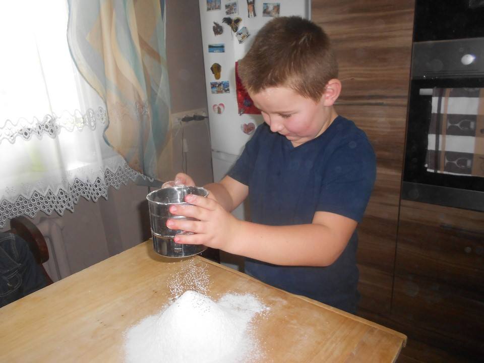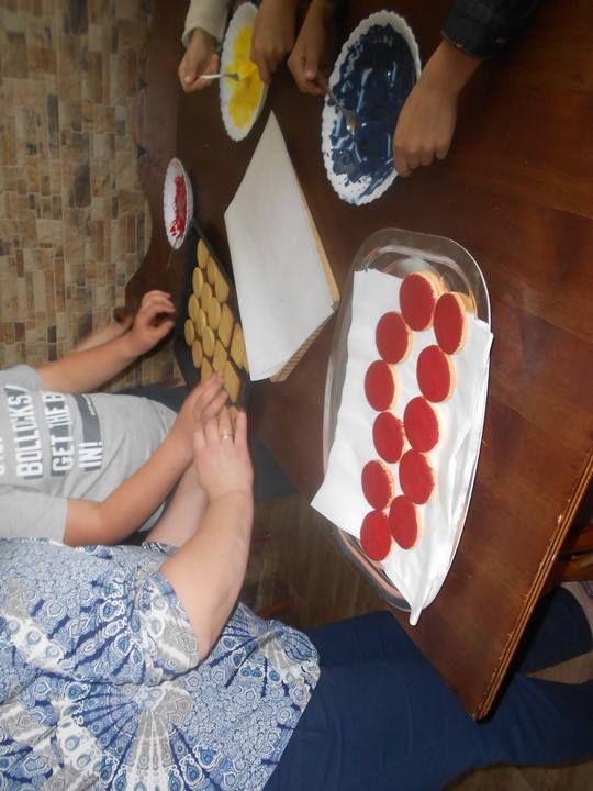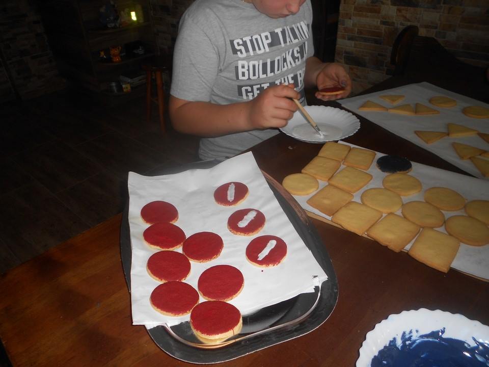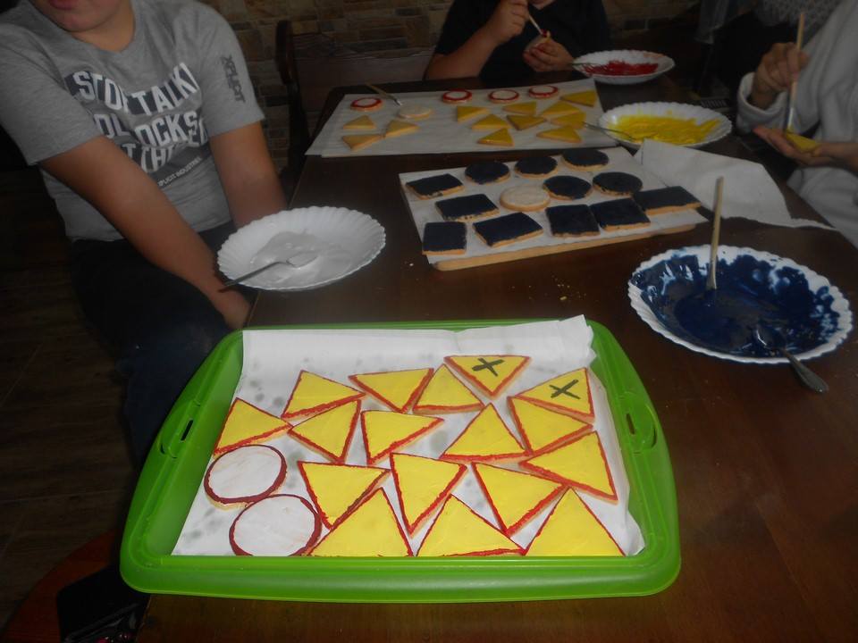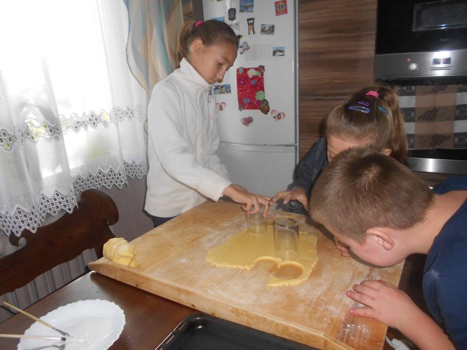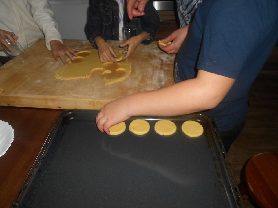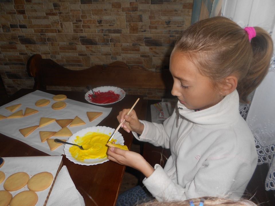 Sobotnie popołudnie grupka dzieci z naszej szkoły spędziła bardzo pracowicie piekąc ciastka, które w efekcie końcowym miały stać się znakami drogowymi. Dzieci bardzo zaangażowały się we wszelkie przygotowania. Po dokładnym umyciu rąk,  pod czujnym okiem pani Kasi, ochoczo przystąpiły do pracy. Mieszając potrzebne składniki zagniatały ciasto, rozwałkowywały je, a następnie wycinały i układały na blaszce, ostrożnie wkładając do piekarnika. Na tym praca się nie zakończyła, gdyż po upieczeniu i wystygnięciu nastąpiło dekorowanie ciasteczek. Dzięki dużej pomocy pani Kasi i pana Rafała ciastka zrobiły się kolorowe i powstały z nich piękne znaki drogowe.