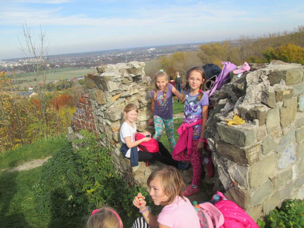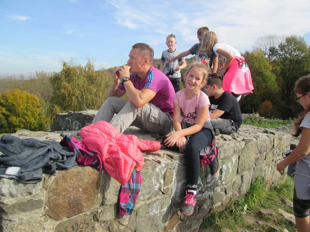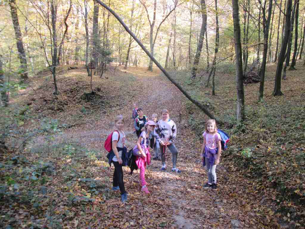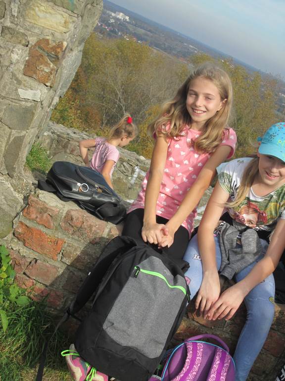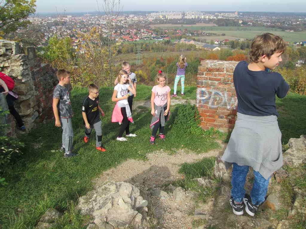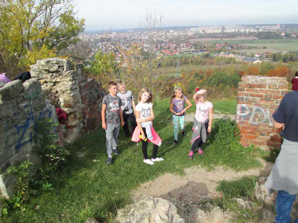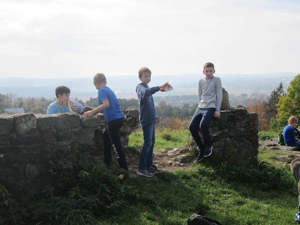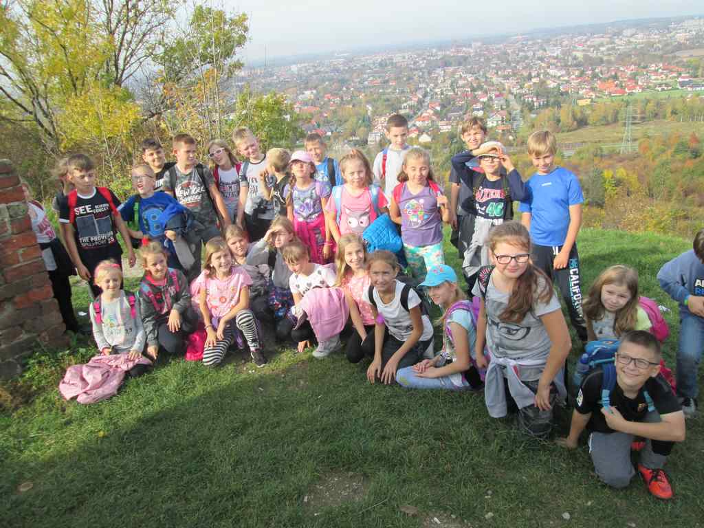 18 października obie klasy czwarte wraz ze swoimi wychowawcami nareszcie wybrały się na kilkakrotnie przekładaną na inny termin wycieczkę. Zamysłem wychowawców było bliższe poznanie nowych uczniów i wzajemna integracja. A wiadomo, że nic tak nie zbliża, jak wspólne wędrowanie… 🙂 Trasę rozpoczęliśmy w Skrzyszowie, gdzie uczniowie na miejscowym Orliku rozegrali mecze piłki nożnej i siatkówki, następnie zaś (pokrzepieni kiełbaskami upieczonymi przez pana Mariusza) weszli w Las Kruk, by zielonym szlakiem dostać się do Zawady, zobaczyć przepiękny kościółek Świętego Marcina – najstarszą świątynię parafialną Tarnowa, a stamtąd przejść na popularną Marcinkę i zwiedzić ruiny zamku Tarnowskich. Odpoczynek na szczycie nasi uczniowie wykorzystali również na podziwianie panoramy Tarnowa i próby (nieudane, niestety) dostrzeżenia stamtąd ulubionej restauracji, do której podążyli również pieszo, tym razem kierując się niebieskim szlakiem do ul. Tuchowskiej. Po drodze zwiedzili zabytkowy Stary Cmentarz w Tarnowie, oddali hołd żołnierzom i ofiarom II wojny światowej przy Pomniku Ofiar Wojny i Faszyzmu oraz zobaczyli siedzibę popularnego radia RDN.