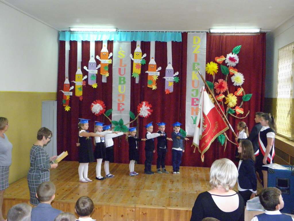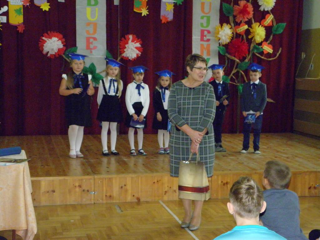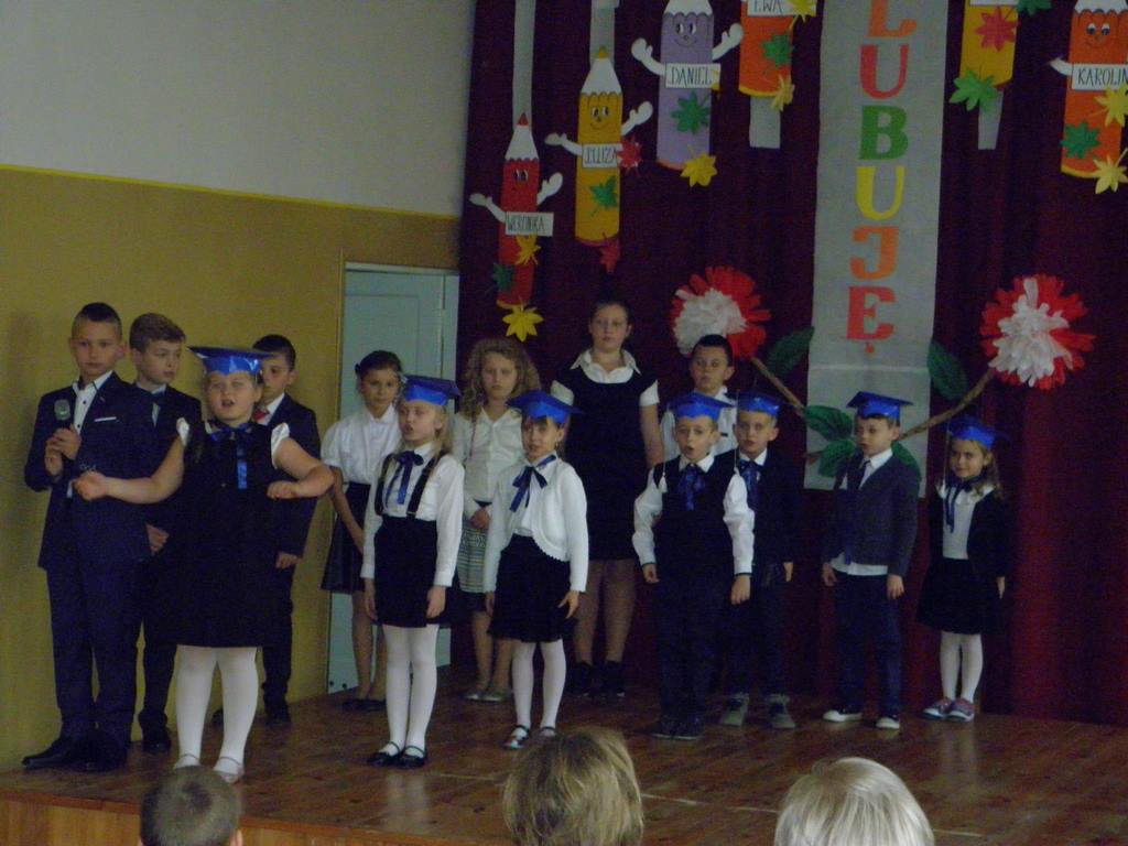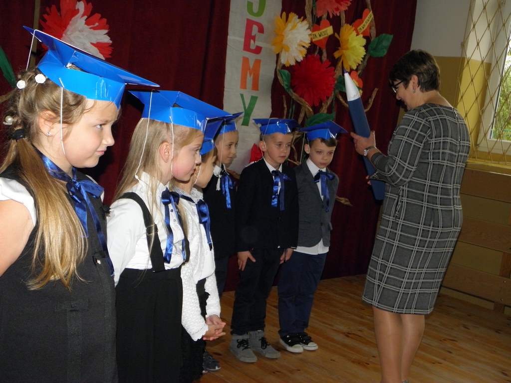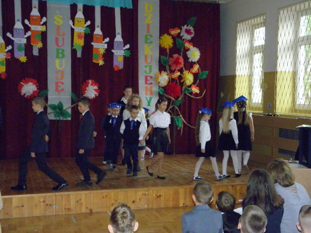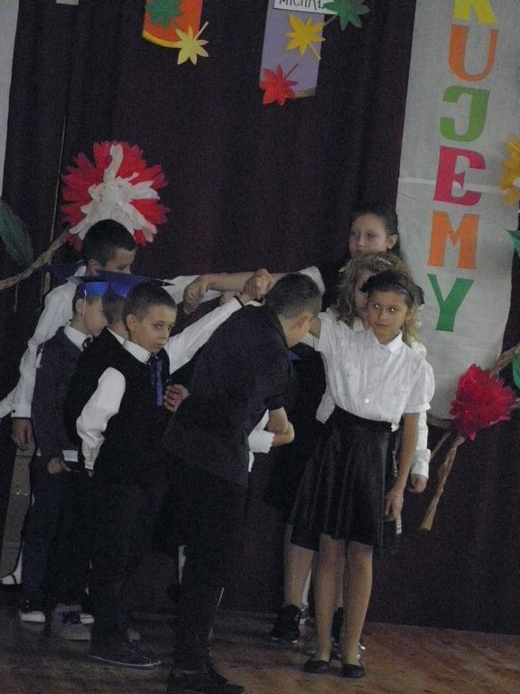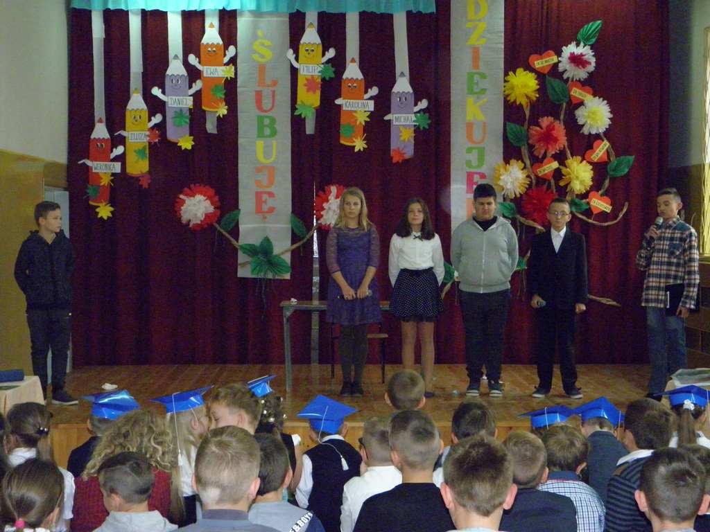 Uroczystość ślubowania uczniów klasy pierwszej połączona była z jeszcze jednym ważnym świętem – obchodami Dnia Edukacji Narodowej. Okolicznościową akademię z tej okazji przygotowała ze swymi uczniami pani Paulina Prażuch.