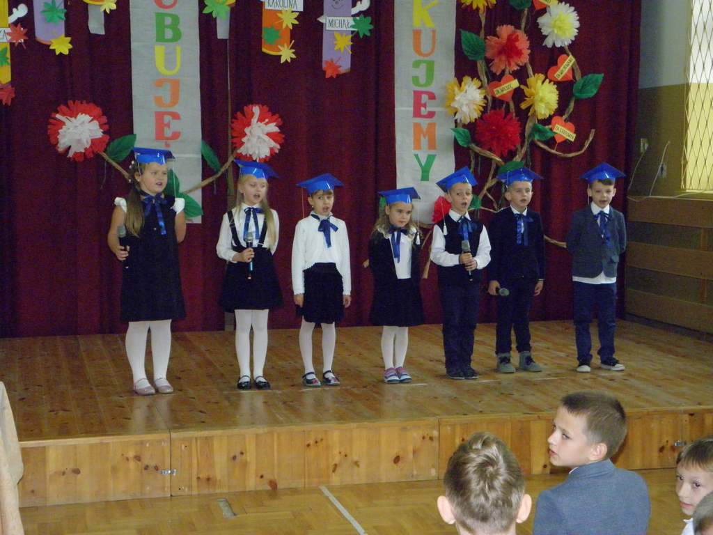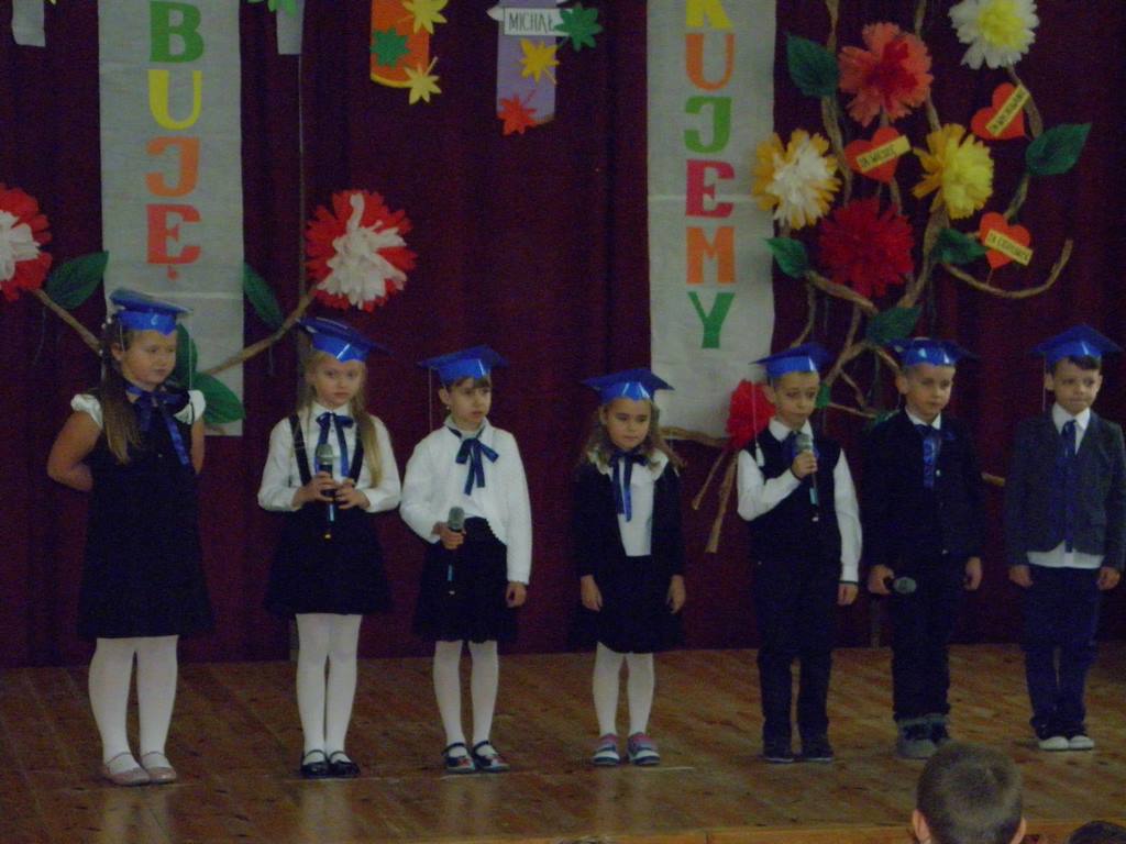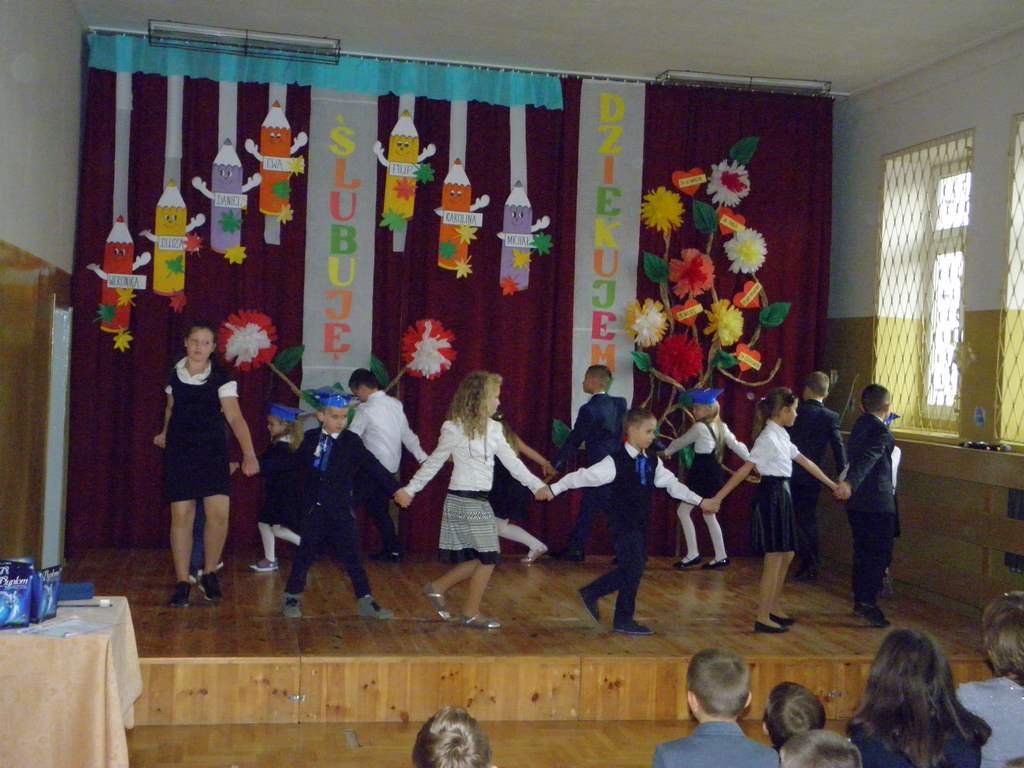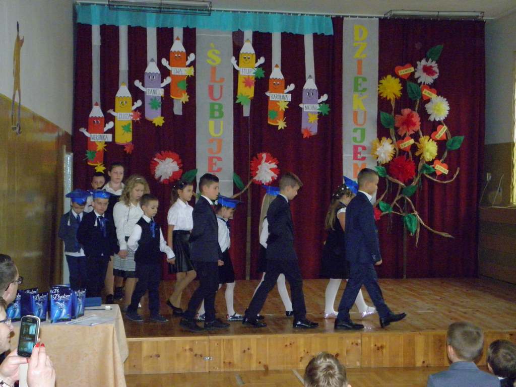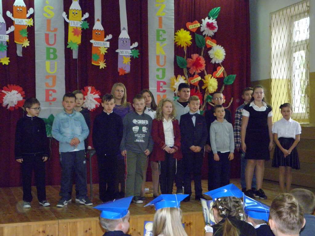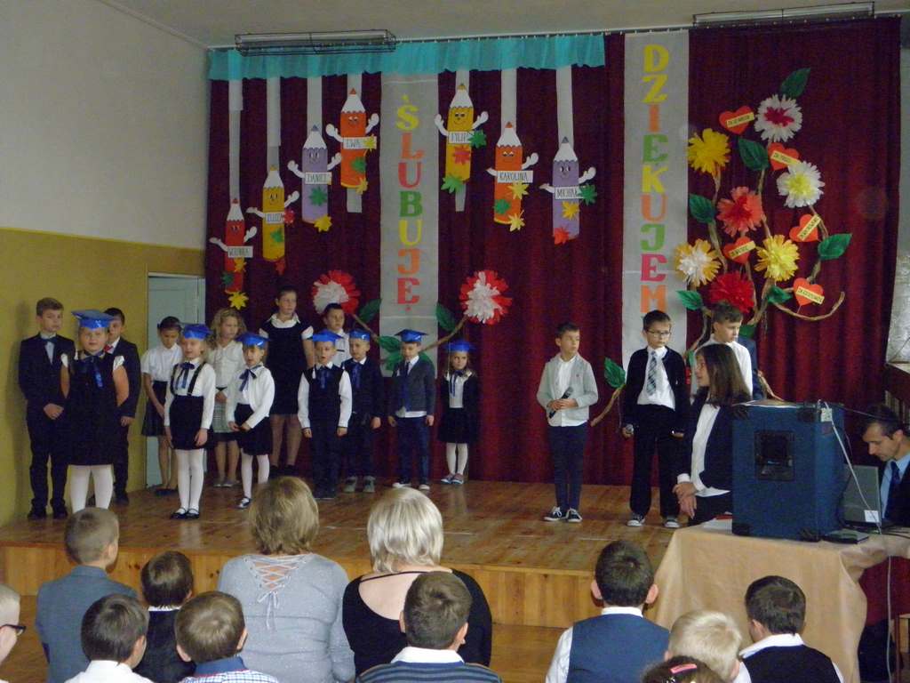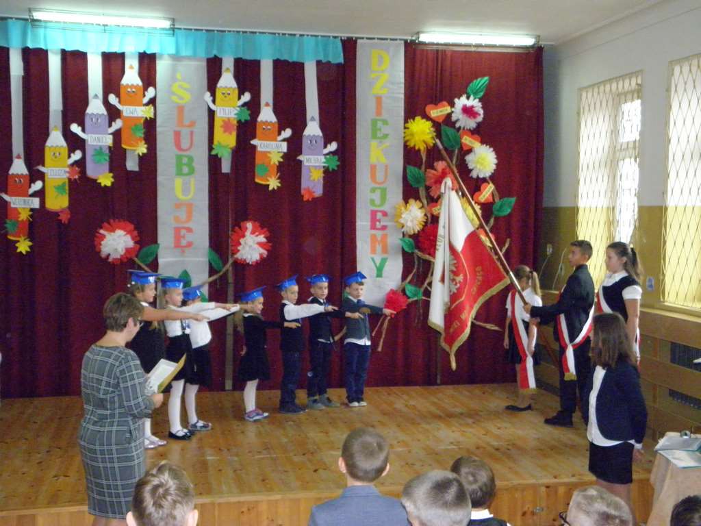 Uroczystość ślubowania uczniów klasy pierwszej połączona była z jeszcze jednym ważnym świętem – obchodami Dnia Edukacji Narodowej. Okolicznościową akademię z tej okazji przygotowała ze swymi uczniami pani Paulina Prażuch.