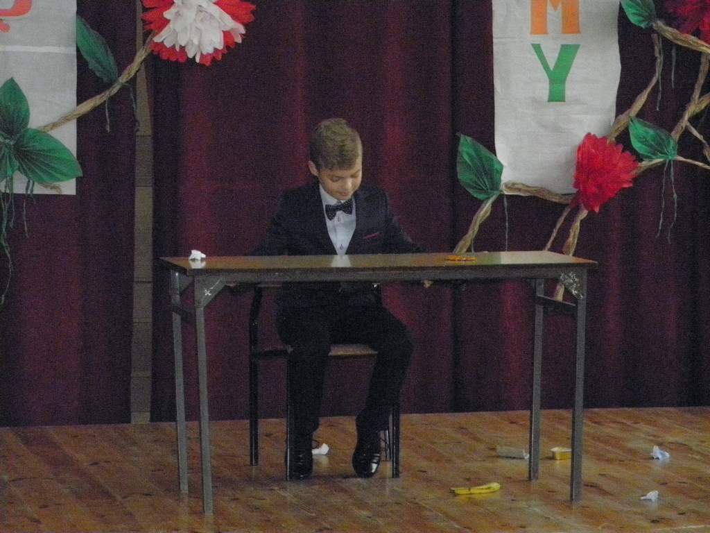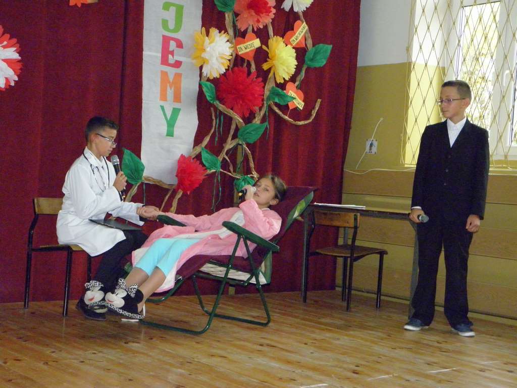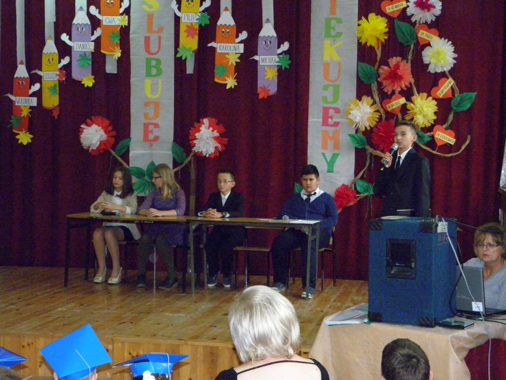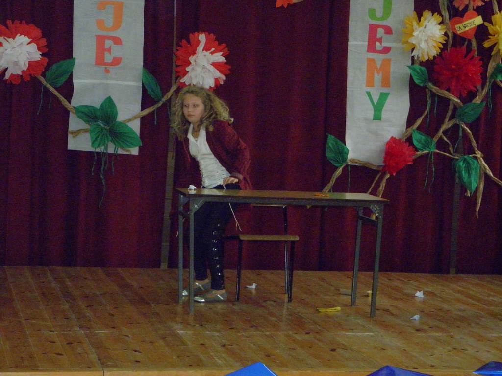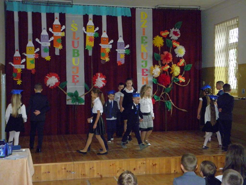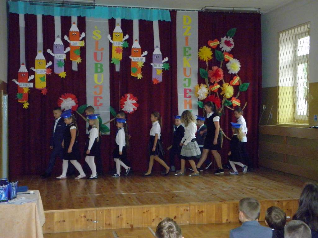 Zanim jednak pierwszaki złożyły uroczyste przyrzeczenie, starały się przekonać brać uczniowską oraz wszystkich zebranych, że są gotowi stać się uczniami jadownickiej szkoły. Prezentację rozpoczął piękny polonez, następnie zaś pierwszoklasiści prezentowali umiejętności recytatorskie i wokalne.  Po takim pokazie pani dyrektor ZSP Wietrzychowice z prawdziwą przyjemnością wzięła do ręki kolorowy ołówek, by wspaniałą siódemkę pasować na uczniów.
