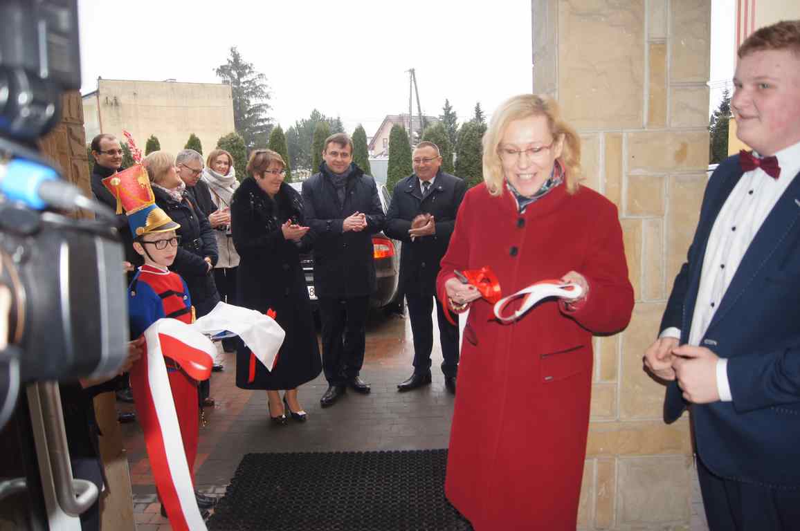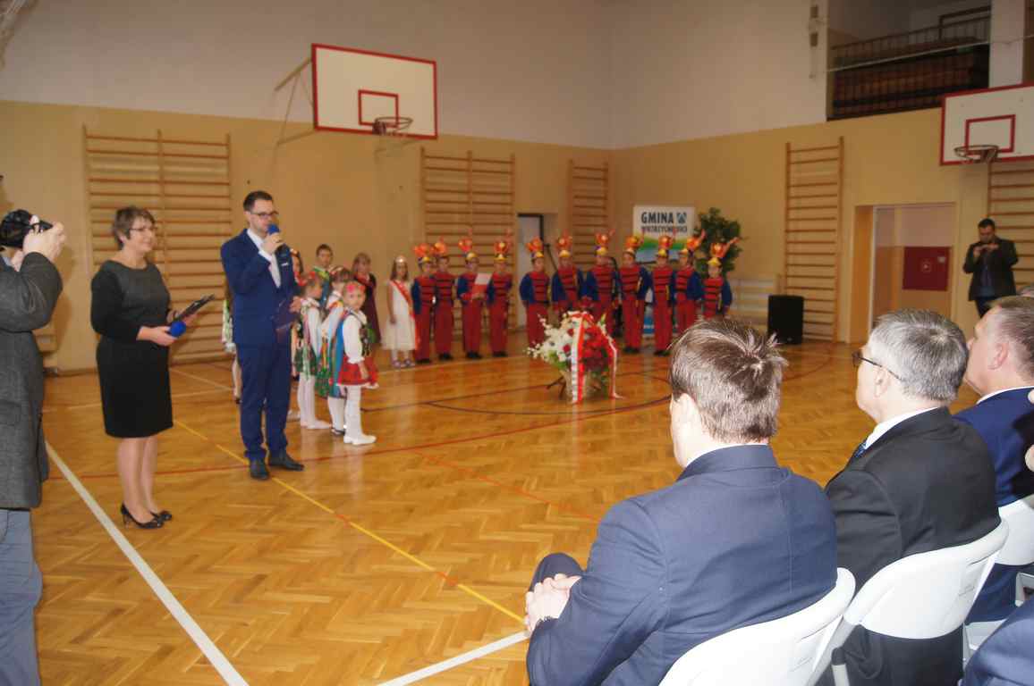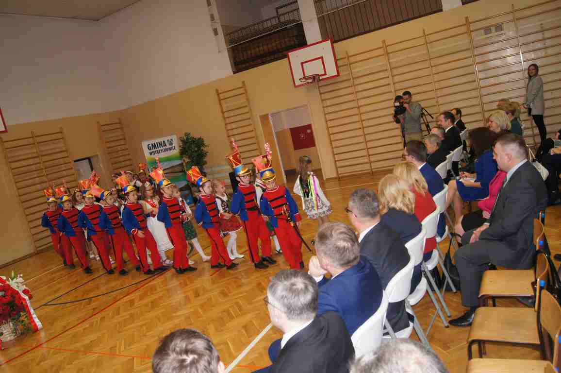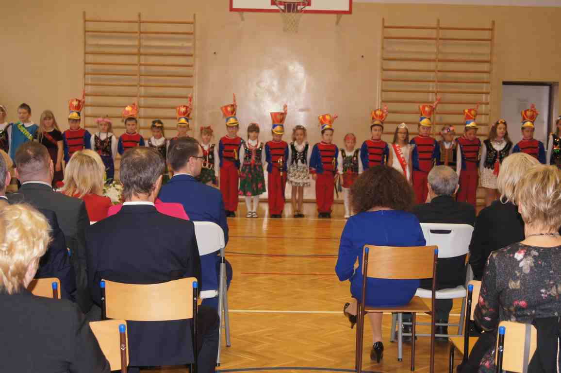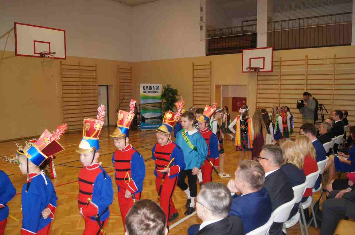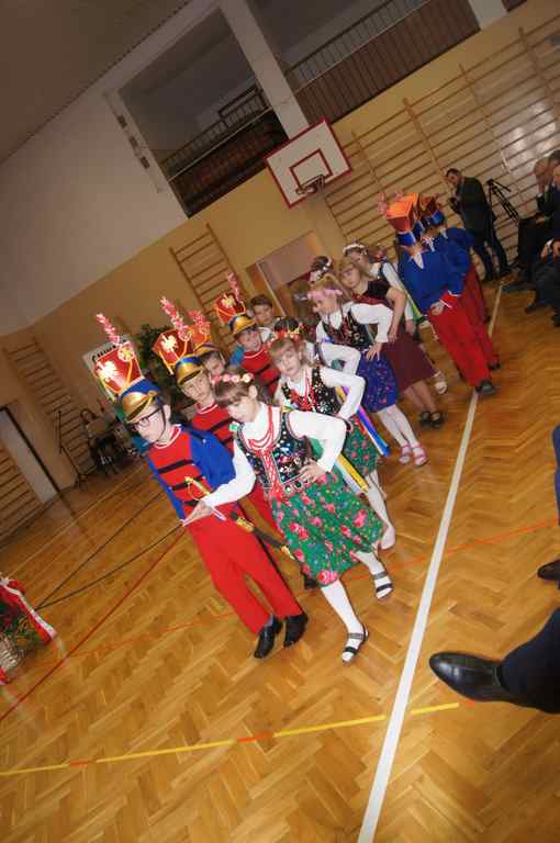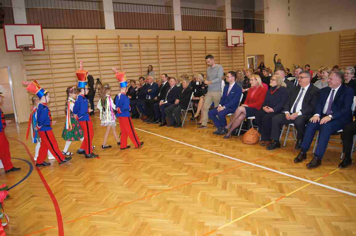 Po oficjalnym przecięciu wstęgi zgromadzeni na sali gimnastycznej goście obejrzeli fragment inscenizacji z okazji Narodowego Święta Niepodległości, którą w tym roku przygotowali uczniowie klasy III pod kierunkiem pań: Alicji Kozioł, Aliny Panek oraz Anny Sochy.