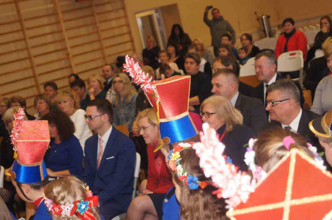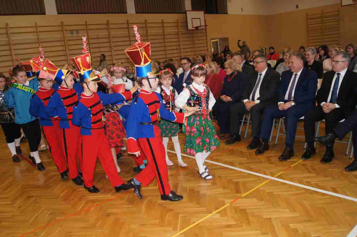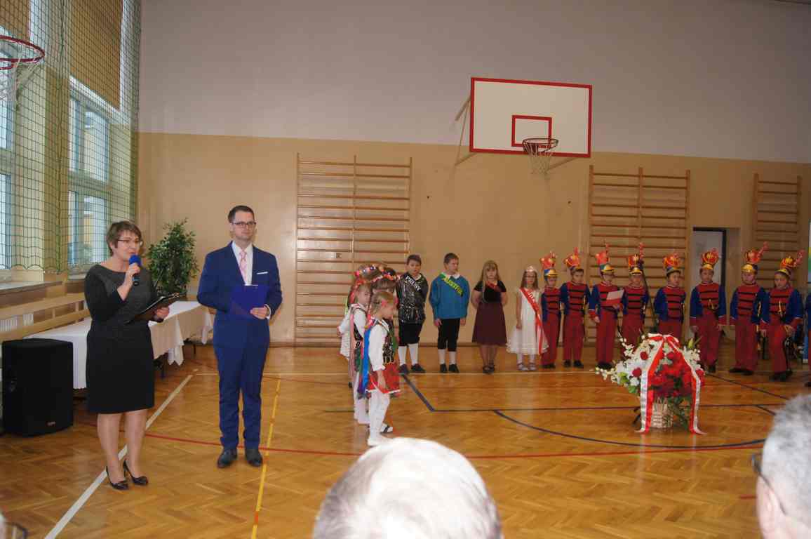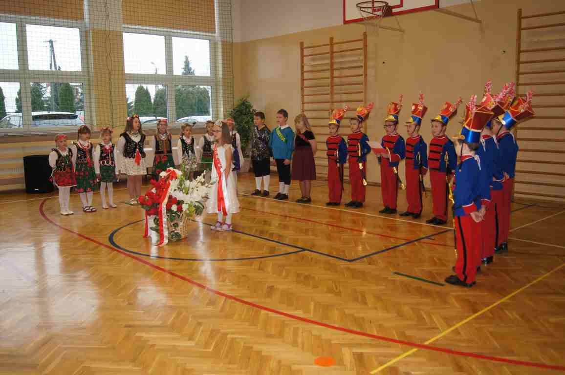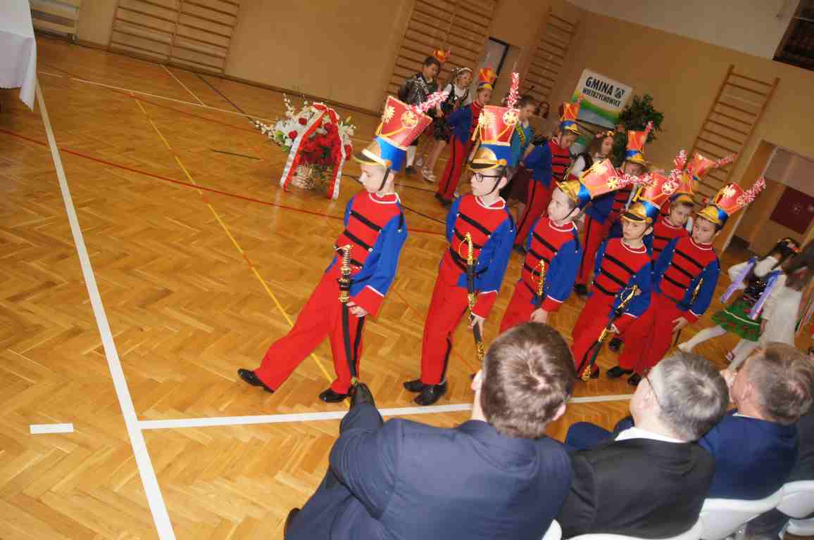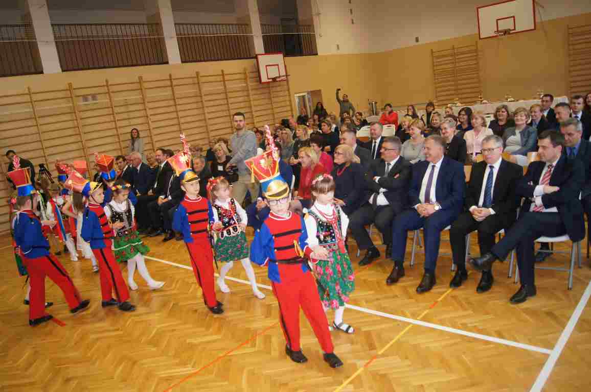 Po oficjalnym przecięciu wstęgi zgromadzeni na sali gimnastycznej goście obejrzeli fragment inscenizacji z okazji Narodowego Święta Niepodległości, którą w tym roku przygotowali uczniowie klasy III pod kierunkiem pań: Alicji Kozioł, Aliny Panek oraz Anny Sochy.