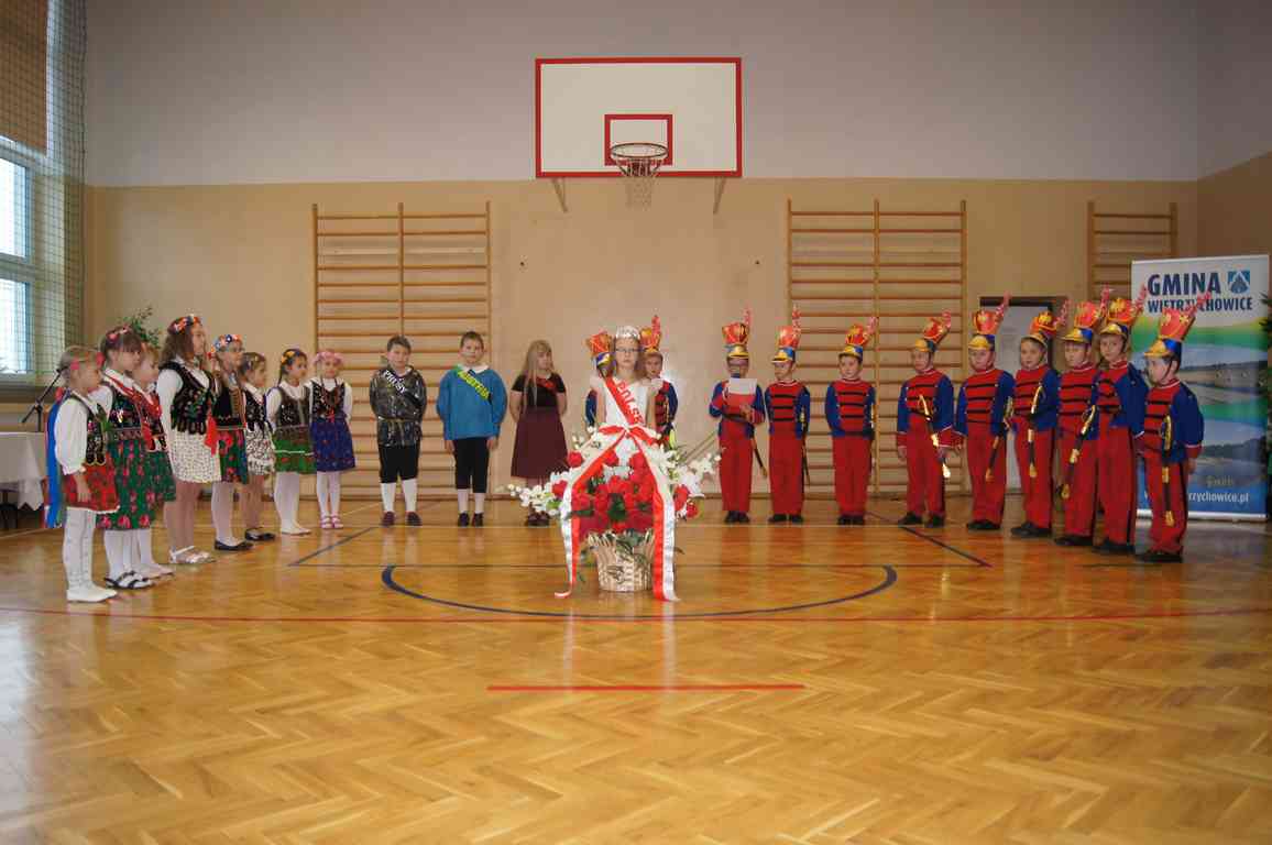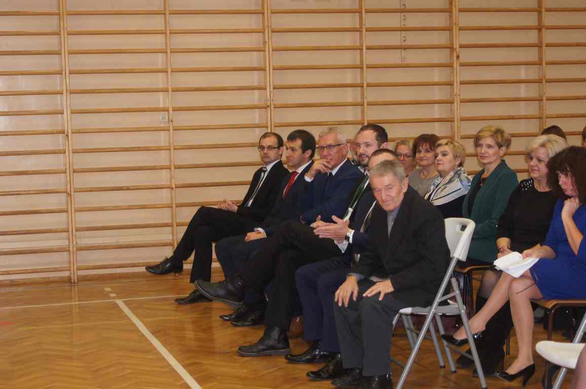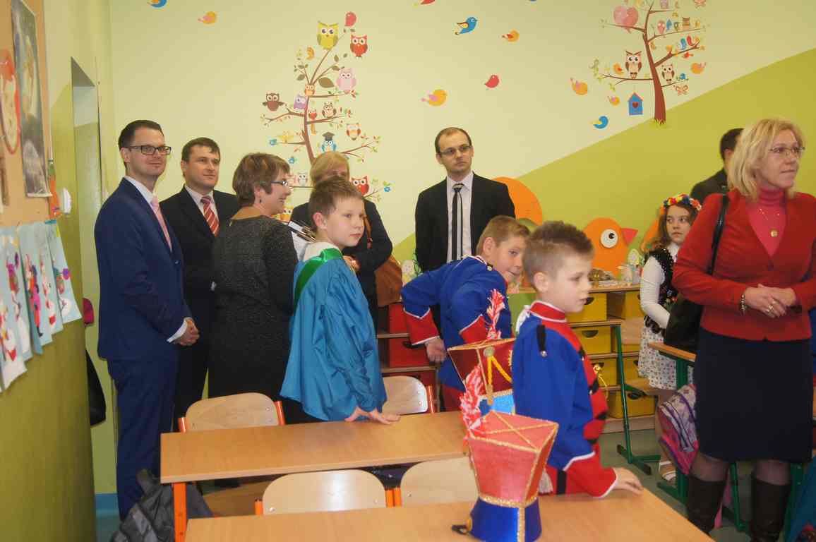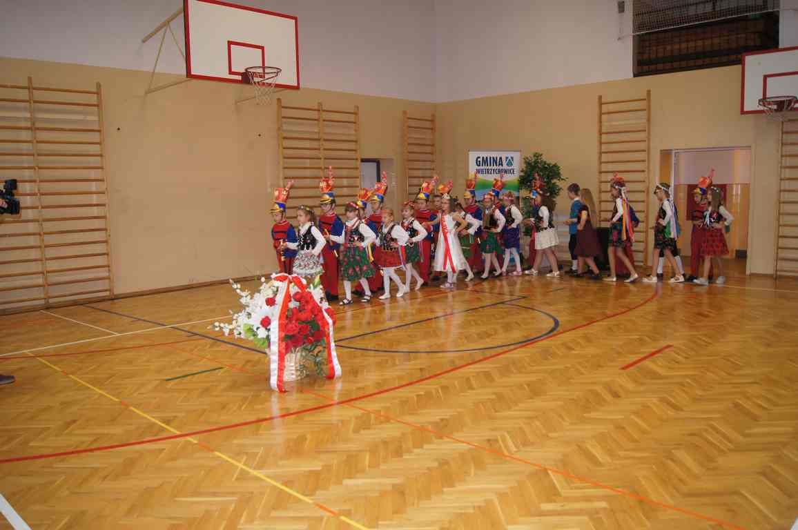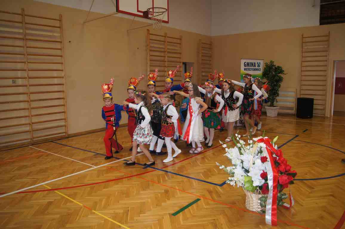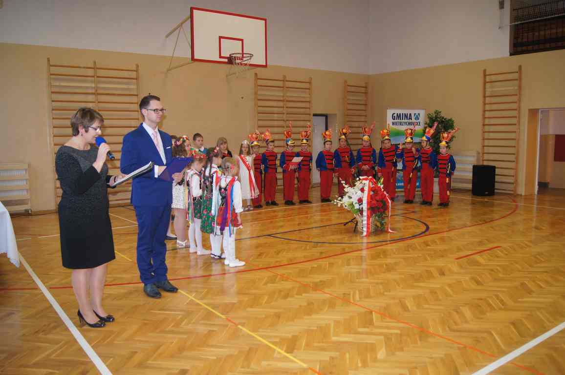 Po oficjalnym przecięciu wstęgi zgromadzeni na sali gimnastycznej goście obejrzeli fragment inscenizacji z okazji Narodowego Święta Niepodległości, którą w tym roku przygotowali uczniowie klasy III pod kierunkiem pań: Alicji Kozioł, Aliny Panek oraz Anny Sochy.