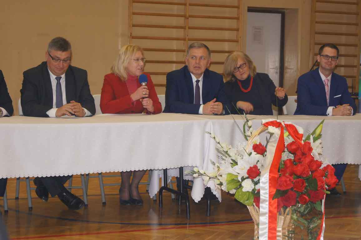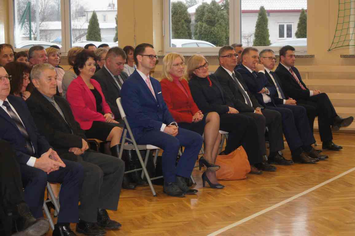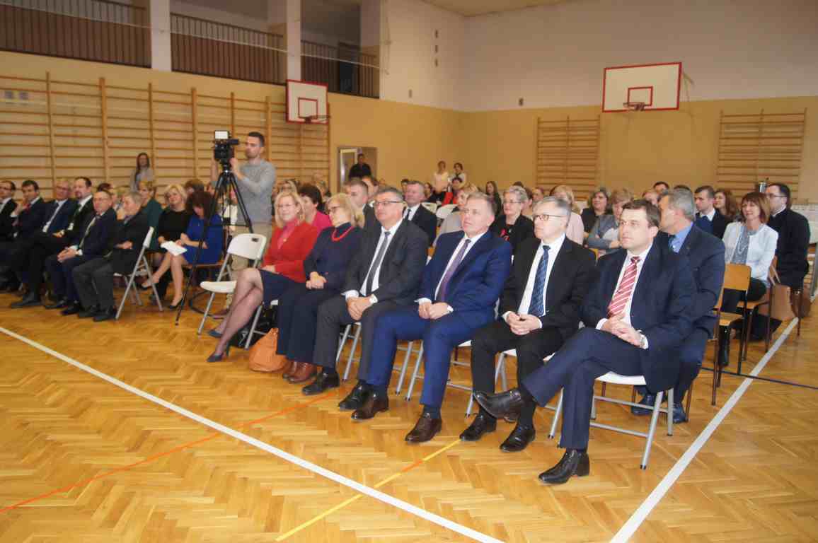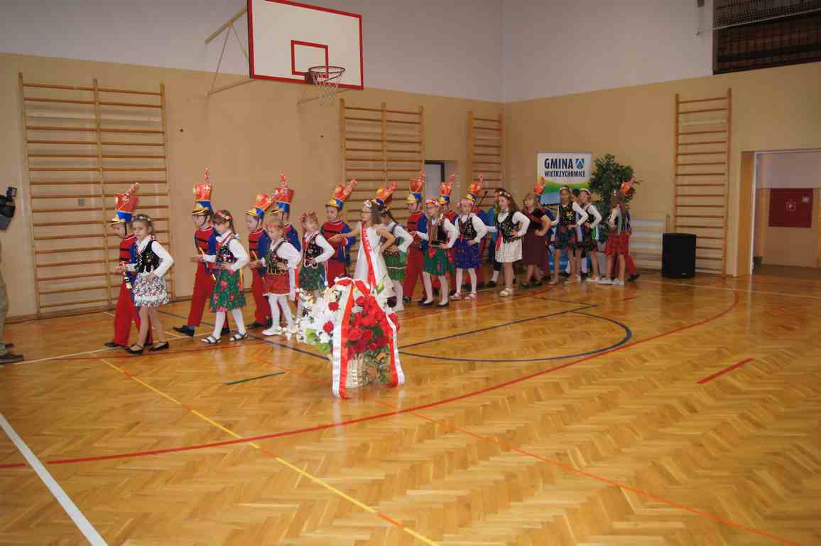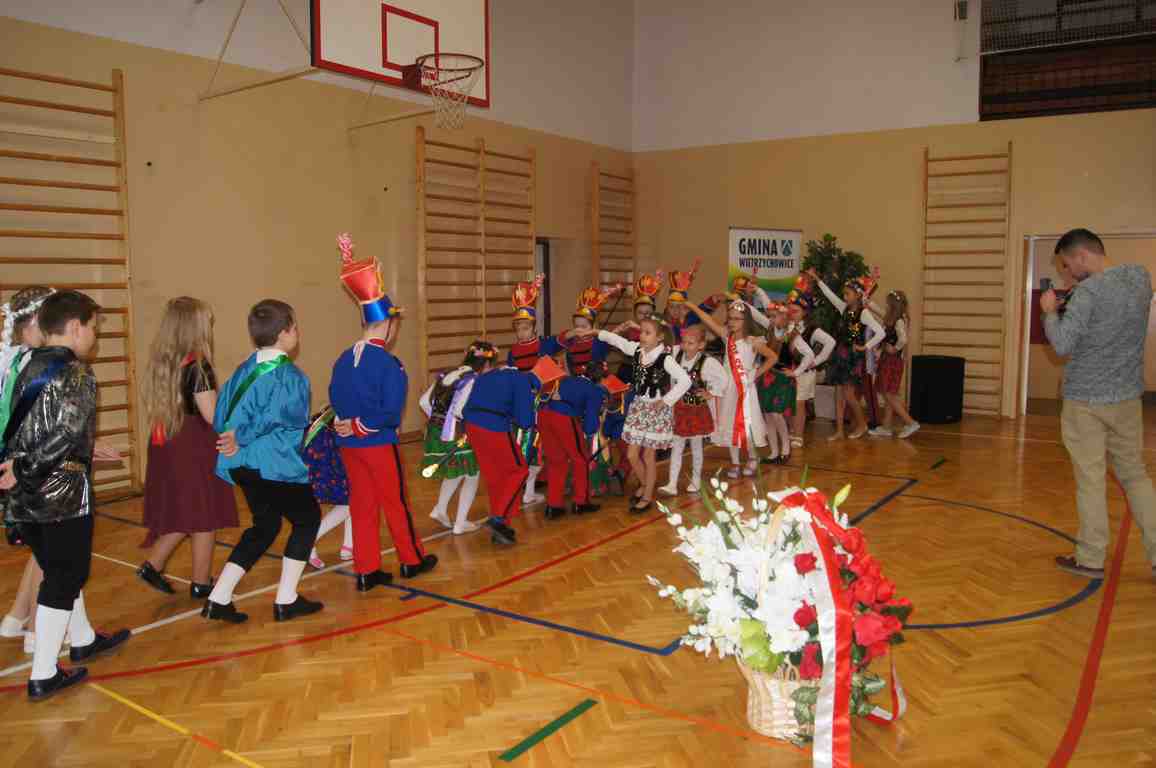 Po oficjalnym przecięciu wstęgi zgromadzeni na sali gimnastycznej goście obejrzeli fragment inscenizacji z okazji Narodowego Święta Niepodległości, którą w tym roku przygotowali uczniowie klasy III pod kierunkiem pań: Alicji Kozioł, Aliny Panek oraz Anny Sochy.