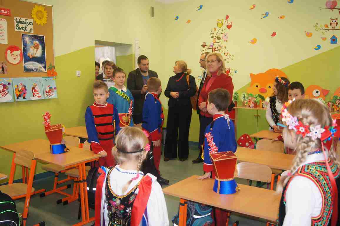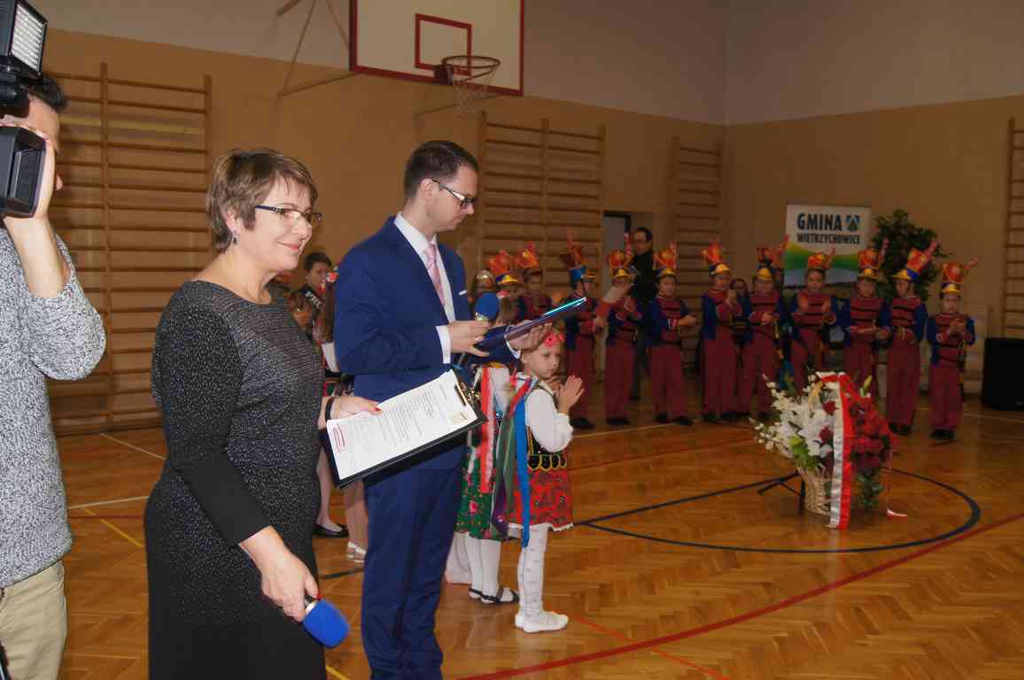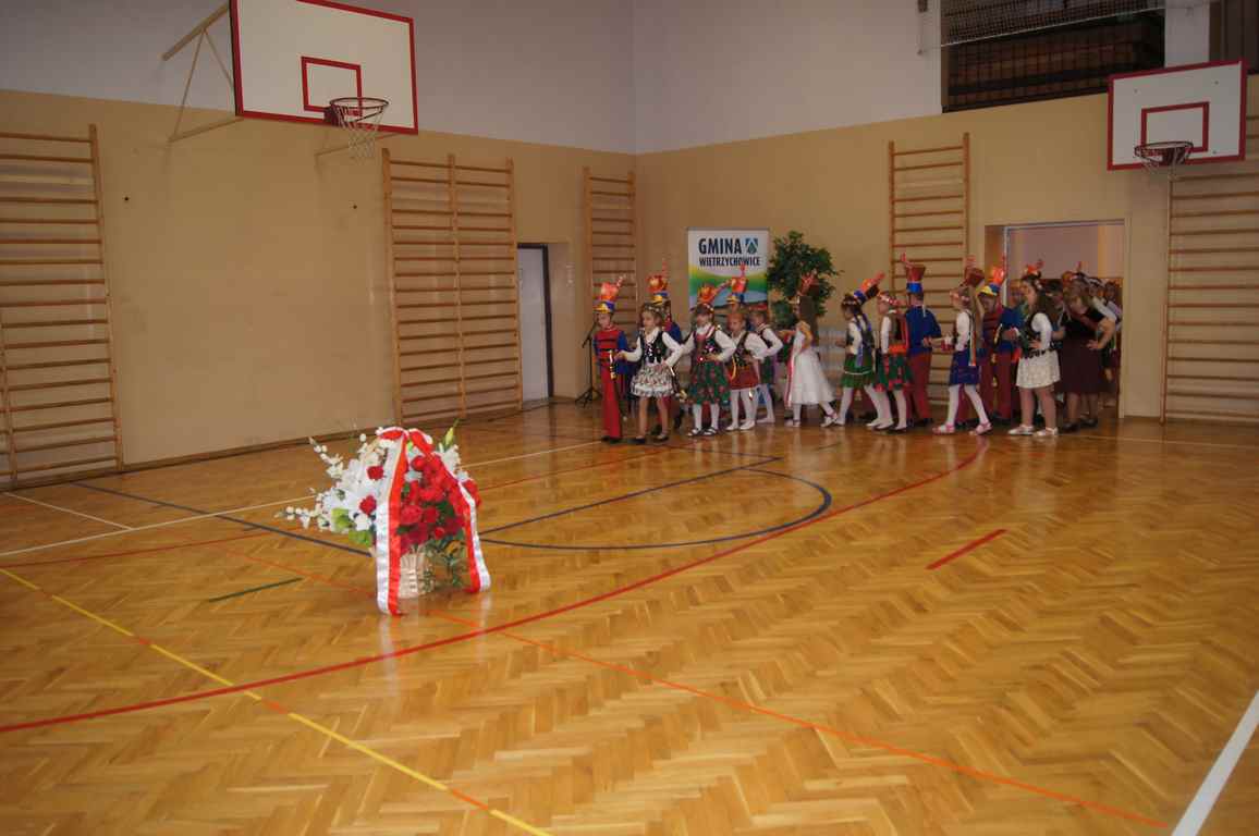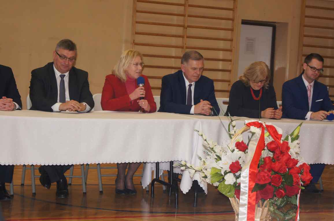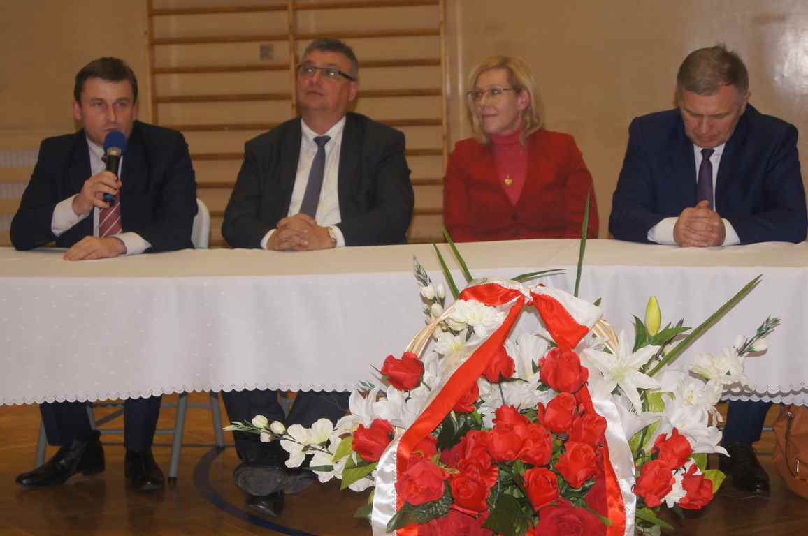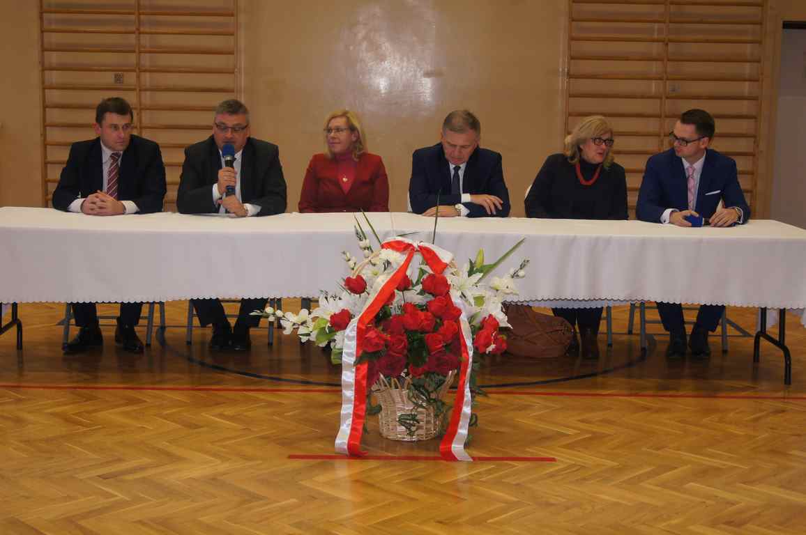 Po oficjalnym przecięciu wstęgi zgromadzeni na sali gimnastycznej goście obejrzeli fragment inscenizacji z okazji Narodowego Święta Niepodległości, którą w tym roku przygotowali uczniowie klasy III pod kierunkiem pań: Alicji Kozioł, Aliny Panek oraz Anny Sochy.