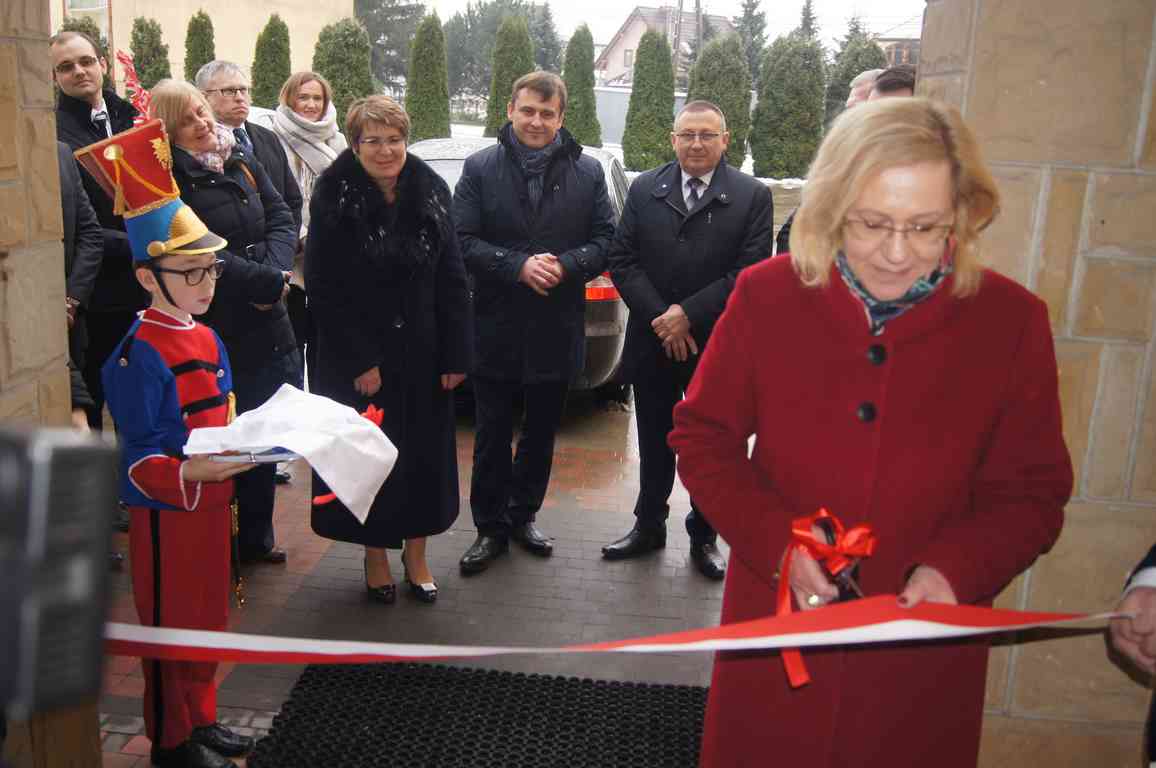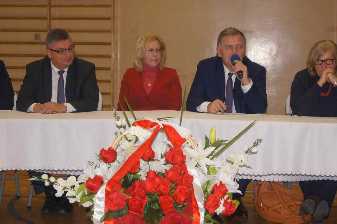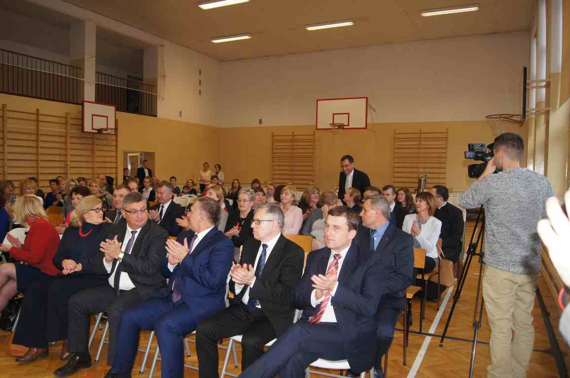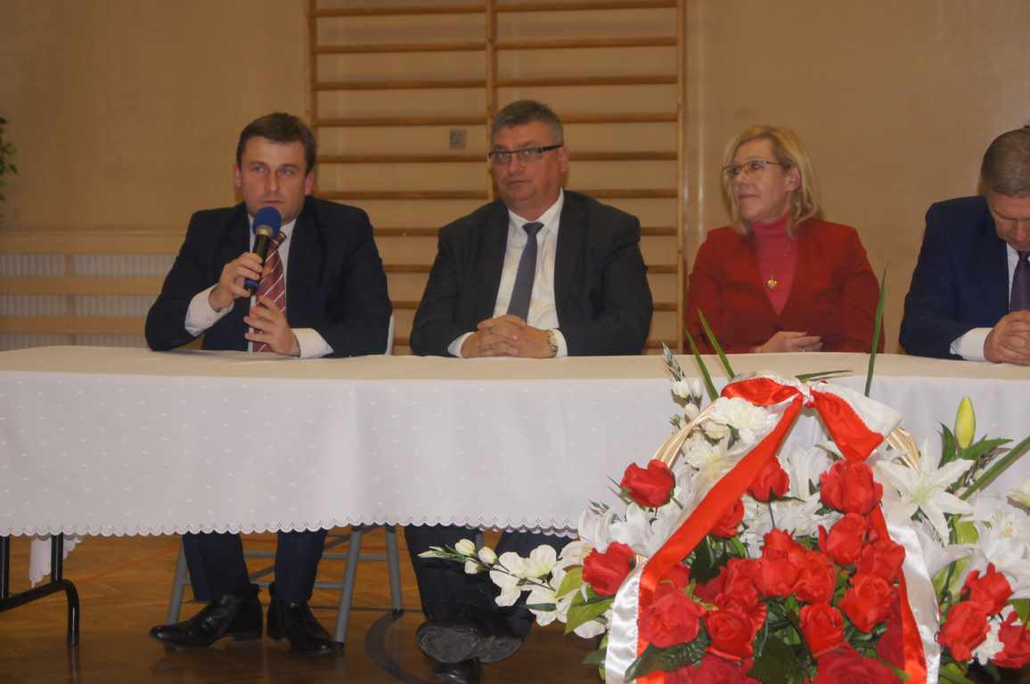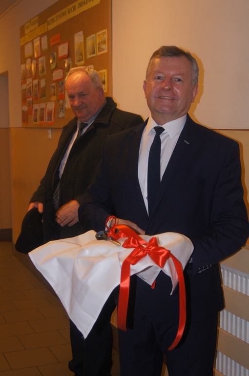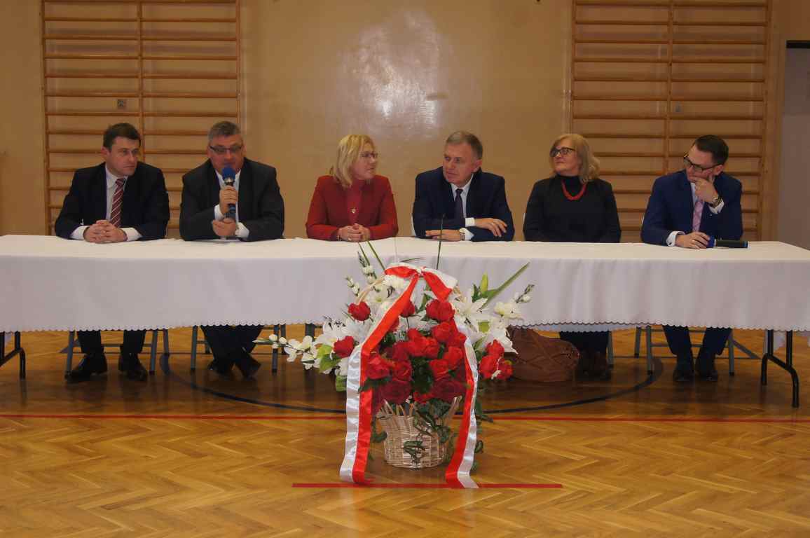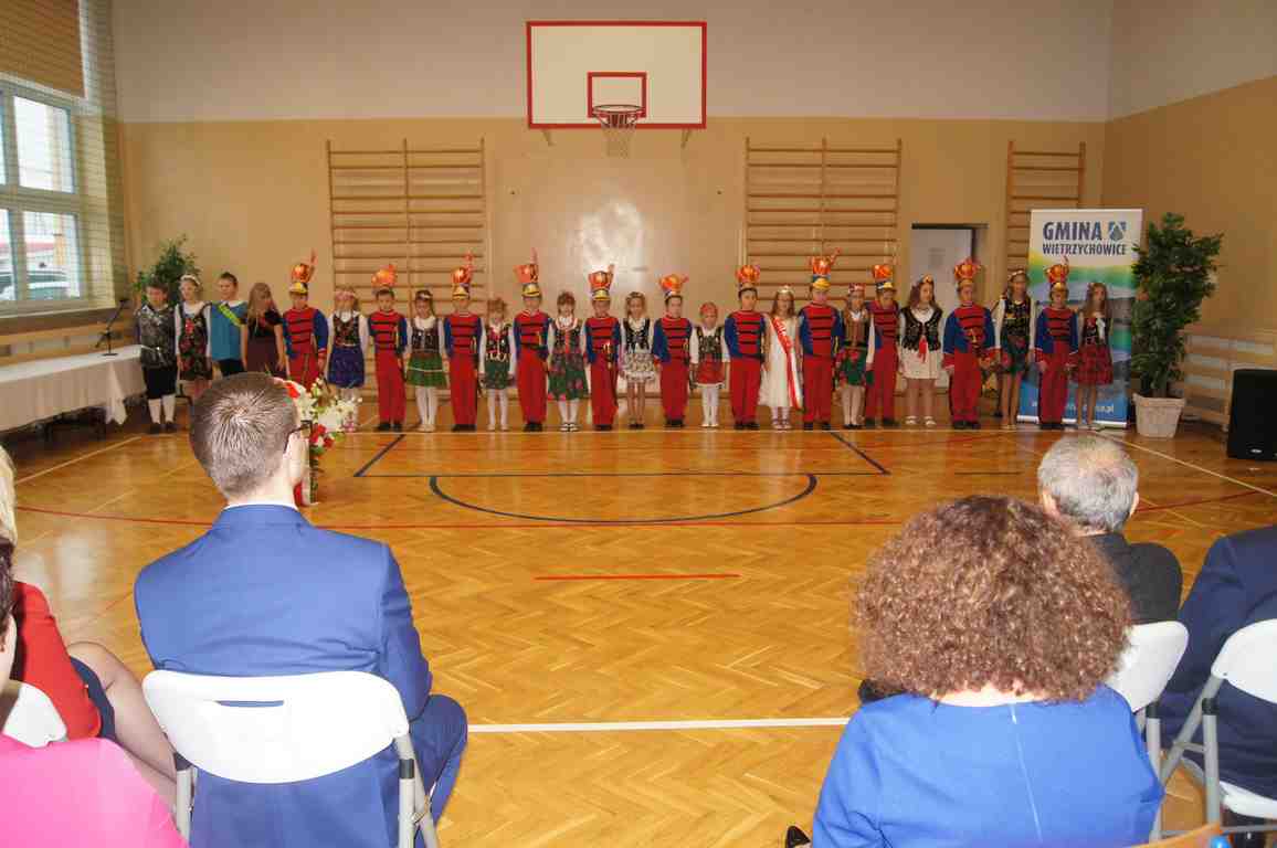 Po oficjalnym przecięciu wstęgi zgromadzeni na sali gimnastycznej goście obejrzeli fragment inscenizacji z okazji Narodowego Święta Niepodległości, którą w tym roku przygotowali uczniowie klasy III pod kierunkiem pań: Alicji Kozioł, Aliny Panek oraz Anny Sochy.