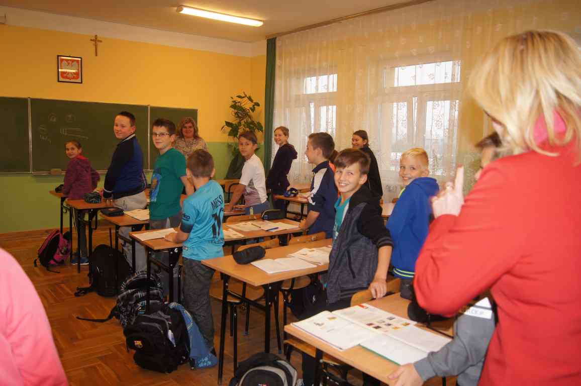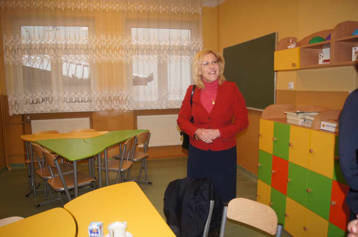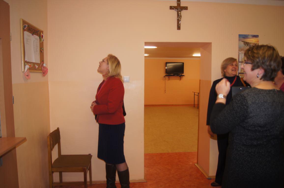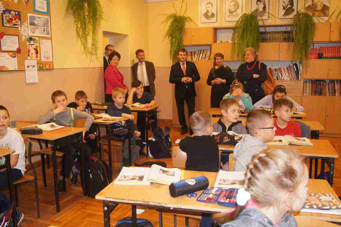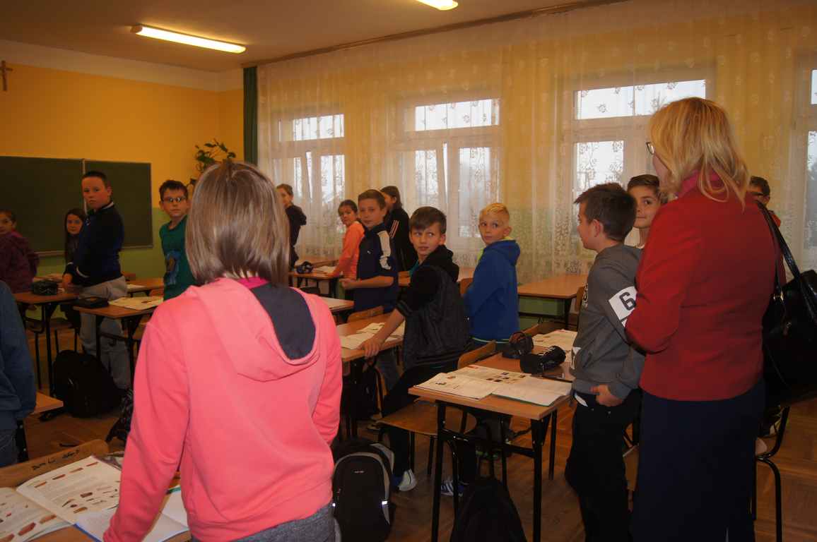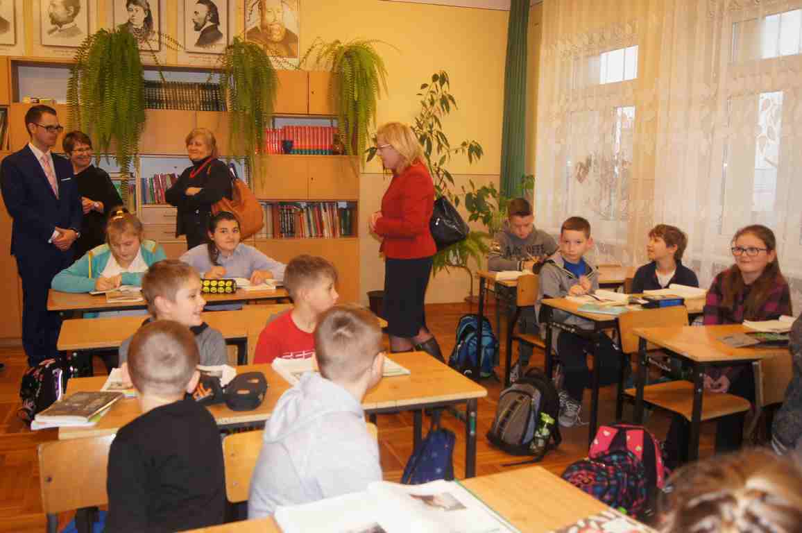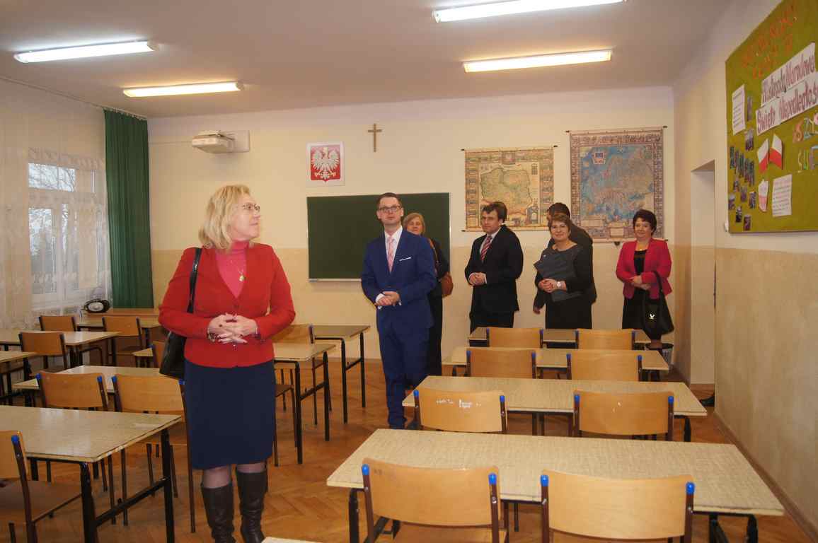 Pani kurator swoją wizytę rozpoczęła od spaceru po szkole. Interesowała się zarówno warunkami, w jakich uczą się uczniowie, jak i tym, czy czują się z nami dobrze i bezpiecznie. Z przyjemnością słuchaliśmy szczerych słów uznania, jakie pani kurator kierowała w stronę dyrekcji szkoły, pana wójta, Tomasza Banka oraz nauczycieli, pracowników obsługi i wszystkich, dzięki którym szkoła jest ładna, zadbana i bardzo dobrze wyposażona. Duże wrażenie zrobiły na naszym gościu przestronne, jasne sale lekcyjne z nowoczesnymi meblami i pomocami dydaktycznymi oraz funkcjonalne łazienki. Z przyjemnością obejrzała kolorowe szafki w szatniach, stwierdzając nawet, że w takim pomieszczeniu z ochotą spędziłaby przerwę międzylekcyjną. Miłe słowa skierowała również w stronę uczniów, z którymi miała okazję porozmawiać podczas oglądania szkoły i którzy (co szczególnie podkreślała) wypowiadali się na nasz temat bardzo pozytywnie, byli uśmiechnięci, zadowoleni i przyjaźnie nastawieni do szkoły i wszystkiego, co z nią związane.