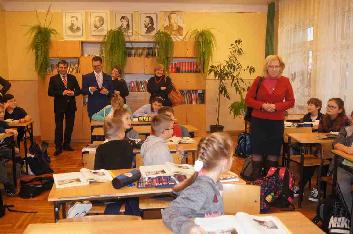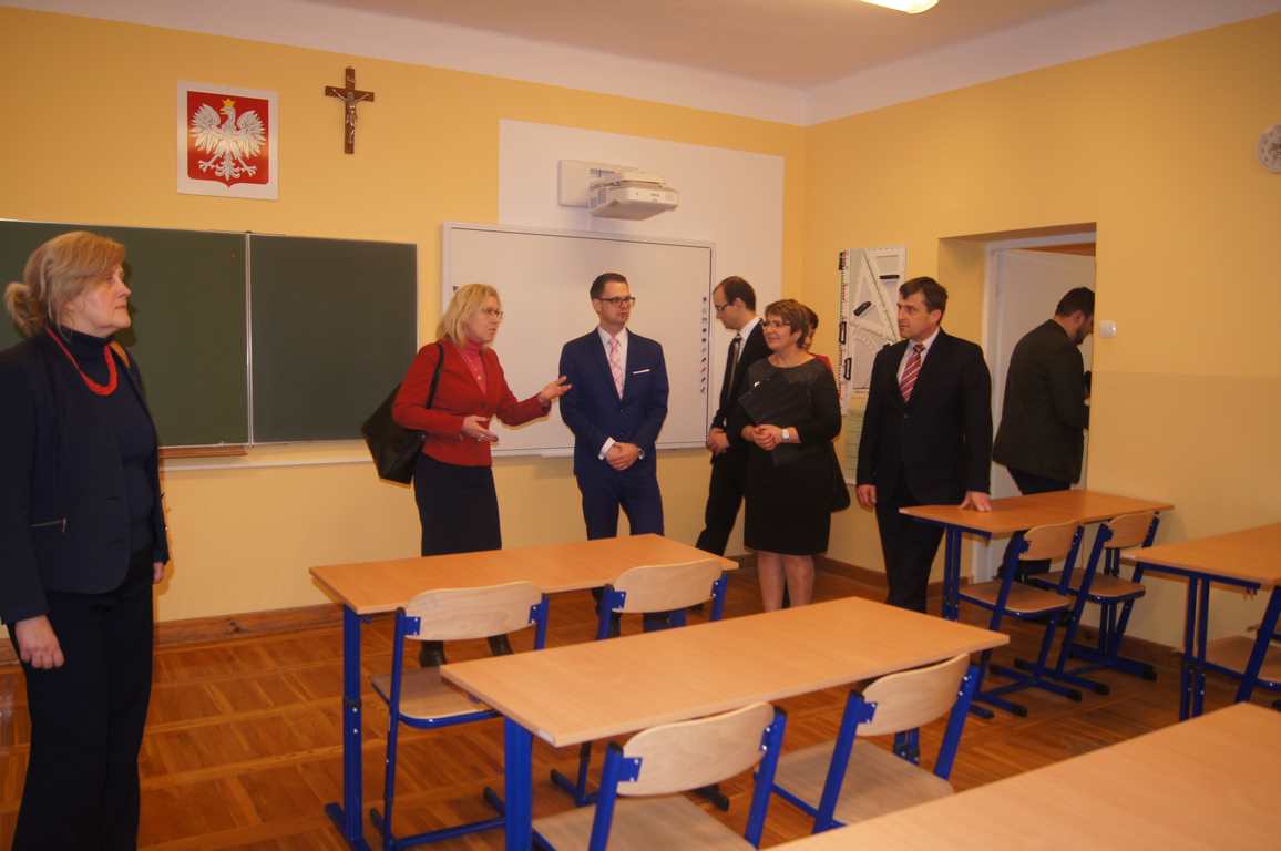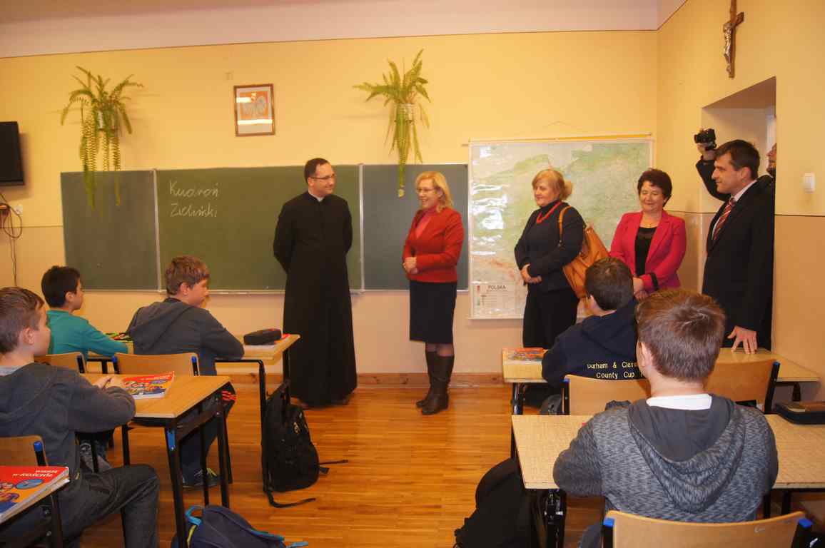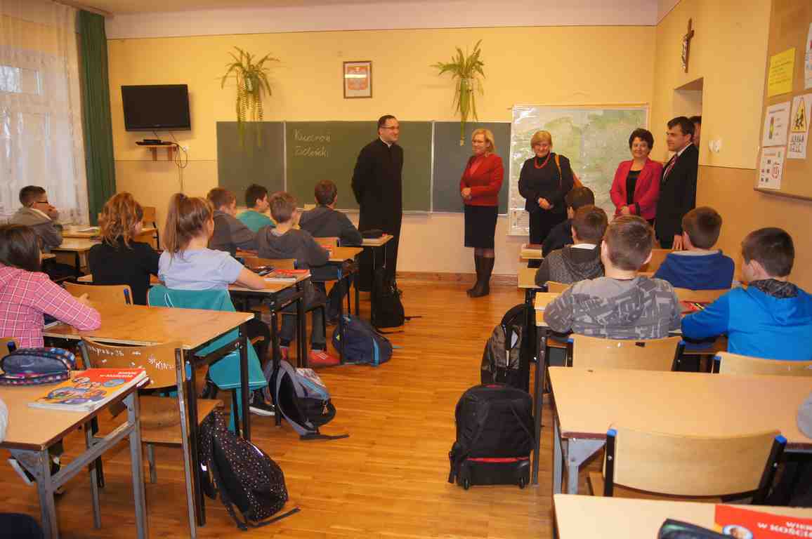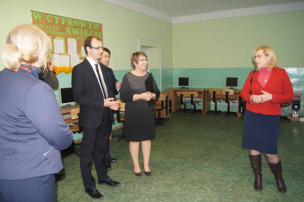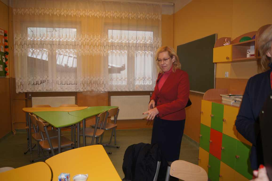 Pani kurator swoją wizytę rozpoczęła od spaceru po szkole. Interesowała się zarówno warunkami, w jakich uczą się uczniowie, jak i tym, czy czują się z nami dobrze i bezpiecznie. Z przyjemnością słuchaliśmy szczerych słów uznania, jakie pani kurator kierowała w stronę dyrekcji szkoły, pana wójta, Tomasza Banka oraz nauczycieli, pracowników obsługi i wszystkich, dzięki którym szkoła jest ładna, zadbana i bardzo dobrze wyposażona. Duże wrażenie zrobiły na naszym gościu przestronne, jasne sale lekcyjne z nowoczesnymi meblami i pomocami dydaktycznymi oraz funkcjonalne łazienki. Z przyjemnością obejrzała kolorowe szafki w szatniach, stwierdzając nawet, że w takim pomieszczeniu z ochotą spędziłaby przerwę międzylekcyjną. Miłe słowa skierowała również w stronę uczniów, z którymi miała okazję porozmawiać podczas oglądania szkoły i którzy (co szczególnie podkreślała) wypowiadali się na nasz temat bardzo pozytywnie, byli uśmiechnięci, zadowoleni i przyjaźnie nastawieni do szkoły i wszystkiego, co z nią związane.