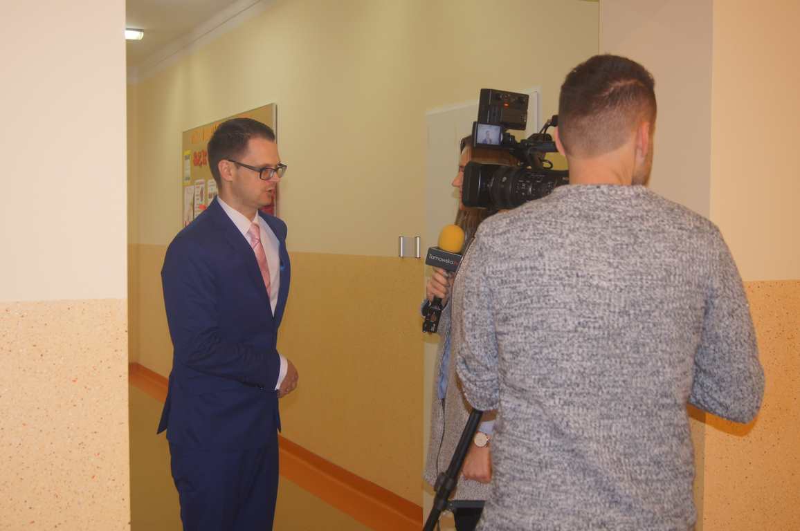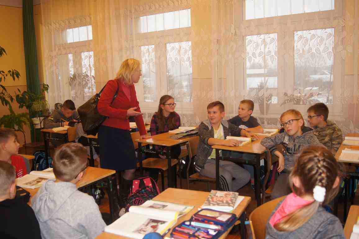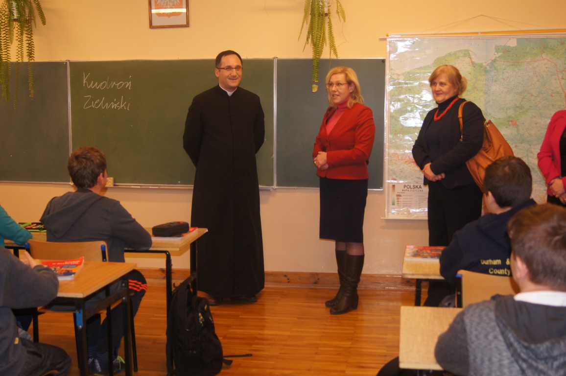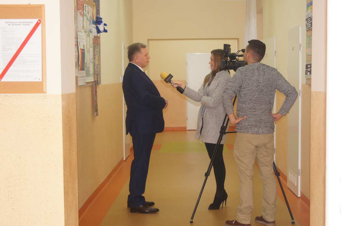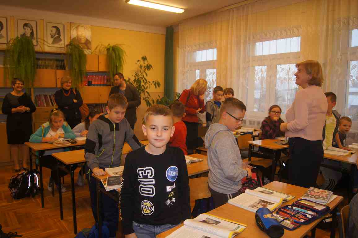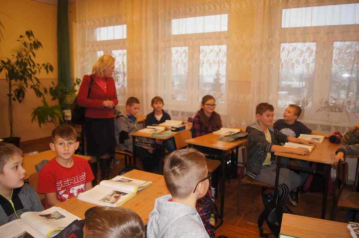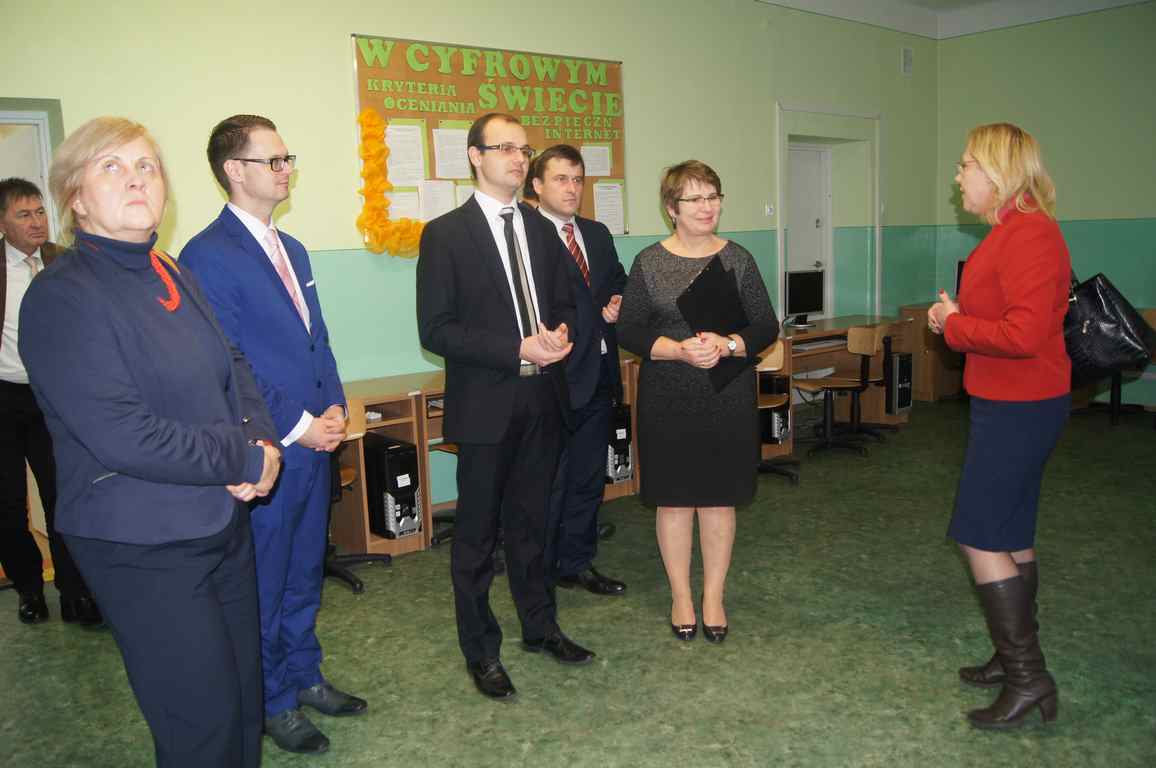 Pani kurator swoją wizytę rozpoczęła od spaceru po szkole. Interesowała się zarówno warunkami, w jakich uczą się uczniowie, jak i tym, czy czują się z nami dobrze i bezpiecznie. Z przyjemnością słuchaliśmy szczerych słów uznania, jakie pani kurator kierowała w stronę dyrekcji szkoły, pana wójta, Tomasza Banka oraz nauczycieli, pracowników obsługi i wszystkich, dzięki którym szkoła jest ładna, zadbana i bardzo dobrze wyposażona. Duże wrażenie zrobiły na naszym gościu przestronne, jasne sale lekcyjne z nowoczesnymi meblami i pomocami dydaktycznymi oraz funkcjonalne łazienki. Z przyjemnością obejrzała kolorowe szafki w szatniach, stwierdzając nawet, że w takim pomieszczeniu z ochotą spędziłaby przerwę międzylekcyjną. Miłe słowa skierowała również w stronę uczniów, z którymi miała okazję porozmawiać podczas oglądania szkoły i którzy (co szczególnie podkreślała) wypowiadali się na nasz temat bardzo pozytywnie, byli uśmiechnięci, zadowoleni i przyjaźnie nastawieni do szkoły i wszystkiego, co z nią związane.
