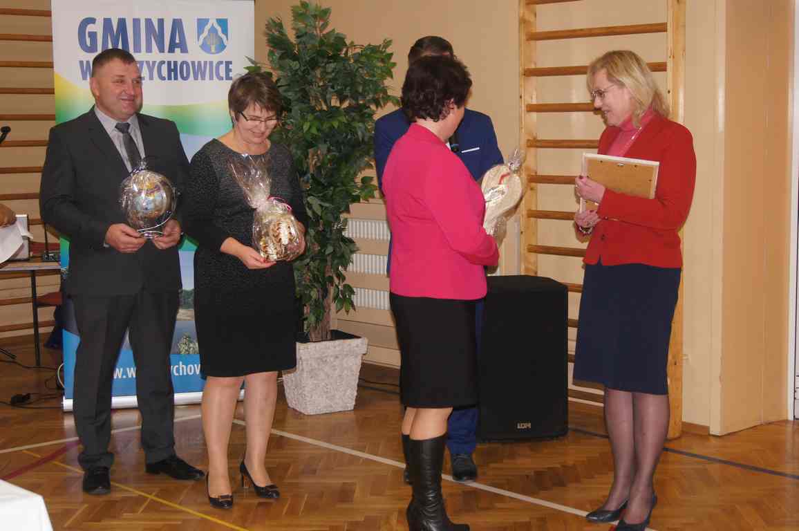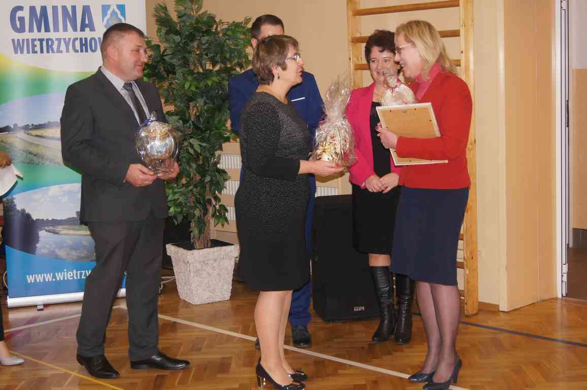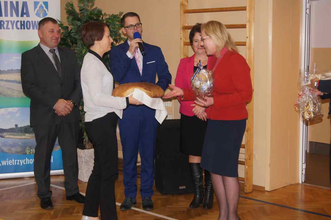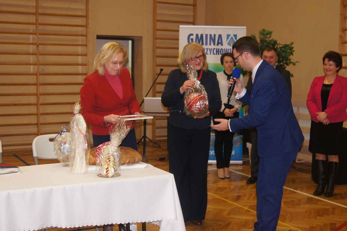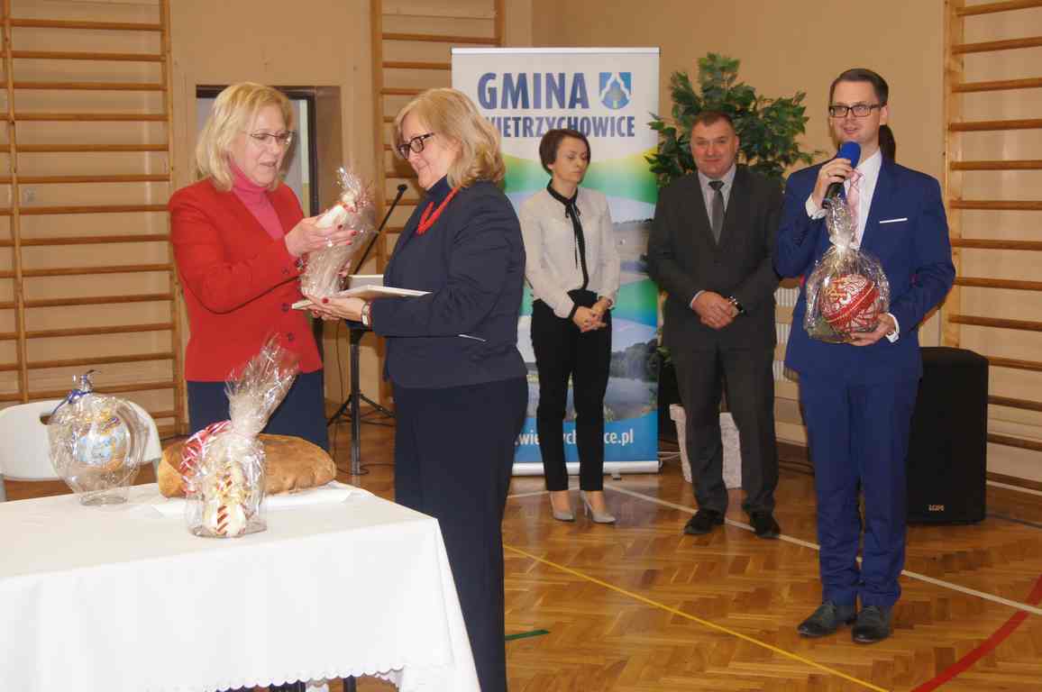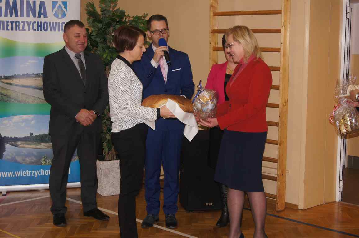 Po zakończeniu konferencji Wójt Gminy Wietrzychowice, pan Tomasz Banek złożył serdeczne podziękowania pani kurator za wsparcie, rady i wskazówki, jakich chętnie udzielała zawsze, kiedy się o nie zwracano. Pan wójt podkreślił, że pomoc i wyraźna chęć współpracy, którą oferowało Małopolskie Kuratorium Oświaty pozwoliły prawidłowo przeprowadzić reformę edukacji w naszej gminie. W dowód wdzięczności organizatorzy wręczyli pani kurator oraz pani dyrektor upominki kojarzące się z naszą gminą, a następnie zaprosili wszystkich do szwedzkiego stołu, gdzie przy kawie, herbacie i smacznej przekąsce można było kontynuować rozmowy w mniej oficjalnych warunkach.