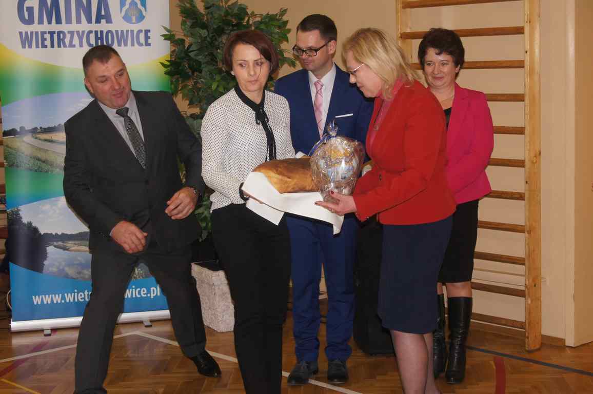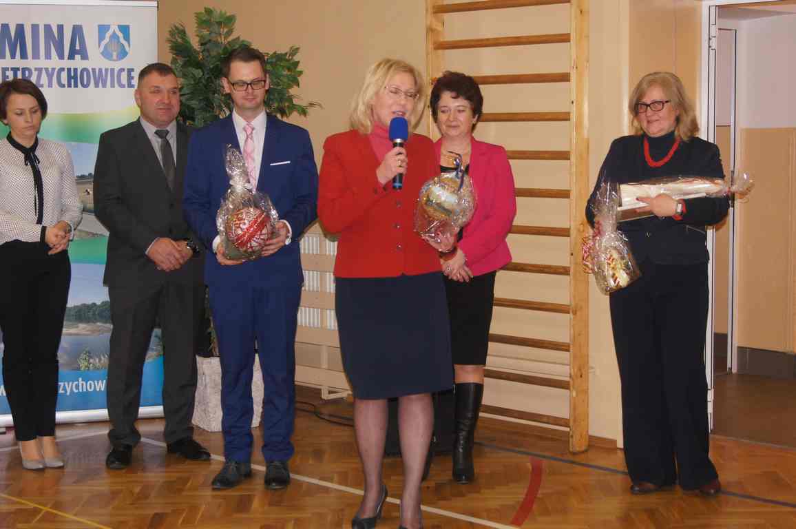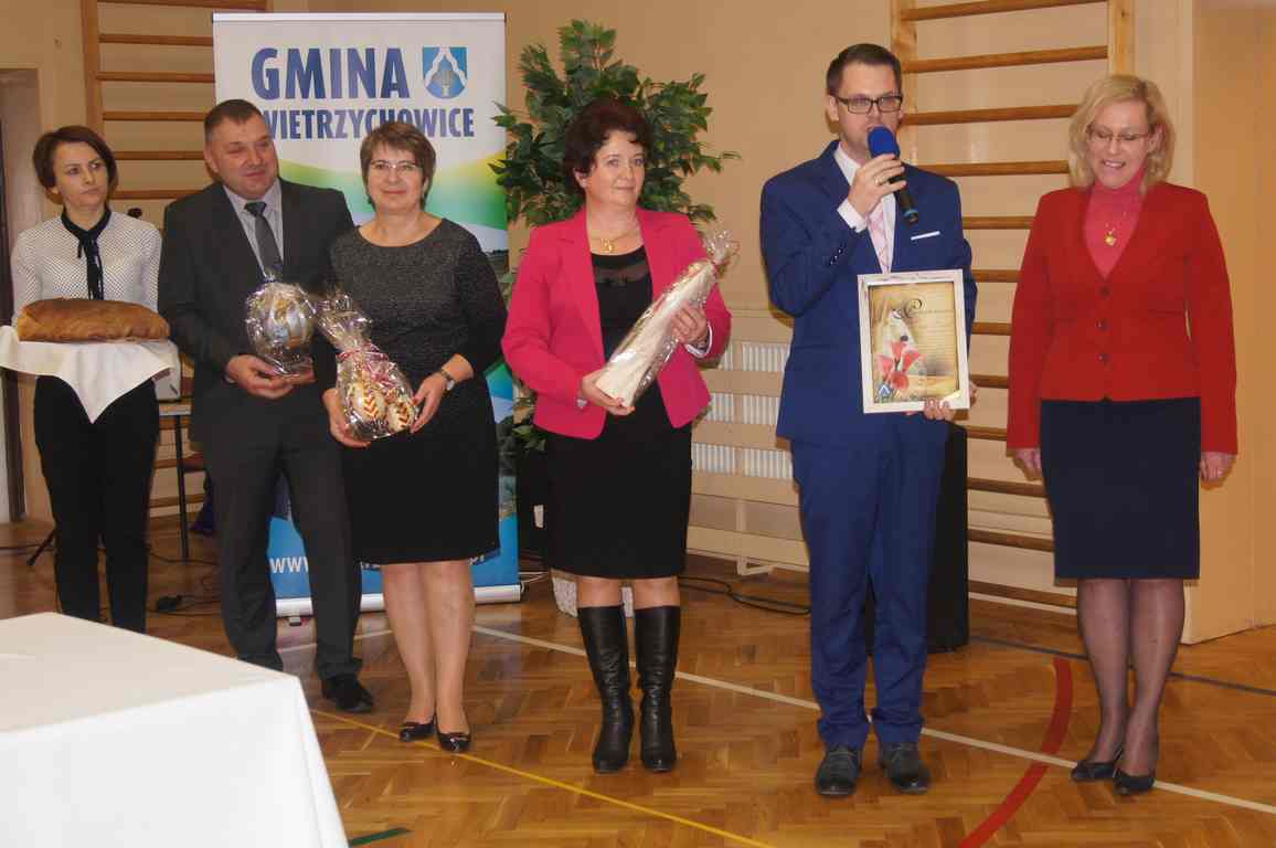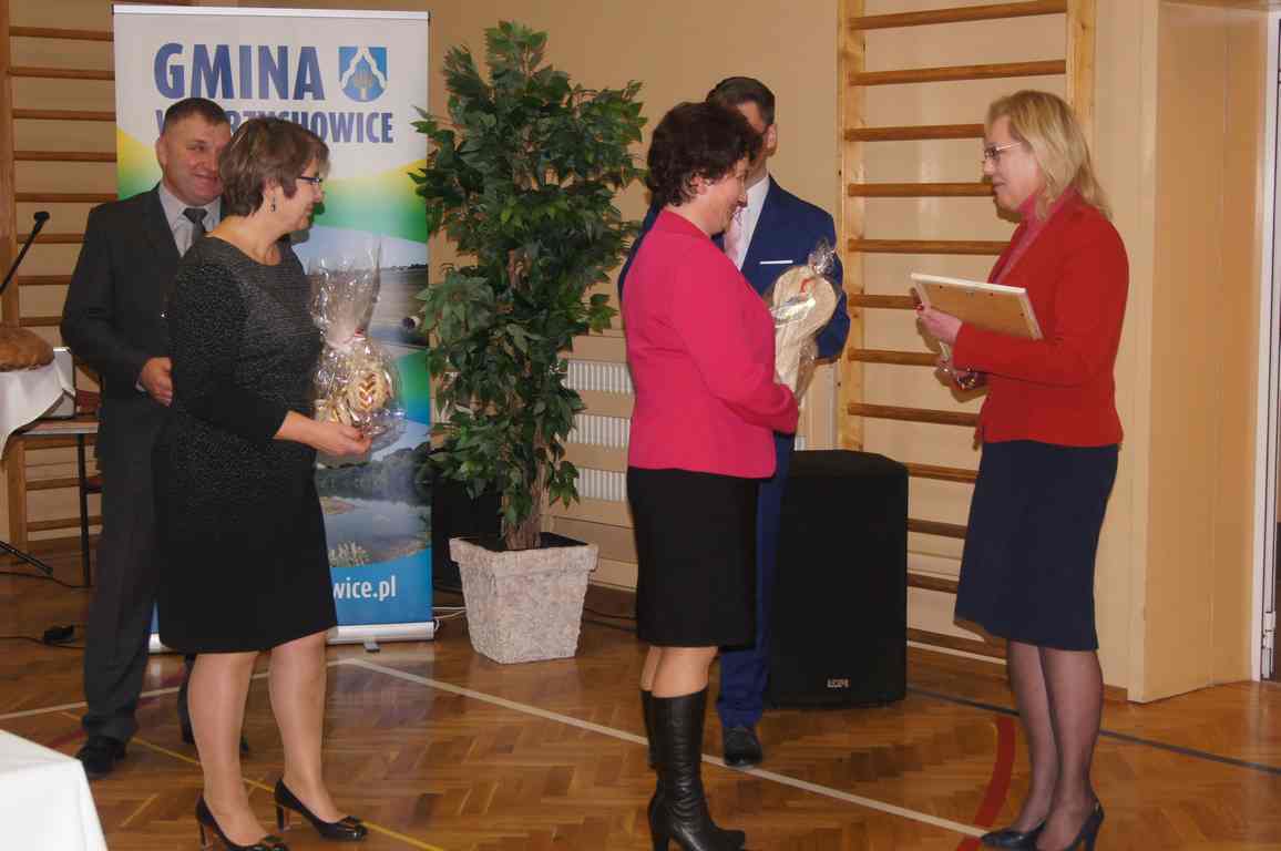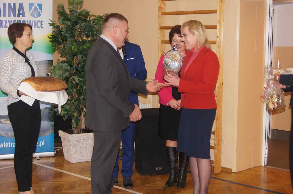 Po zakończeniu konferencji Wójt Gminy Wietrzychowice, pan Tomasz Banek złożył serdeczne podziękowania pani kurator za wsparcie, rady i wskazówki, jakich chętnie udzielała zawsze, kiedy się o nie zwracano. Pan wójt podkreślił, że pomoc i wyraźna chęć współpracy, którą oferowało Małopolskie Kuratorium Oświaty pozwoliły prawidłowo przeprowadzić reformę edukacji w naszej gminie. W dowód wdzięczności organizatorzy wręczyli pani kurator oraz pani dyrektor upominki kojarzące się z naszą gminą, a następnie zaprosili wszystkich do szwedzkiego stołu, gdzie przy kawie, herbacie i smacznej przekąsce można było kontynuować rozmowy w mniej oficjalnych warunkach.