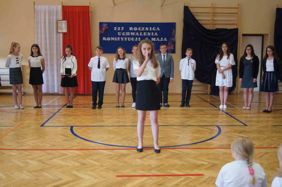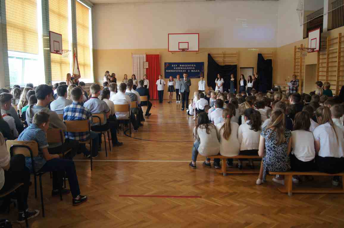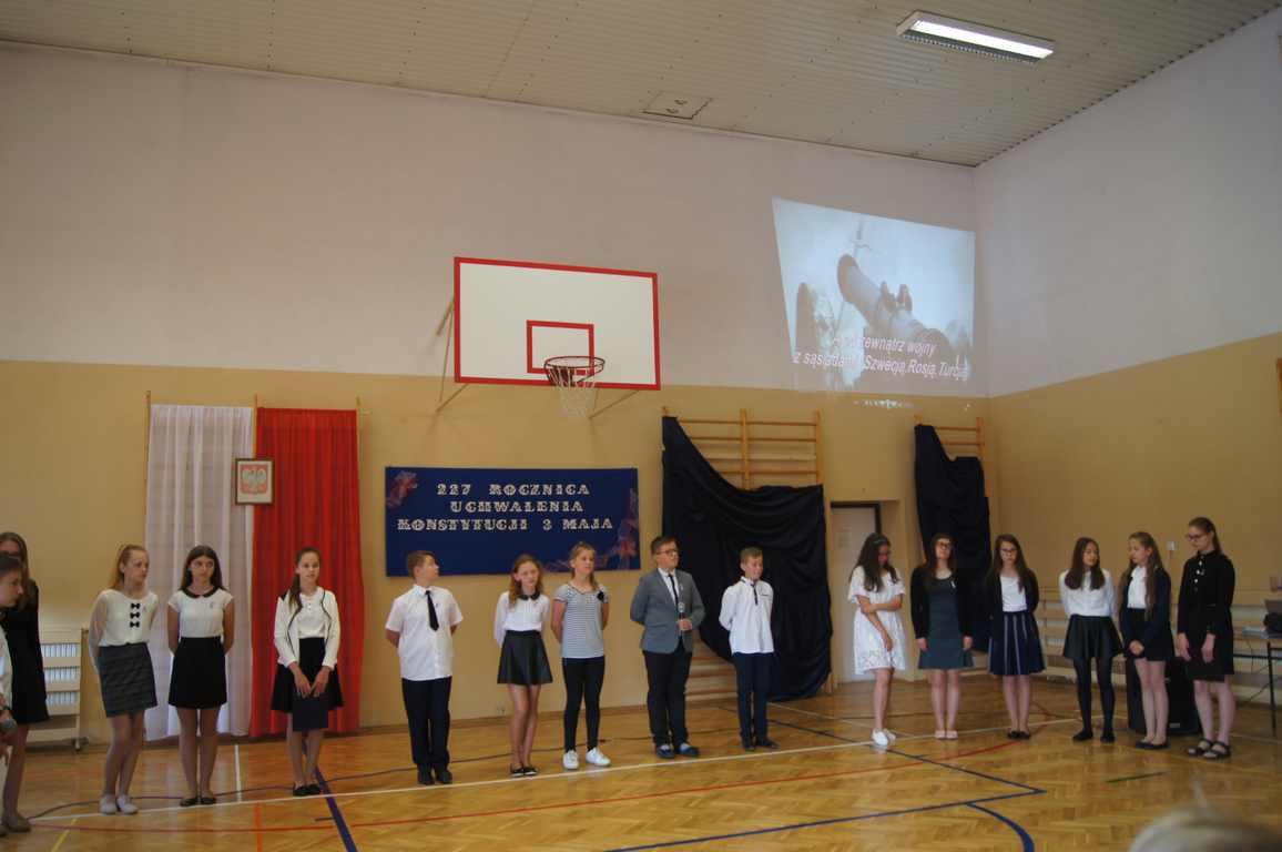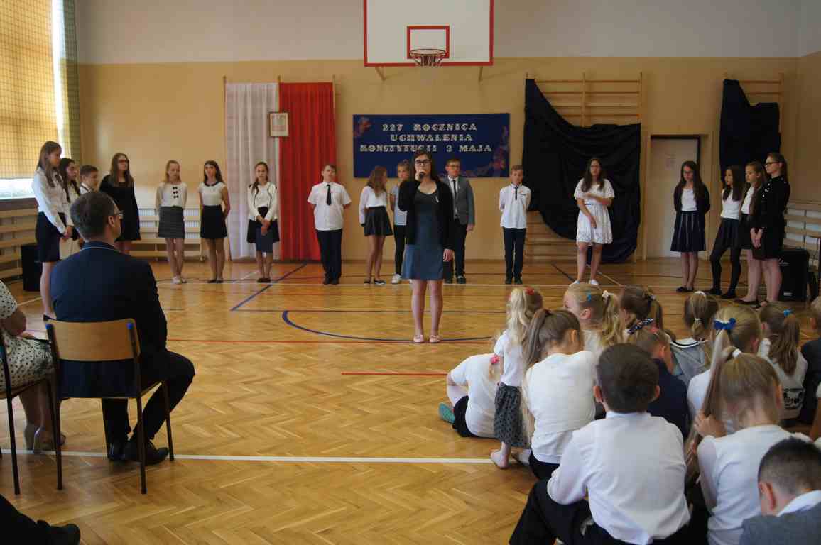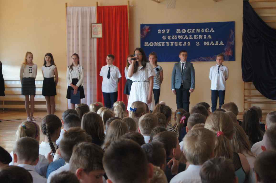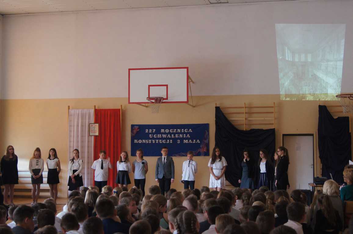 Uroczysty apel z tej okazji przygotowali uczniowie klasy VI, VII i oddziałów gimnazjalnych pod opieką pani Lucji Kołaczyńskiej. Występujący w ciekawy sposób przybliżyli główne założenia Konstytucji 3 Maja oraz historię jej powstania. Uroczysty nastrój podkreślały recytowane fragmenty poezji, a także piękne pieśni patriotyczne, wśród których gromkie brawa otrzymały „Polskie skrzydła” brawurowo wykonane przez uczennicę klasy III OG, Martynę Nowak. Zebrani mieli również okazję  obejrzeć prezentację slajdów z obrazami  najważniejszych wydarzeń z dziejów naszego narodu.
