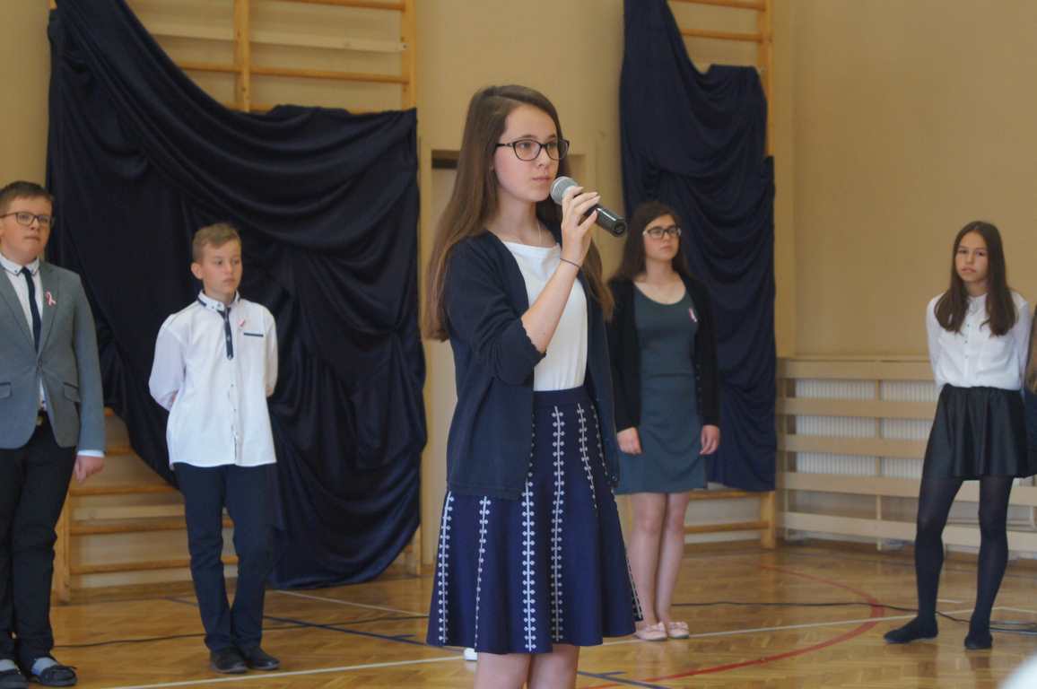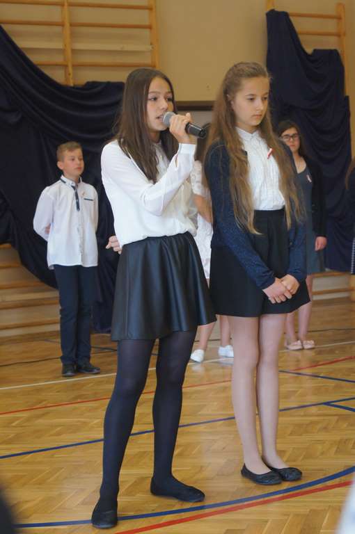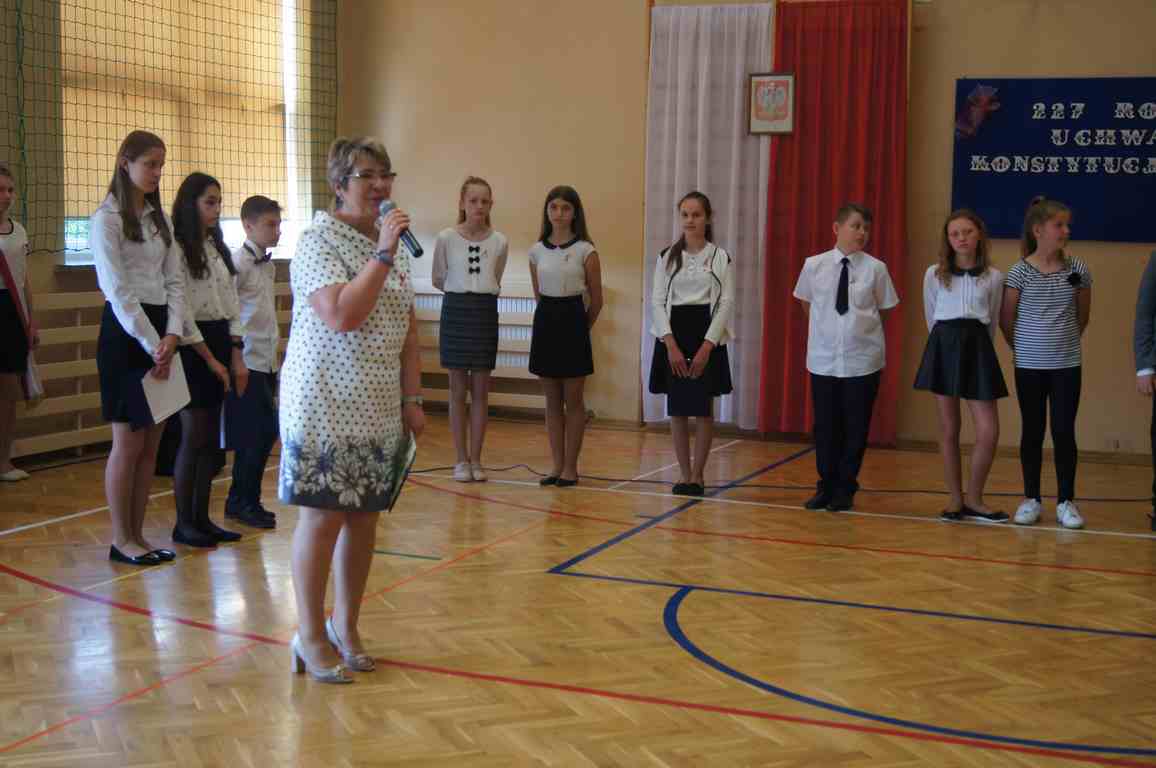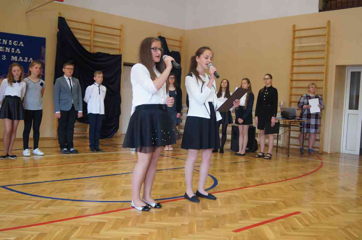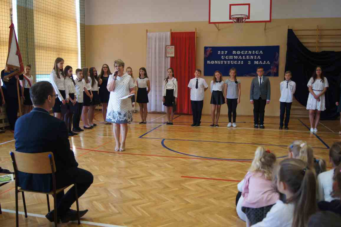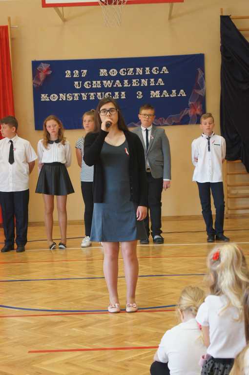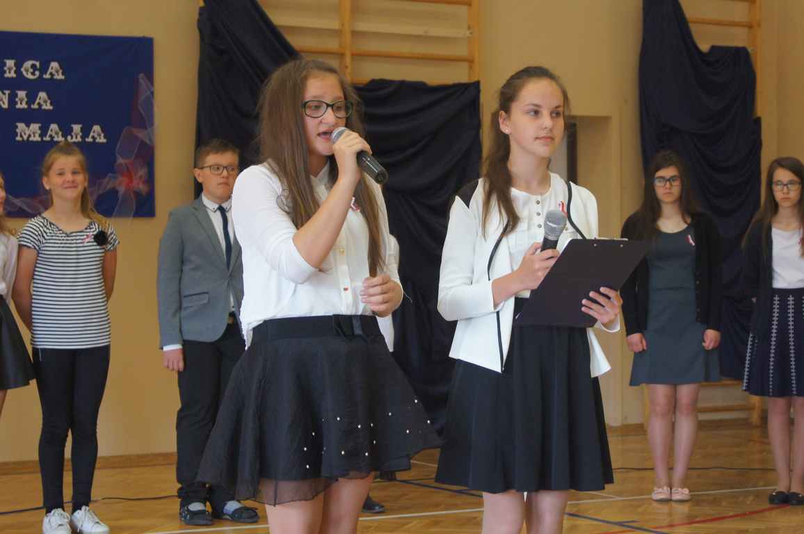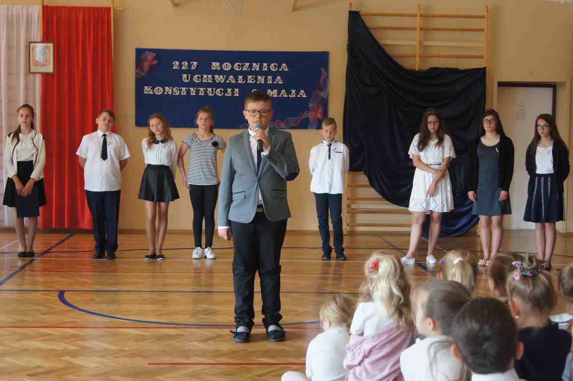 Uroczysty apel z tej okazji przygotowali uczniowie klasy VI, VII i oddziałów gimnazjalnych pod opieką pani Lucji Kołaczyńskiej. Występujący w ciekawy sposób przybliżyli główne założenia Konstytucji 3 Maja oraz historię jej powstania. Uroczysty nastrój podkreślały recytowane fragmenty poezji, a także piękne pieśni patriotyczne, wśród których gromkie brawa otrzymały „Polskie skrzydła” brawurowo wykonane przez uczennicę klasy III OG, Martynę Nowak. Zebrani mieli również okazję  obejrzeć prezentację slajdów z obrazami  najważniejszych wydarzeń z dziejów naszego narodu.